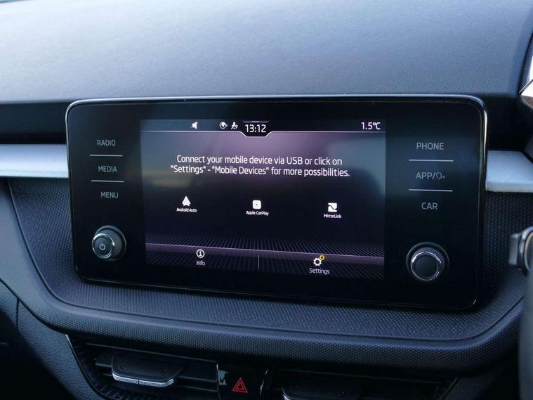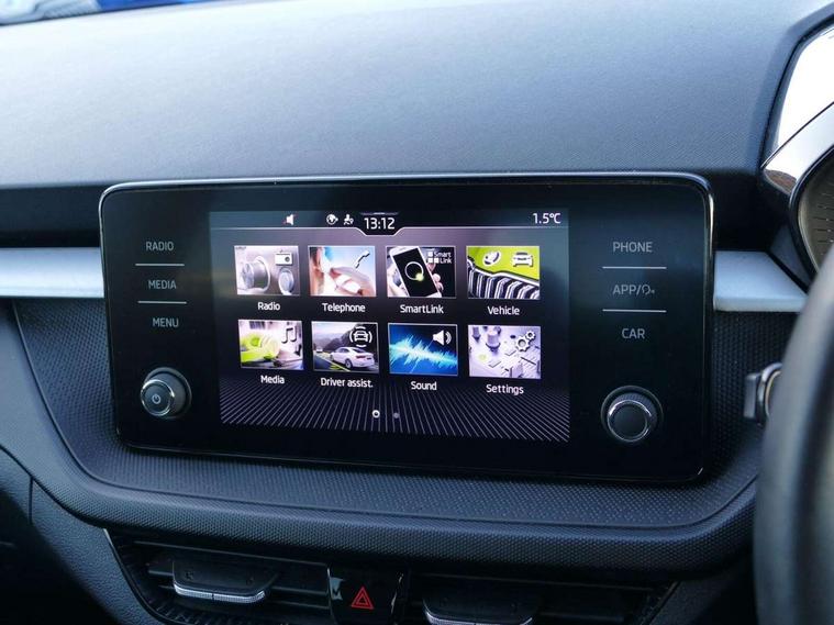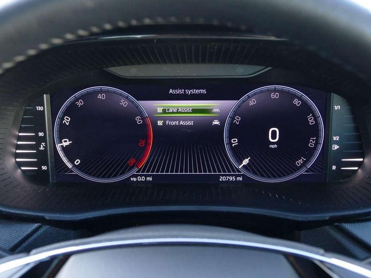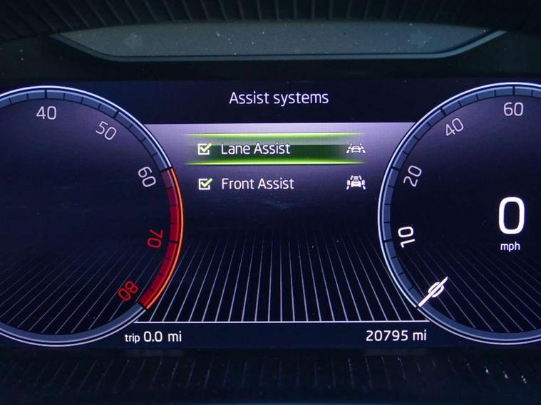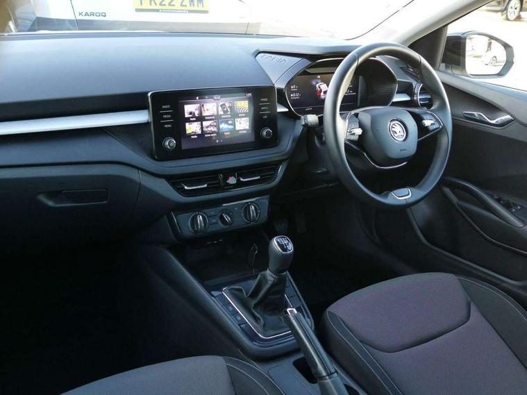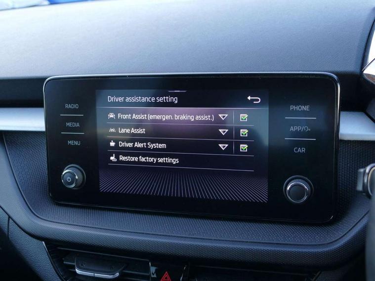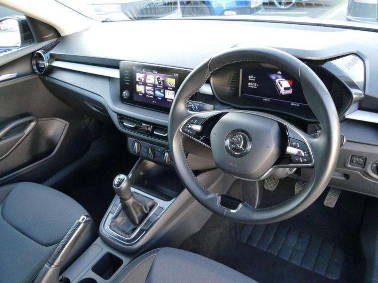 Bluetooth connection, Driver alert system - DAS, Electromechanical power steering, Exterior temperature gauge, Lane assist including road edge detection, Service interval indicator, Virtual cockpit with 10.25" colour display, 2x USB-C in the front (for data transmission and charging), 6 Speakers (4 in front and 2 in rear), Auxiliary socket for external MP3 player, Bolero radio with 8" colour display, DAB digital radio reception, Basic rear lights, Body coloured bumpers, Dimming rear view mirror with black frame, Door mirror integrated indicators, Electrically adjustable and heated door mirrors, Electrically adjustable front windows with function auto up/down, Front window wiper intermittent control, Headlight range control - Automatic, Ice scraper in fuel cap, LED daytime running lights with coming and leaving home feature, Mechanical adjustable rear windows, Privacy glass, Rear LED fog light, Rear side wing doors, Rear window wiper with washing nozzles, Roof colour door mirrors, Roof mounted spoiler, SKODA tailgate lettering in chrome, Third brake light, 3 rear headrests, Backrest split and folding, Central console with fixed cup holder and storage box, Chrome handbrake release button, Fabric upholstery, Gearshift knob/handle in leather, Grain satin black interior door handles, Hand brake lever handle in leather, Height adjustable front headrests, Height adjustable steering wheel, ISOFIX and TopTether anchorage points to the outer rear seats, ISOFIX and TopTether on the front passenger seat, Luggage compartment lighting, Pollen filter, Rear seat bench unsplit, Single front passenger seat, Storm grey headlining, Sun visors with mirror and airbag label on passenger side, Ticket holder, Umbrella in drivers door, 3-point height adjustable front seats belts with pretensioner and force limiter, Automatic warning lights in case of crash, Driver and passengers airbag with switch off function, e-Call+, ESC including ABS, MSR, ASR, EDS, HBA and XDS, Front and rear seat belt warning, FRONT ASSIST (AEB City and AEB Inter Urban), Front side airbags, Head airbags, One tone horn, Pedestrian protection, Three rear 3-points safety seat belts with pretensioner and force limiter including stop function for outer rear seat belts, Tyre pressure monitoring system, Anti-theft alarm system including immobiliser, interior monitoring, backup horn, and towing protection, Anodized cross line upper decorative trim, Colour Edition air vents, Grain satin black central console cover, Grain satin black lower decorative trim, Satin black door and side trim panel in front, Anti-theft wheel bolts protection, Super-low rolling resistance tyres,