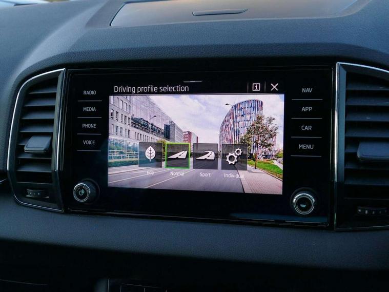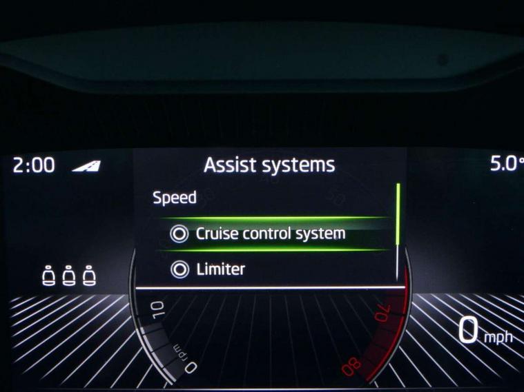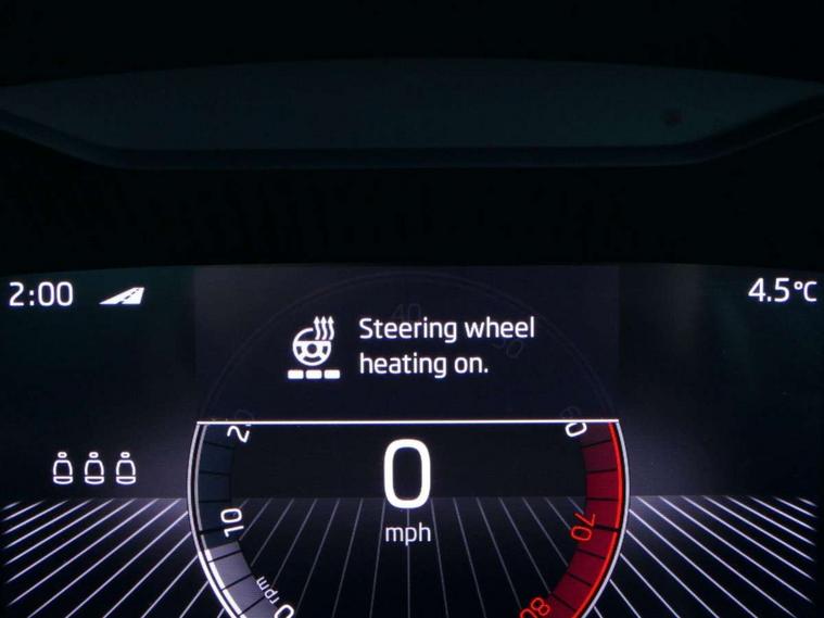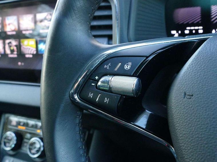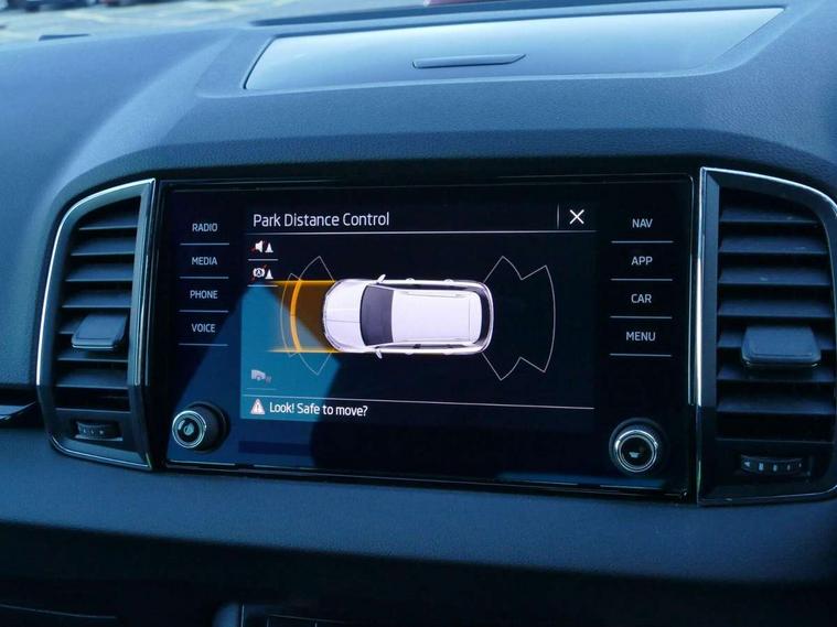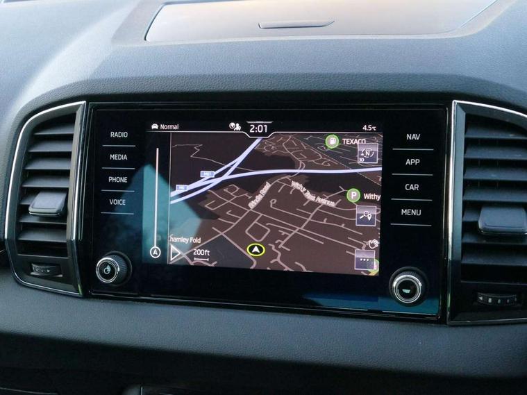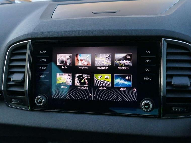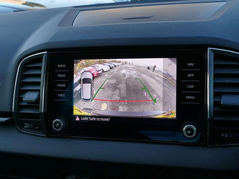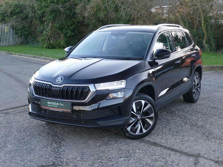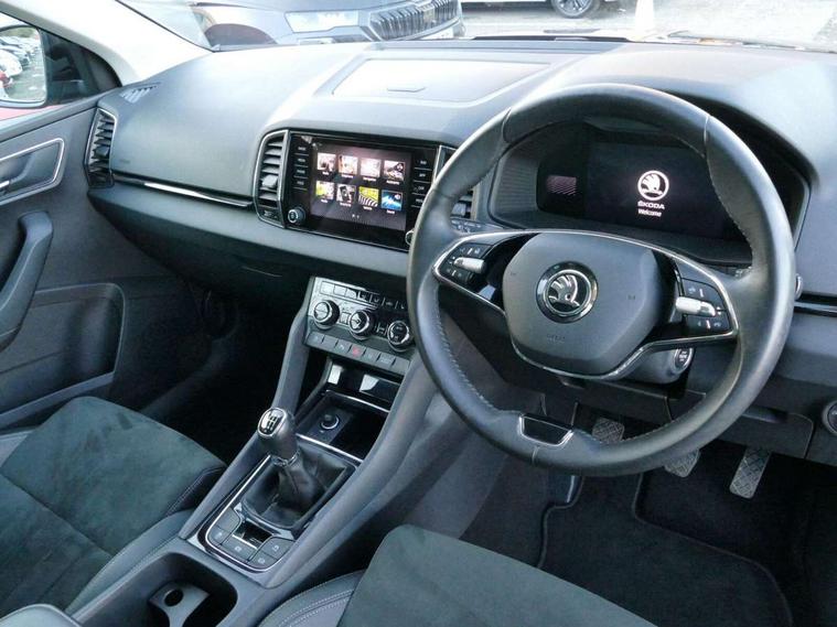 8" Digital display, Care connect, Driver fatigue sensor, Emergency services call system, Outside temperature gauge, Service interval indicator, SmartLink wireless for Apple and wired for Android, Start/stop system with regenerative braking, USB C Port x 2 in front centre console, 8 Speakers, DAB radio with Bluetooth, USB connection, Acoustic glass, Aero front windscreen wipers with intermittent function, Auto dimming rear view mirror with light and rain sensors, Black electric window control buttons, Body colour door mirrors and handles, Dynamic headlight range control with cornering light function, Electric front and rear windows with child proof lock, Heated rear windscreen, LED daytime running lights, LED rear lights with high functionality welcome effect and dynamic indicators, Light assistant (coming/leaving home/tunnel light), Plastic scuff plates, Privacy glass, Rear side wing doors, Rear spoiler, Rear window wiper with washer system and intermittent control, Safety reflectors on front doors, 1.5 litre bottle holders in driver and front passenger door panels, 12V socket in boot, 12v socket in front centre armrest with storage compartment and rear air vents, 2 spoke leather heated multifunction steering wheel, 2 x Tablet holder, 3 rear height adjustable headrests, 3 seat bench in 2nd row, 4 foldable roof handles with rear coat hooks, Black floor carpet, Chrome inner door handles, Double sided boot floor, Foldable hooks in the boot, Front head restraints, Height adjustable front three point seats belts with tensioners, Height/reach adjust steering wheel, Ice scraper, Illuminated glovebox, Illuminated luggage compartment, Isofix child seat preparation for front passenger seat, Isofix child seat preparation outer rear, Manual lumbar support for front seats, Pen holder, Pollen filter, Rear boot cover, Rear reading lights, Rubbish bin door, Safety vest holder, Single front passenger seat, Storage box in upper central dashboard closed, Sunvisors with illuminated vanity mirrors, Textile floor mats, Ticket holder, VarioFlex seats with standard rear seat release, Boot pack - Karoq, Design Pack - Karoq, Parking pack - Karoq, Automatic door unlocking in case of crash, Automatic fuel cut off in case of crash, Child locks on rear doors, Driver airbag, Electronic parking brake with auto hold function, Emergency rear braking signal, ESC including ABS, MSR, ASR, EDS, HBA, DSR, RBS, MKB and traction control, Front side airbags, Hill hold control, Knee airbags, Passenger airbag with switch-off function, Pedestrian monitor, Seatbelt reminder signalisation and pretensioner for all seats, Three point seatbelts rear, Two tone horn, Tyre pressure display, Tyre pressure monitor, Alarm with interior monitoring, back up horn and tilt sensor with safe function, Electronic engine immobiliser, Keyless entry and start/stop, Remote central locking with 2 remote folding keys, Chrome framed air vents, 18" Miran alloy wheels in black, Anti-theft wheel bolts protection, Tool kit,