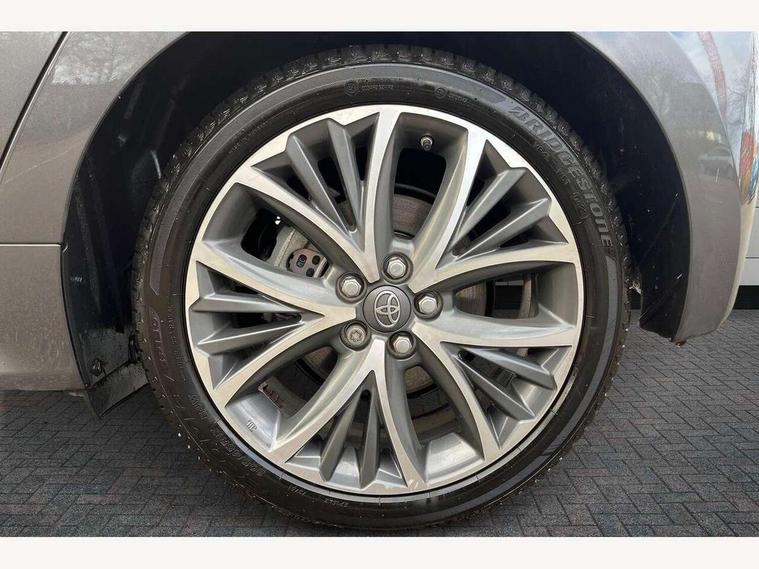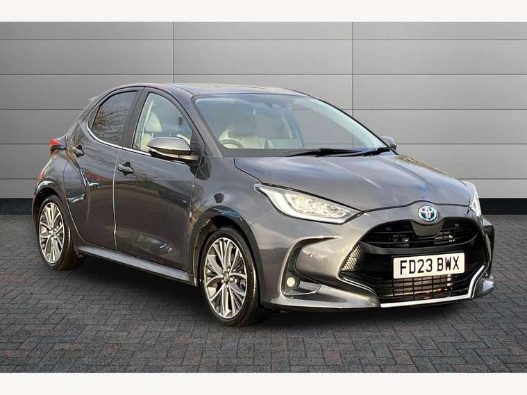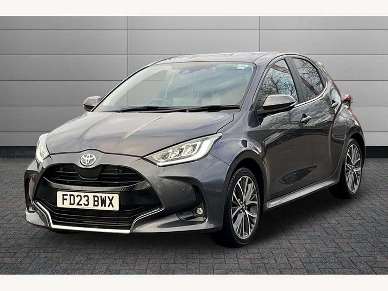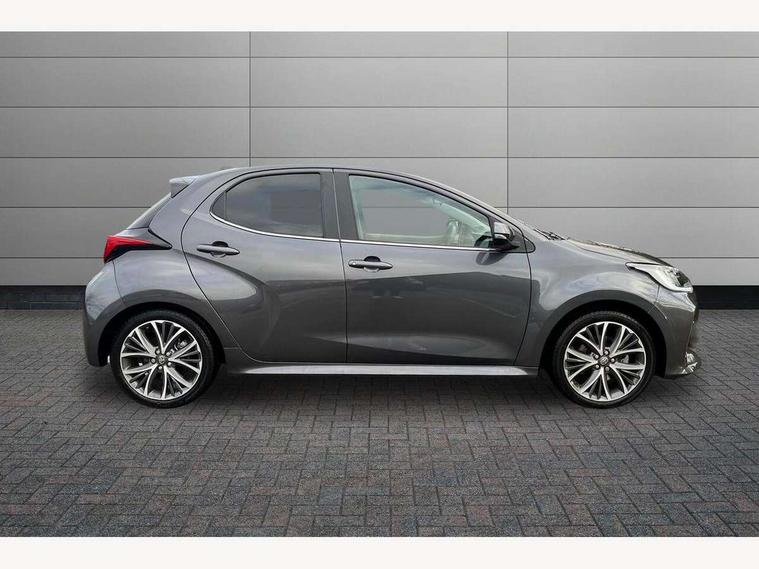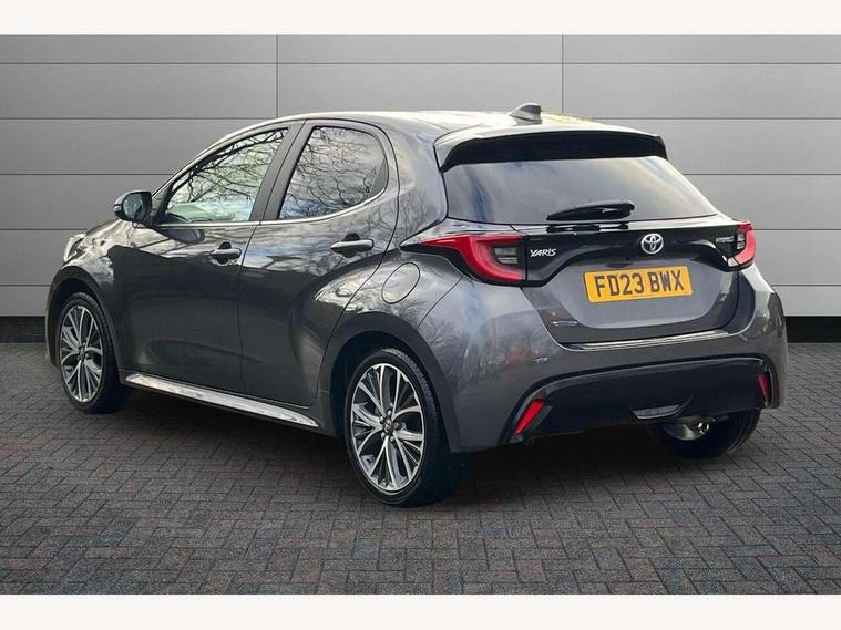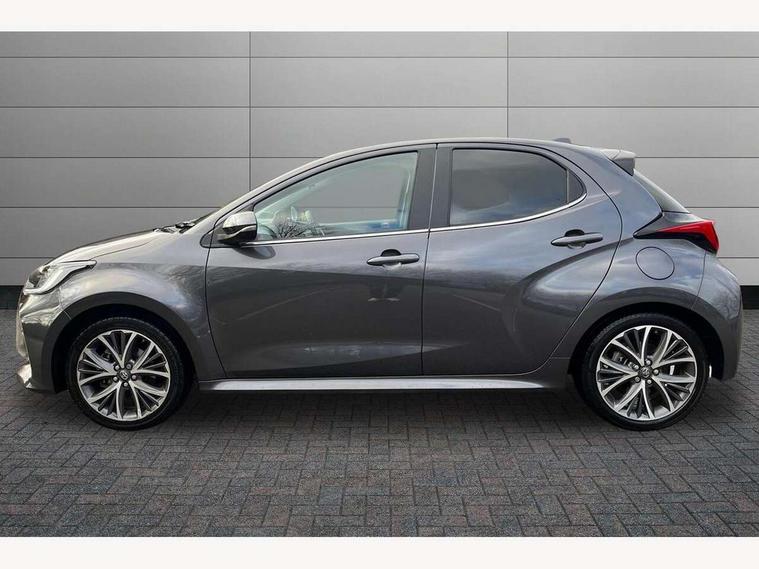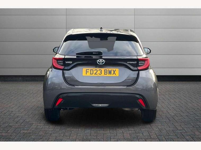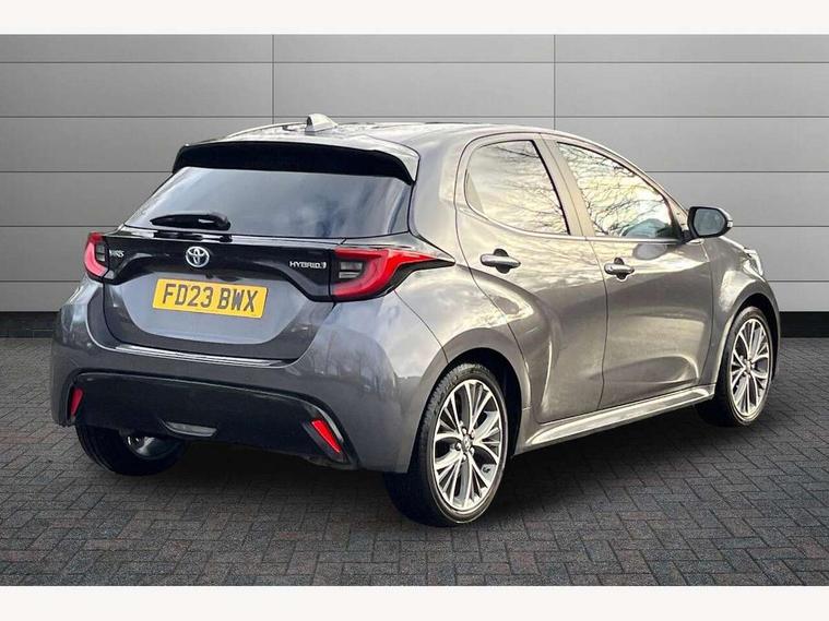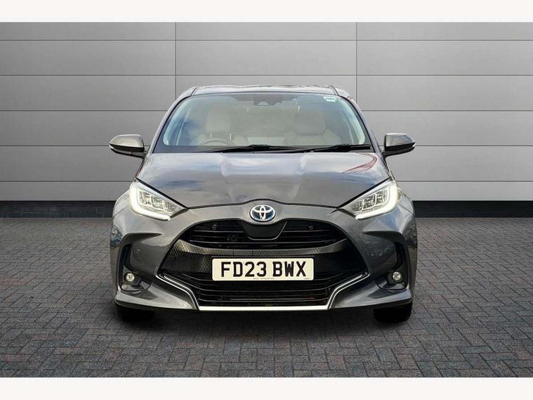 Adaptive cruise control, Adjustable speed limit with speed warning, Blind spot monitoring, Bluetooth connectivity, Colour binocular inspired displays with digital speedometer, E-call, Electric power steering, Hybrid energy display, Multi information display switches on steering wheel, Reversing camera, Smartphone integration with Apple CarPlay and Android auto, Tailgate, Touch 2 navigation system, Voice recognition, Vehicle Stability Control (VSC), 6 speakers, 9" HD multimedia display touch screen with Toyota smart connect, USB connection, Acoustic windscreen glass, Auto windscreen wipers, Automatic headlights, Automatically retractable door mirrors, Body coloured door mirrors, Electric adjustable heated door mirrors, Follow me home headlights, Front auto power windows with anti jam protection, Full LED rear lights, LED daytime running lights, LED front fog lights, LED front light guide, LED Headlights, LED High mounted stop lamp, LED Indicators, LED rear light guide, Manual headlight levelling, Painted chequered front grille, Rain sensor, Rear auto power windows with anti jam protection, Rear privacy glass, Rear side wing doors, Rear spoiler, Rear wiper, Satin lower front grille, Shark fin antenna, Turning signal integrated indicators in door mirrors, Variable front intermittent wipers, 3 adjustable rear headrests, 3 seat bench in 2nd row, 3 spoke leather steering wheel, 60/40 split folding rear seat, Active headrests, Adjustable boot height, Coat hooks in rear grab handles, Cup holders (2 front & door), Data Communication Module (DCM) connected services, Dual zone automatic air conditioning, Fabric seat with partial synthetic leather upholstery, Front armrest, Front sport seats, Glovebox, Grey roof lining, Height adjustable driver's seat, Height adjustable passenger seat, Isofix seat fixing, Leather gearshift, Map pockets on the backs of the front seats, Pollen filter, Shopping bag hooks, Single front passenger seat, Tilt/telescopic steering column, Parking pack - Yaris, 3 point seatbelts on all rear seats, ABS+EBD+Brake assist, Electronic parking brake, Emergency brake light system (EBS), Front passenger airbag on/off switch, Front seatbelt reminder, Hill start assist control (HAC), Rear child proof door locks, Rear seat belt reminder, Supplemental Restraint System (SRS) 8 airbags: Driver & passenger's airbags, dual side curtain airbags, side impact airbags, front centre airbag, Toyota Safety Sense 2, Precollison + Night time Pedestrian & Cyclist Detection, Lane Trace Assist, Auto High Beam, Intelligent ACC & Road Sign Assist, Tyre pressure warning system, 2x Master key, Alarm/immobiliser, Keyless smart entry with push button start, Remote AC via MyT, Remote locking via MyT, Remote powered central double locking doors, Satin chrome interior styling, Soft touch instrument panel, Space saver spare wheel,