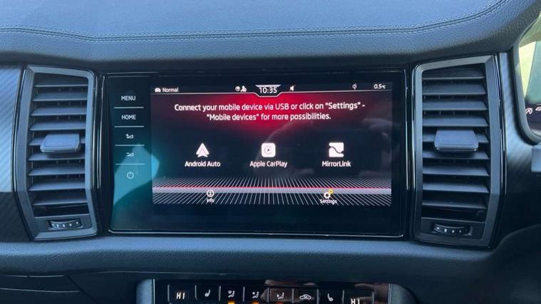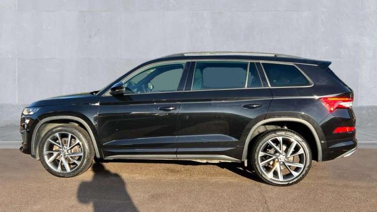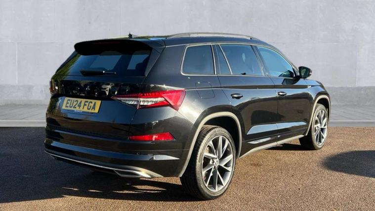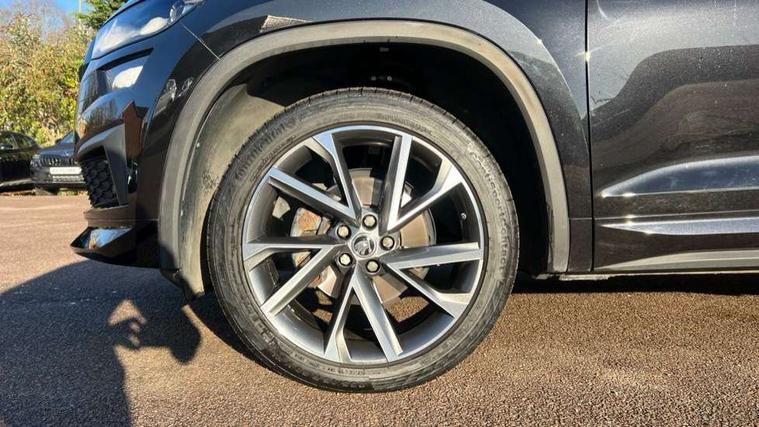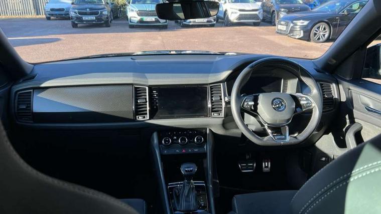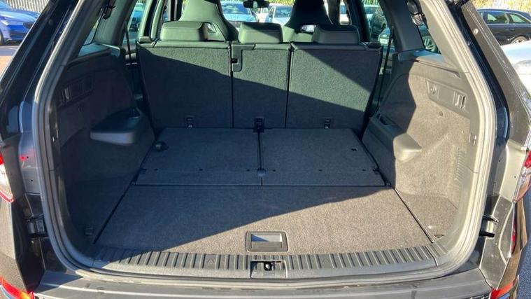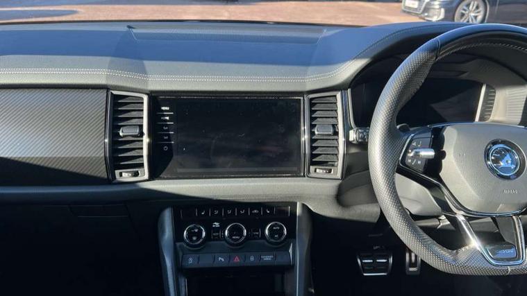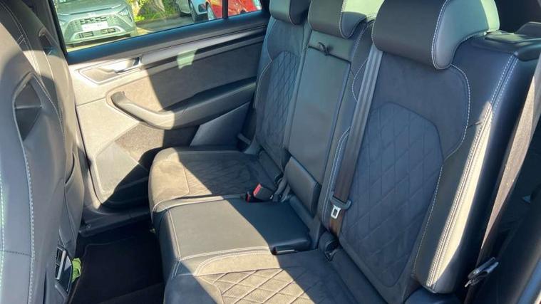 Bluetooth system, Columbus satellite navigation with 9.2" touchscreen, integrated Wi-Fi, web radio, Digital voice enhancement, e call+, ECO Stop/start function, Exterior temperature indicator, Progressive steering, Rear view camera, Smartlink wireless for apple carplay and wired for android auto, Speed limiter, Tailgate unlocking from outside, USB C Port x 2 in front centre console, Virtual Cockpit - 10.25" digital display with additional sports design, Wireless charging, 8 Speakers, DAB Digital radio, Aero front windscreen wipers with intermittent function, Aero rear window wiper, Auto dimming rear view mirror, Black roof rails, Black sports styling including front grille and window surrounds, Black wheel arch surrounds, Body colour bumpers, Body colour door handles, Electric adjustable/heated/folding door mirrors, driver side auto dimming with boarding sports and memory function, Electric front and rear windows, Extended rear spoiler with finlets in gloss black, Front fog lights, Full LED matrix headlights with AFS (adaptive front light system), cornering function and AWL (all weather lighting system), Gloss black door mirrors, Headlight washers, Heated rear window, Invisible tailpipe, LED daytime running lights, LED rear fog light, LED third brake light in rear spoiler, Light assistant (coming/leaving home/tunnel light), Off-road style lower front bumper element, Privacy glass, Rain and light sensors, Rear diffuser, Rear LED lights (high functionality) with welcome effect and dynamic indicators, Rear side wing doors, Safety reflectors on front and rear doors, Sportline badge on front fender, Sports front and rear bumpers including lower rear chrome strip, Tailgate lettering in Black, Window control switches with black trim, 12V socket in boot, 2 rails with 2 hooks, 2 seat bench in 3rd row, 3 seat bench in 2nd row, 3 spoke leather multifunction sports steering wheel with DSG paddles, 4 foldable roof handles with rear coat hooks, 60:40 foldable rear seat with sliding adjustment and backrest angle adjustment, Aluminium pedals, Black roof headlining, Bottle holders in door panel in the 1.5 litre front and 1 litre rear, Cargo storage compartments, Chrome headlight control button, Chrome interior door handles, Coat hooks on B pillar, Covered storage compartment on driver side, Decorative door sill covers, Front and rear door armrest with black adductor trim, Front centre armrest with storage compartment, cup holder and 12V socket, Front courtesy lights, Gear shift lever with chrome frame and black gloss insert, Grey stitching in front and rear armrests and door armrests + door inserts, Height adjustable front headrests, Illuminated glovebox, Illuminated luggage compartment, Isofix child seat fittings in outer rear seats with top tether, Manually adjustable steering column, Microsuede door panels, Net programme in boot (1x horizontal Net, 2x vertical Nets), Overhead glasses storage compartment, Pollen filter, Rear centre armrest with cupholders, Single front passenger seat, Sliding trunk cover, Small Bags on the inner sides of the front backrests, Sports seats, Sunvisors with illuminated vanity mirrors, Three rear height adjustable headrests, Ticket holder on A Pillar, Umbrella in door panel, Variable boot floor, LED Interior light pack - Kodiaq, Auto door release and activation of warning lights in the event of an accident, Driver and front passenger airbag with knee airbag and front passenger airbag deactivation, Electronic parking brake with hill start assist, Emergency rear braking signal, ESC (incl. ABS+MSR+ASR+EDS+HBA+DSR+RBS+MKB), Front assist with autonomous emergency braking, Front side airbags with curtain airbags, Fuel cut off safety device, Height adjustable front 3 point seatbelts + pretensioners, Hill hold control, Rear disc brakes, Safety vest holder in door, Seat belt reminder for all seats, Three point rear seat belts, Two tone horn, Tyre pressure monitor, Alarm with interior monitoring and tilt sensor with safe function, Anti-theft wheel bolts, Immobiliser, Keyless entry and start system (KESSY), Remote central locking with 2 keys, Black air vent surround, Carbon finish dashboard and door inserts, Grey stitching in dashboard, 20" Vega Anthracite alloy wheels, Temporary spare wheel (space saver),