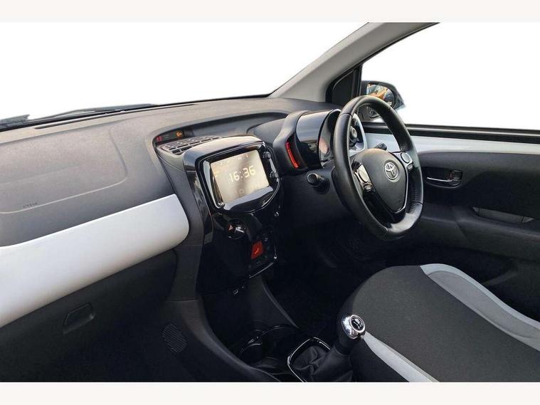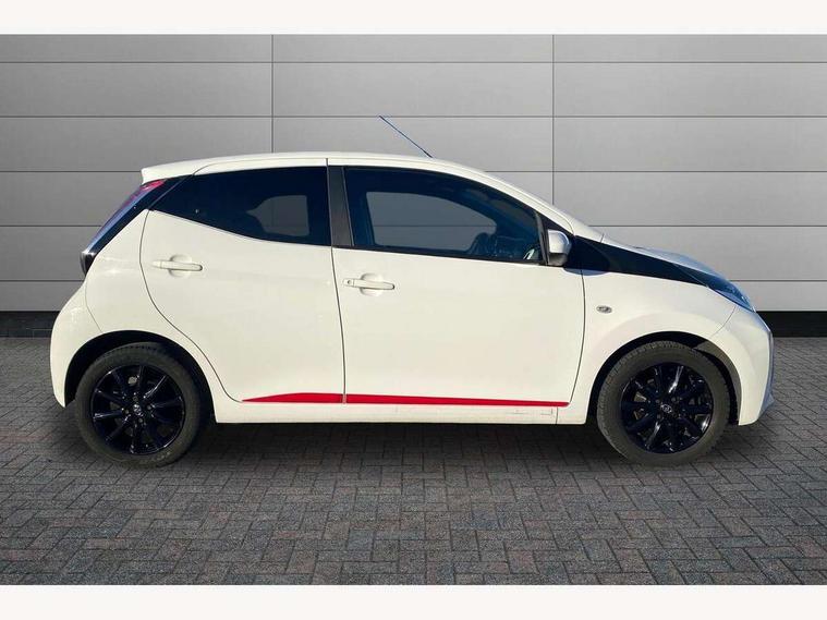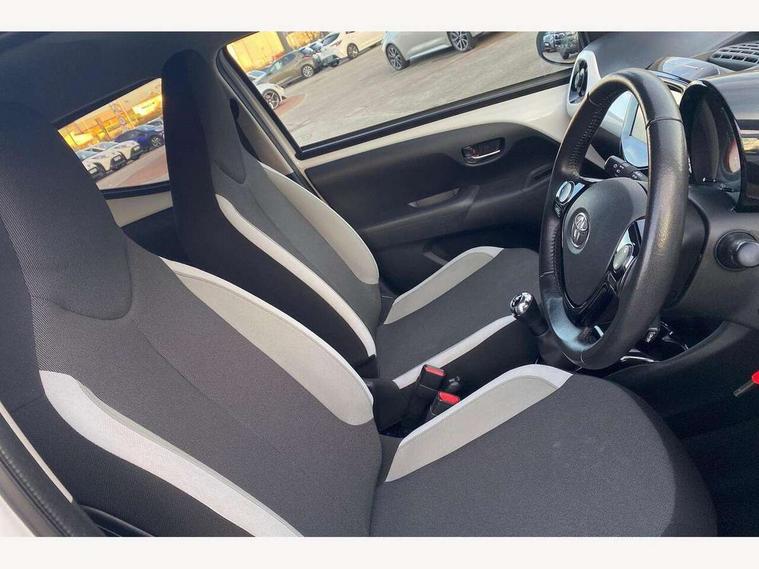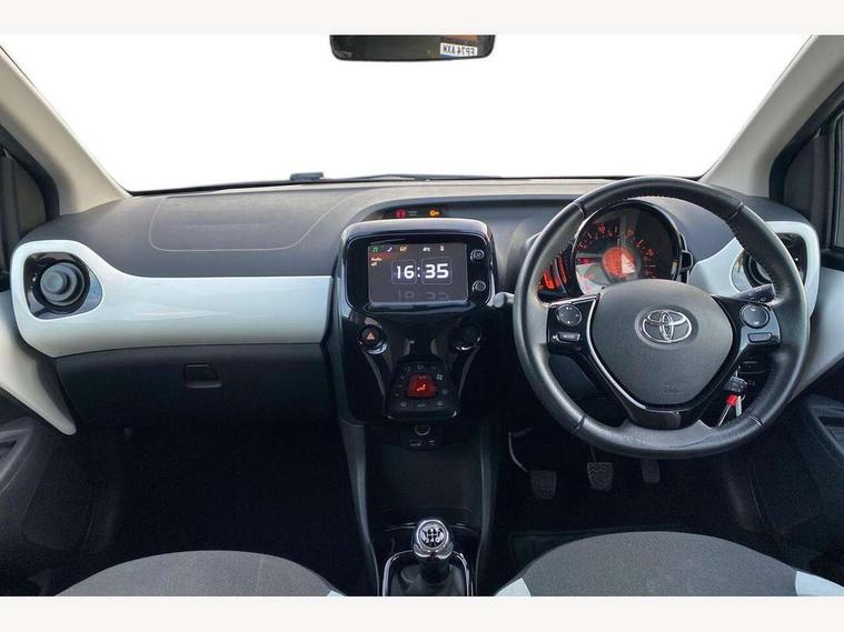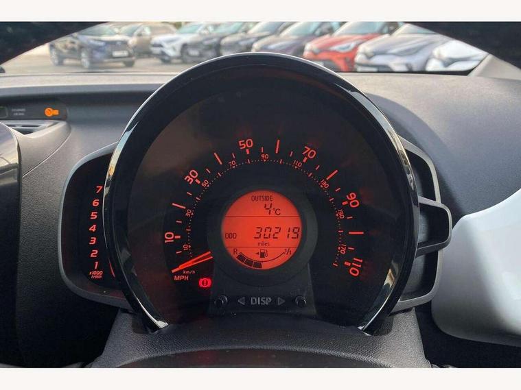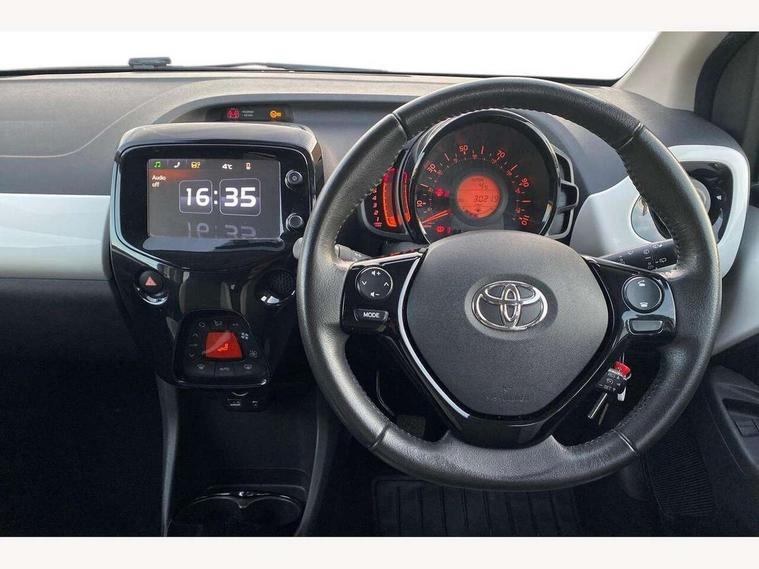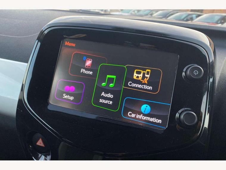 7" touch screen, Bluetooth system, Digital clock, Electric power steering, Fuel indicator with low level warning, Lights on warning, MirrorLink, Rear view camera, Speed limiter, Tachometer, Vehicle Stability Control (VSC), 4 speakers, Auxiliary input socket, DAB Digital radio, Multimedia System, Stereo radio, USB connection, 2 speed wipers/variable intermittent/mist function, Automatic headlights, Body colour bumpers, Body colour door handles, Body colour door mirrors, Electric adjustable door mirrors, Electric front windows, Front fog lights, Green tinted glass, Headlamp levelling, Heated door mirrors, Heated rear windscreen, LED daytime running lights, Privacy glass, Rear spoiler, Rear window demister, Rear wiper, Red front bumper accent, Red roof decal, Red side sills, Roof mounted aerial, 12V Accessory socket, 3 spoke leather steering wheel, 50/50 split folding rear seat, Air recirculation system, Auto air conditioning, Body colour instrument panel, Centre console storage, Chrome insert to gearknob, Chrome interior door handles, Driver and passenger sunvisors, Driver's seat height adjuster, Driver/passenger seat recline/slide adjust, Driver/passenger vanity mirrors with covers, Front and rear door pockets, Front cupholder, Front map reading lights, Front sports seats, Gleam cloth upholstery, Glossy black gear shift surround, Glovebox, Height adjustable front head restraints, Isofix system on outer rear seats, Leather gear knob, Pollen filter, Rear cupholders, Rear headrests, Steering wheel mounted radio/phone controls, Stepless tilt adjustable steering column, Storage bins on all doors, Tonneau cover, Outburst pack red pop - Aygo, ABS, Driver and passenger airbags, ESP, Fasten seatbelt reminder, Front side airbags, Height adjustable front seatbelts with pre-tensioners and load limiters, Hill start assist, Passenger airbag deactivate switch, Rear child proof door locks, Side curtain airbags, Tyre pressure warning, Engine immobiliser, Lockable fuel cap, Remote central locking, Body colour dashboard, Gloss black air vent surround, Gloss black centre console, Tyre repair kit,