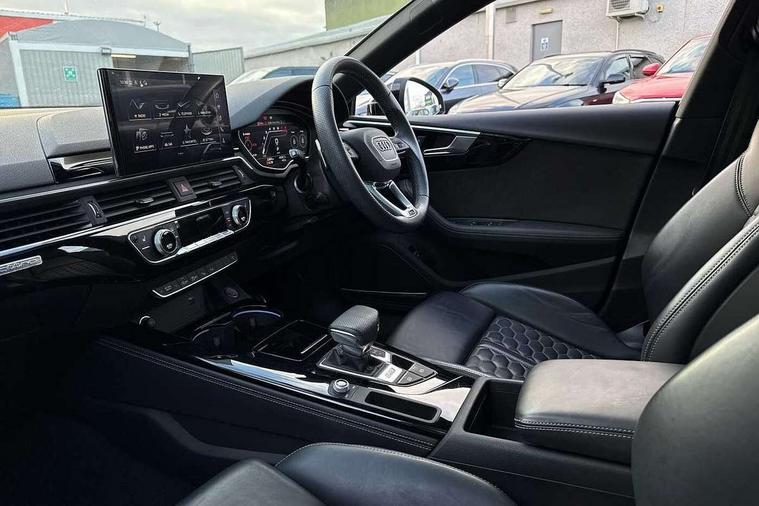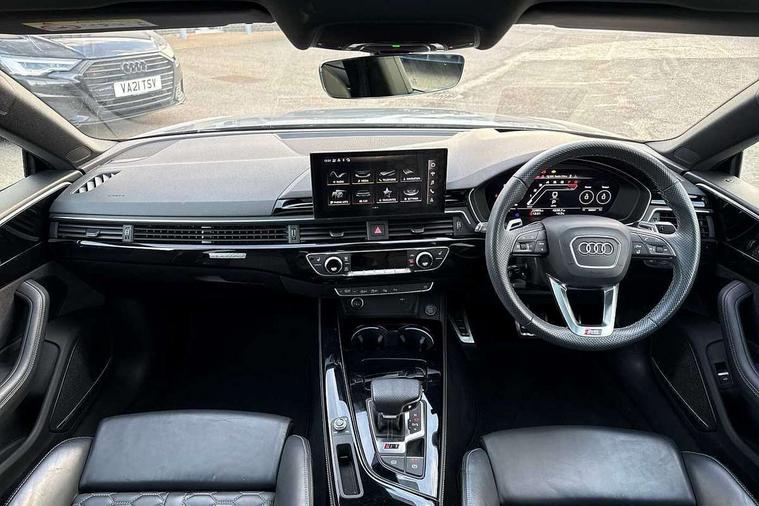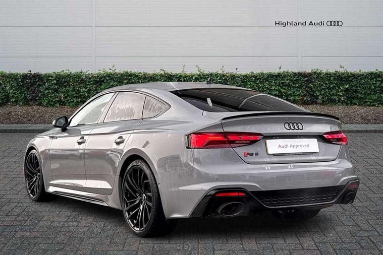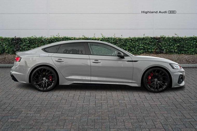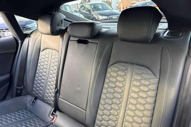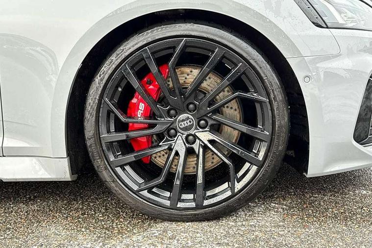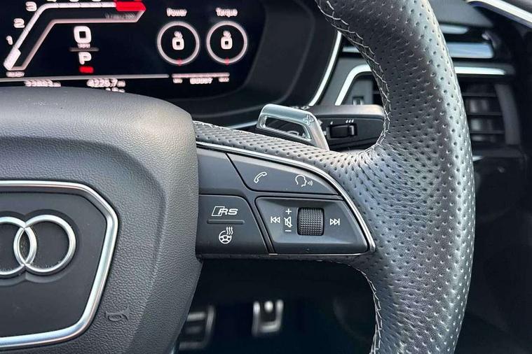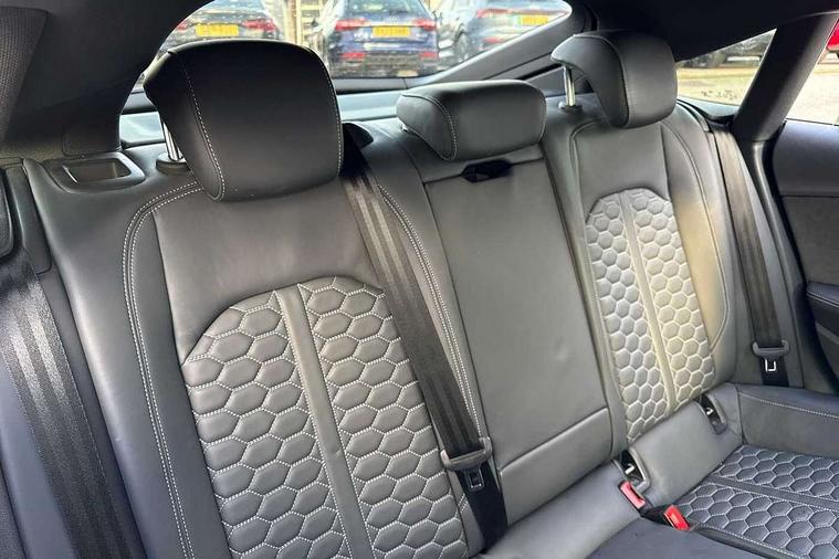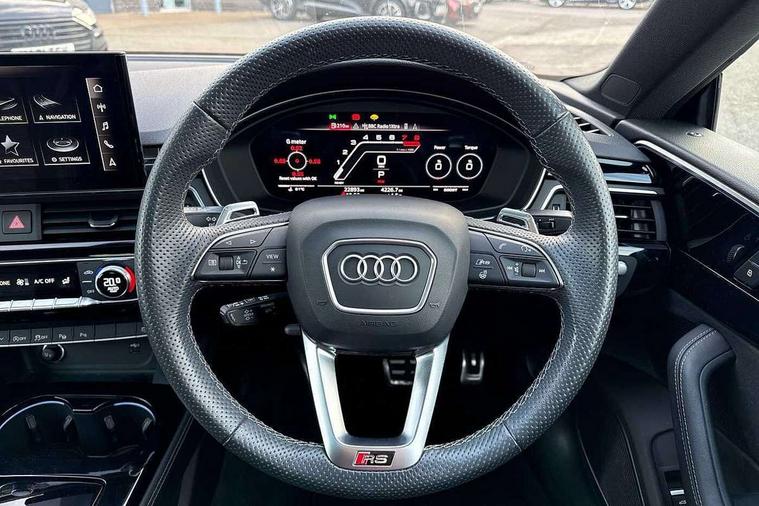360 degree camera, Advanced key with electric hands free boot opening system, Audi connect safety and service (e-call), Audi connect with Amazon Alexa Integration, Audi parking system plus + park assist with front and rear sensors, Audi side assist, Audi smartphone interface, Audi Virtual Cockpit with RS specific design and 12.3" display, Automatic start-stop system with coasting functionality and efficiency programme, Bluetooth interface, Dynamic steering, Email, calendar and text messages displayed via MMI, Head up Display, MMI Navigation plus with MMI touch includes 10.1" high resolution colour MMI display, 3D map, RS Audi drive select, RS drive modes on steering wheel, Service interval indicator, Voice control system, Increased top speed to 174mph, Quattro sports differential, RS sport suspension plus with dynamic ride control, 2 x USB charging port with aux input socket, Bang + Olufsen 3D sound system, DAB digital radio reception, Audi Beam uses LEDs to project the RS logo, Audi rings and lettering glossy black, Auto dimming rear view mirror, Body colour door handles, Electric front windows, Electric rear windows, Electrically folding, adjustable and heated door mirrors with integrated LED side indicators and kerb view function for passenger side, Exterior mirror housing in high gloss black, High beam assistant, Larger singleframe grill, LED daytime running lights, Matrix LED headlights with Audi laser light, dynamic light sequencing and dynamic indicator, Panoramic glass sunroof, Privacy glass with rear acoustic glazing, Rain and light sensors, RS bumper with quattro lettering, RS sport exhaust system, RS5 badges on grille, the front wing panels and rear, RS5 dual branch chrome tailpipes with left and right oval pipes, Windscreen with acoustic glazing, 3 spoke leather heated multi-function plus steering wheel with RS badging, 40/20/40 split folding 3 seater rear bench seat, Aluminium shift paddles, Black cloth headlining, Deluxe 3 zone electronic climate control, Electrically adjustable front seats, Fine Nappa leather upholstery, Front centre armrest, Front head restraints, Front/rear floor mats, Heated front and outer rear seats, Illuminated door sill trims with RS5 logo, ISOFIX child seat mounting and top tether, Leather door armrests and knee pad, Pneumatic massage function, Rear head restraints, RS Specific perforated leather gear lever knob with contrast stitching, RS Super Sports seats with contrast honeycomb stitching, Stainless steel pedals, Black styling pack - RS5, Driver Assistance Pack - Tour - RS5, Extended LED Interior multi-coloured lighting pack - A5/RS5, 3x3 point rear seatbelts, 6 airbags - Driver, front passenger, curtain and side airbags, Child locks on rear doors, Electromechanical parking brake, Electronic Stabilisation Control (ESC) including ABS, ASR and EDL, Front passenger airbag deactivation, Height adjustable front seatbelts, Hill hold assist, Multi collision brake assist, Pop-up bonnet for pedestrian protection, Pre sense city, RS Model enhanced braking system, Seatbelt monitoring, Tyre pressure warning, Warning triangle and first aid kit, Anti theft alarm system, Anti theft wheel bolts, Immobiliser, Keyless Go, Remote control key with RS emblem, Piano black finish inlay, 20" 5 Segment spoke Evo style design audi sport alloy wheels in matt titanium look high sheen finish, Tool kit, Tyre repair kit,