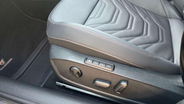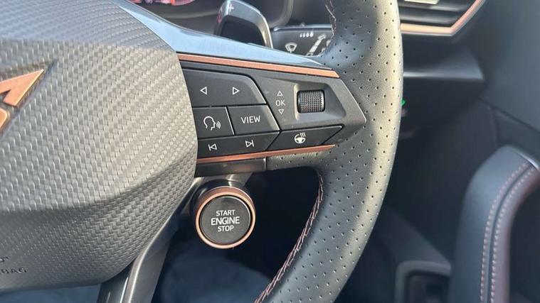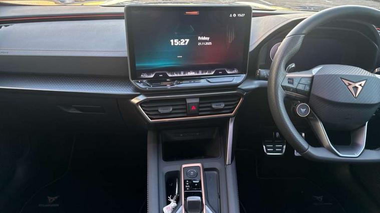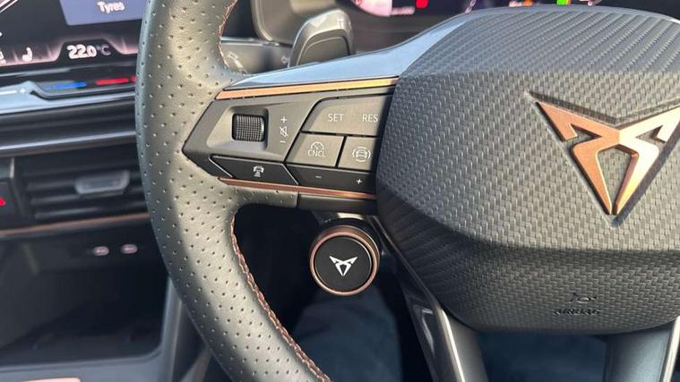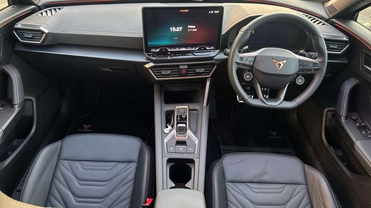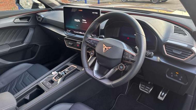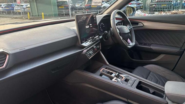 10.25" digital cockpit and configurable dashboard, Adaptive cruise control with follow-to-stop and speed limiter, Advanced driver alert system, Advanced lane assist with semi-automatic vehicle control in a medical emergency and traffic jam assist, Dynamic chassis control with driving profile selection (Comfort, Sport, CUPRA, Individual), Dynamic road sign display, Emergency steering support with turn assist, Forward collision warning with automatic braking, Full link phone integration, Intelligent park assist, RPM, trip computer, outside temp gauge, instrument light brightness, low fuel warning light, lights on reminder, gearshift indicator, Service interval indicator, Side and exit assist, Speed sensitive power steering, Start/stop system with regenerative braking, Top view camera, Virtual pedal and electric tailgate, Voice control system, Wired Android Auto, Wireless apple carplay, Wireless phone charger, Adaptive chassis control with continuous operation, CUPRA sport suspension, Electronic locking differential and dynamic traction support, 2 front and 2 rear USB type C sockets, Media system with navigation, 12.9" touchscreen display, voice control, DAB, steering wheel mounted controls, Auto dimming rear view mirror, Body colour door handles, Body coloured bumpers, Dark grey wing mirror, Daytime running light with automatic headlight control and coming home feature, Door panel ambient lighting, Dynamic headlight range control, Electric front/rear windows, Electrically adjustable heated and folding door mirrors with memory function, Gloss black roof rails and window surrounds, High beam assist, LED 3rd brake light, LED front fog lamps with cornering function, LED Taillights with dynamic indicator, Matrix LED headlights with multifunction camera, Rain sensing wipers, Rear diffuser with twin exhaust pipe on each side, Rear fog lights, Rear side wing doors, Rear wash/wipe, Tinted rear windows, Welcome lights (within exterior mirror housing), 12V socket, 2 front and 2 rear reading lights, 3 seat bench in 2nd row, 60/40 split rear bench seat with armrest and mechanical seat release, Black headlining, Black interior roof lining, Cupra sports pedals, Dust/pollen filter, Electrically adjustable front seats with lumbar support and memory function, Front and rear head restraints, Front centre armrest, Heated front seats, Heated supersports multifunction leather steering wheel with satellite buttons and gear shift paddles, Height/reach adjust steering wheel, Illuminated aluminium doorsteps, Illuminated interior front door sills, Illuminated sunvisor with mirror, Isofix, Leather dashboard, door insert and side trim panel, LED smart wraparound lighting, PVC/Leather upholstery, Satellite steering wheel, Single front passenger seat, Storage pockets on rear of front seats, Three zone climate control with control panel in rear, Variable luggage/load compartment floor, 3 point seatbelts on all rear seats, ABS, Brake control system - ESC and brake booster, Child proof door locks, Driver and front passenger airbags with front passenger airbag de-activation, Electronic parking brake, Front and rear disc brakes, Front side curtain airbags, Hill hold control, Pre-crash front and rear seat belt tensioner, window closure and hazard lights, Public e-call, Seat belt reminder for front and rear seats, Tyre pressure monitoring system, Anti theft alarm system, KESSY Advanced - Keyless start, keyless entry with SAFELOCK, Locking wheel bolts, Copper and aluminium interior detailing, 19" Artic machined sport black and silver alloy wheels, Breakdown and tool kit,