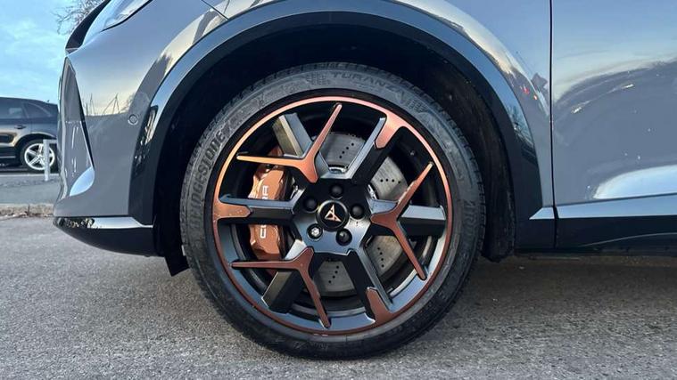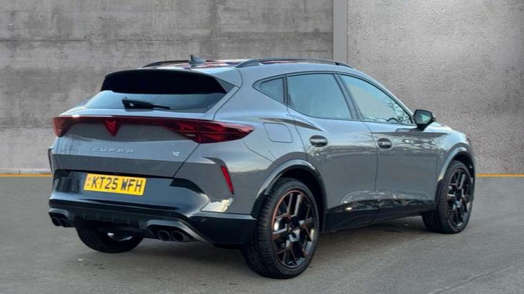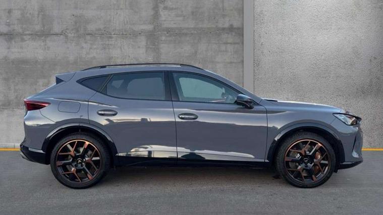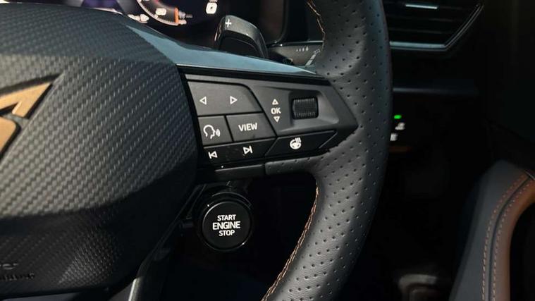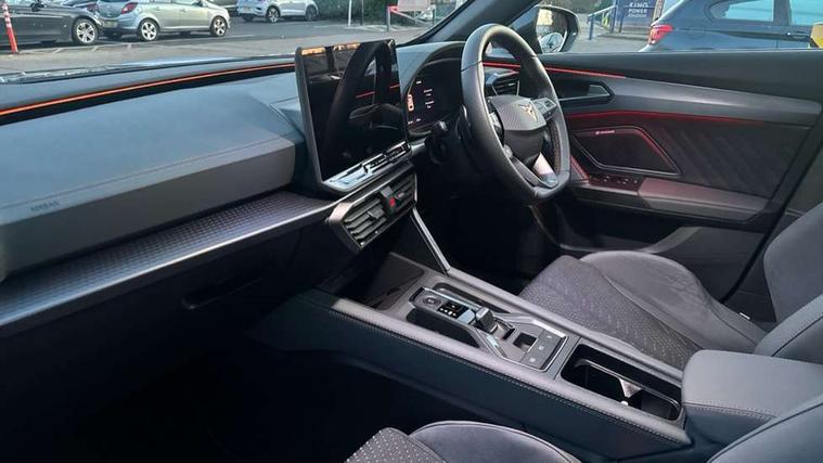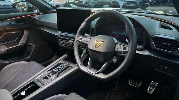 10.25" digital cockpit and configurable dashboard, Adaptive cruise control with follow-to-stop and speed limiter, Advanced lane assist with semi-automatic vehicle control in a medical emergency and traffic jam assist, Driver alert system with driver monitoring, Dynamic chassis control with driving profile selection (Comfort, Sport, CUPRA, Individual), Dynamic road sign display, Emergency steering support with turn assist, Forward collision warning with automatic braking, Front cross traffic assist, Full link phone integration, Intelligent park assist, RPM, trip computer, outside temp gauge, instrument light brightness, low fuel warning light, lights on reminder, gearshift indicator, Service interval indicator, Side and exit assist, Speed sensitive power steering, Start/stop system with regenerative braking, Top view camera, Virtual pedal and electric tailgate, Voice control system, Wired Android Auto, Wireless apple carplay, Wireless phone charger, Adaptive chassis control with continuous operation, CUPRA sport suspension, Electronic locking differential and dynamic traction support, 2 front and 2 rear USB type C sockets, Immersive by Sennheiser TM - 10 speakers, 1 central speaker, 1 subwoofer, Media system with navigation, 12.9" touchscreen display, voice control, DAB, steering wheel mounted controls, Auto dimming rear view mirror, Black roof spoiler, Body colour door handles, Body coloured bumpers, Dark grey wing mirror, Daytime running light with automatic headlight control and coming home feature, Door panel ambient lighting, Dynamic headlight range control, Electric front/rear windows, Electrically adjustable heated and folding door mirrors with memory function, Gloss black roof rails and window surrounds, High beam assist, LED 3rd brake light, LED front fog lamps with cornering function, LED Taillights with dynamic indicator, Matrix Ultra HD headlights, Rain sensing wipers, Rear diffuser with twin exhaust pipe on each side, Rear fog lights, Rear side wing doors, Rear wash/wipe, Side skirts, Tinted rear windows, Welcome lights (within exterior mirror housing), 12V socket, 2 front and 2 rear reading lights, 3 seat bench in 2nd row, 60/40 split rear bench seat with armrest and mechanical seat release, Black headlining, Black interior roof lining, Cupra sports pedals, Dust/pollen filter, Electrically adjustable front seats with lumbar support and memory function, Front and rear head restraints, Front centre armrest, Heated front seats, Heated supersports multifunction leather steering wheel with satellite buttons and gear shift paddles, Height/reach adjust steering wheel, Illuminated aluminium doorsteps, Illuminated interior front door sills, Illuminated sunvisor with mirror, Isofix, Leather dashboard, door insert and side trim panel, LED smart wraparound lighting, PVC/Textile upholstery + cup bucket seats, Satellite steering wheel, Single front passenger seat, Three zone climate control with control panel in rear, Variable luggage/load compartment floor, 3 point seatbelts on all rear seats, ABS, Akebono brakes, Brake control system - ESC and brake booster, Child proof door locks, Driver and front passenger airbags with front passenger airbag de-activation, Driver and front passenger knee airbag, Electronic parking brake, Hill hold control, Pre-crash front and rear seat belt tensioner, window closure and hazard lights, Public e-call, Seat belt reminder for front and rear seats, Side airbag for front and rear with curtain airbags, Tyre pressure monitoring system, Anti theft alarm system, KESSY Advanced - Keyless start, keyless entry with SAFELOCK, Locking wheel bolts, Warranty - 5 years/90, 000 miles, Copper and aluminium interior detailing, 19" Hailstorm forged machined R black and copper alloy wheels, Breakdown and tool kit,