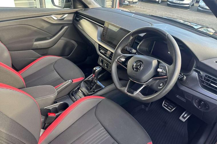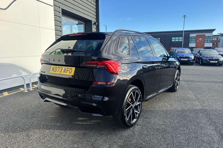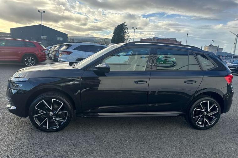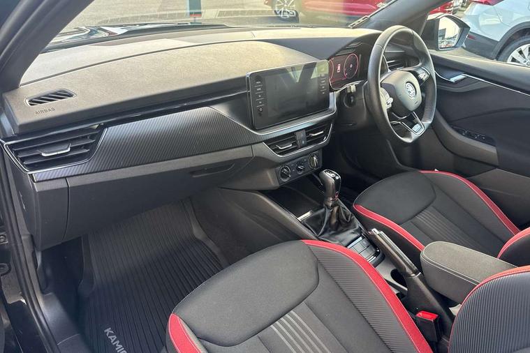 Amundsen satellite navigation with 9.2" glass colour touchscreen display, web radio, voice control and traffic sign recognition, Bluetooth system, E-call, Front assist system, Gesture control, PAS, Service indicator, Speed limiter, Wireless Smartlink for Apple CarPlay (wired for Android Auto), 8 Speakers, Auxiliary input socket, DAB Digital radio, Black door mirrors, Black radiator grille, Black rear diffuser, Body colour bumpers, Body colour door handles, Body colour roof spoiler, Boot lettering in black, Chrome grille surround, Dimming rear view mirror with black surround, Electrically adjustable and heated door mirrors, Fixed panoramic sunroof with black roof rails, Front and rear electric windows, Front sport bumper, Full LED headlights with adaptive front light system, cornering function, fog lights and dynamic indicators, Headlight range control, Heated rear window, High functionality rear led lights with dynamic indicators, KAMIQ Door sills, LED daytime running lights, LED third brake light, Light sensors, Monte carlo plaque, Privacy glass, Rain sensor, Rear fog lights, Rear side wing doors, Rear wiper, 12V Accessory socket in centre console, 3 seat bench in 2nd row, Aluminium pedals, Black ceiling for black/beige interior, Black roof lining, Chrome inner door handles, Cloth upholstery, Front head restraints, Glove compartment with illumination, Ice scraper, Isofix child seat fittings on outer rear seats, ISOFIX on front passenger seat, Leather gear lever, Manual lumbar support for front seats, Rake/reach adjustable steering wheel, Reading lights, Single front passenger seat, Sports seats, Sun visors with illumination on front passenger, Textile floor mats, Third rear headrest, Top tether for front passenger seat, Umbrella in driver's door, 3x3 point rear seatbelts, Airbags - driver and front passenger, ESP, Front passenger airbag deactivation switch, Front side airbags with curtain airbags, Hill hold control, Manual parking brake, Manual rear child locks, One tone horn, Rear disc brakes, Seatbelt reminder for driver an co-driver, Traction control, Tyre pressure monitor, Anti-theft alarm system with interior monitoring, backup horn, towing protection and remote central locking with SAFE system, Anti-theft wheel bolts, Electronic engine immobilizer, Chrome air vent surrounds, 18" Vega alloy wheels in black,
