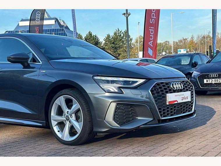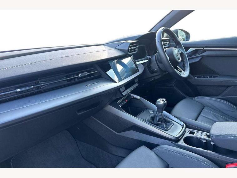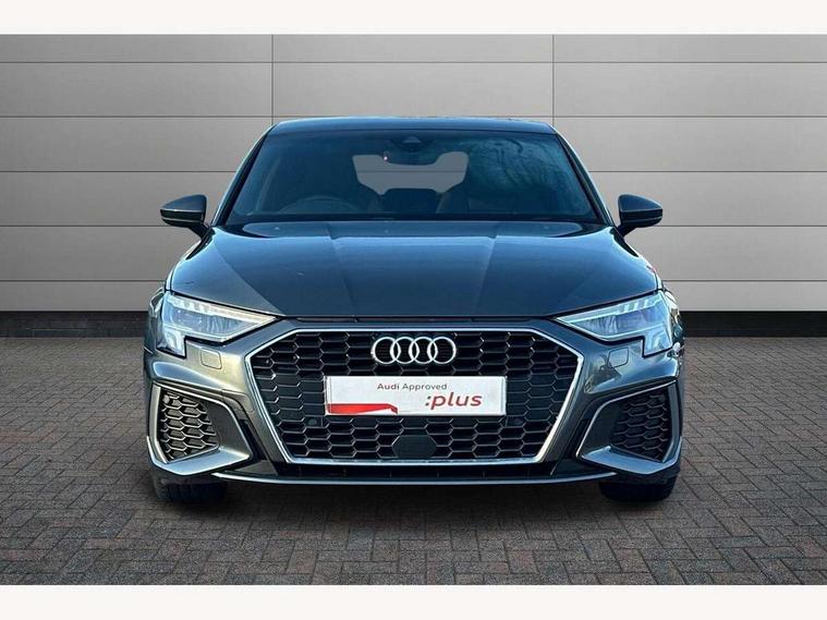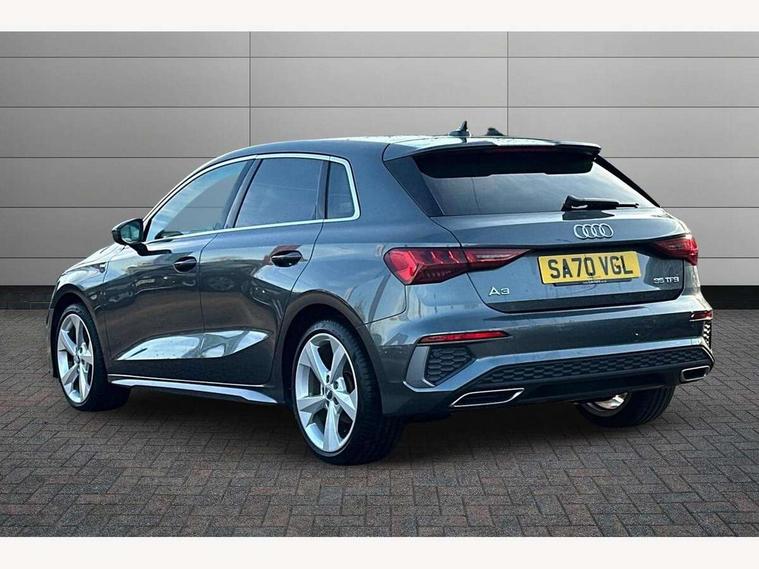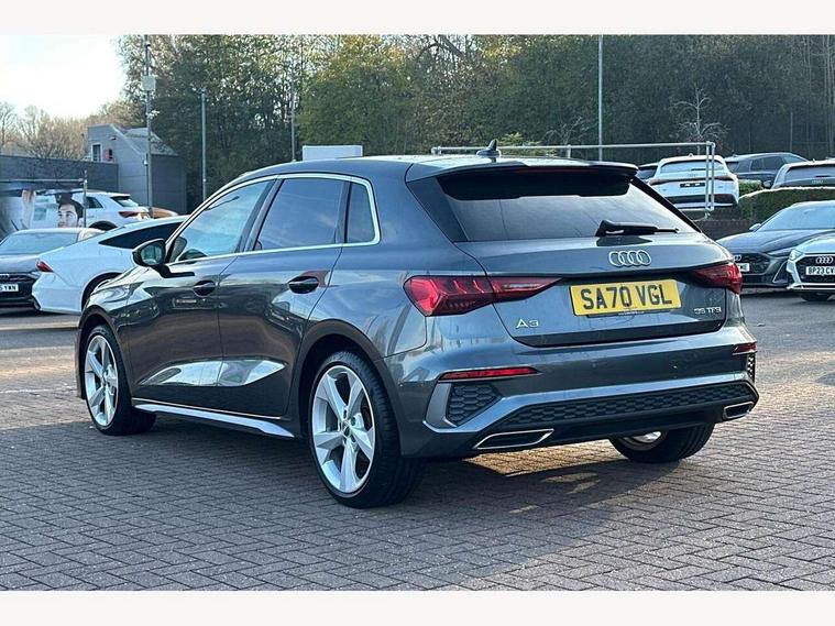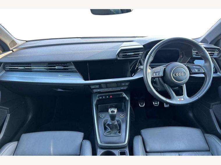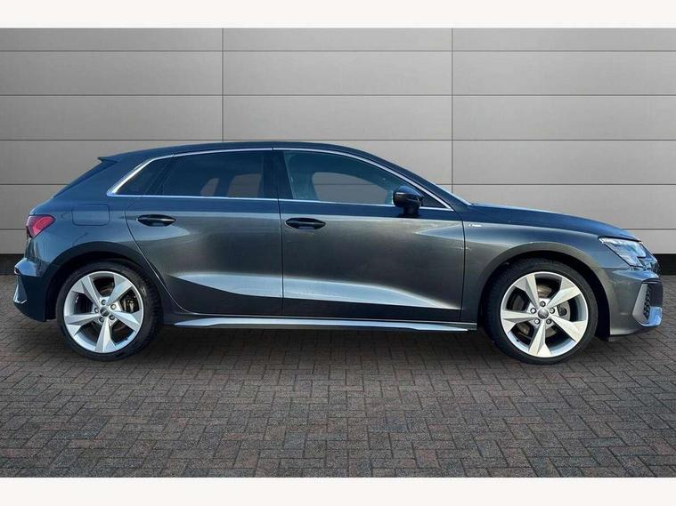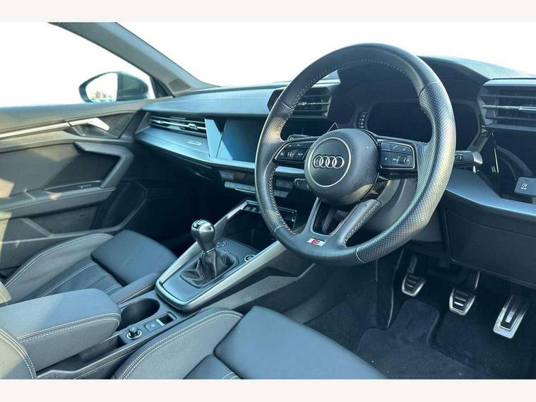 Audi connect emergency call and service, Audi drive select (Auto, Comfort, Dynamic, Efficiency and Individual), Audi smartphone interface, Audi Virtual Cockpit - 10.25" digital and colour instrument cluster, Automatic start/stop system with recuperation, Bluetooth interface, Collision avoidance assistant, Cruise control, Electromechanical power speed sensitive steering, Lane departure warning system, MMI Navigation Plus with high resolution 10.1" colour touch screen display, Rear parking sensors, Service indicator, Trip computer, Voice control system with natural language interaction, 1xUSB-A and 1xUSB-C connection, 6 passive loudspeakers, DAB Digital radio, Acoustic glass windscreen, Aluminium window trim, Auto dimming frameless rear view mirror, Body colour exterior mirrors, Electrically adjustable/heated/folding/dimming door mirrors with kerb view includes integrated LED indications + kerb view function for passenger side, Front electric windows, Illuminated aluminium inserts front door sills with S logo, LED daytime running lights, Light and rain sensors, Privacy glass - dark tinted rear window, rear door and side windows, Rear electric windows, Rear side air outlets in grained matt black, Rear wiper, S line bumpers, S roof spoiler, 12V socket and storage compartment in front centre console, 40/20/40 split folding rear seat bench with cupholder, Black cloth headlining, Dual zone electronic climate control, Front and rear centre armrest in leather, Front and rear headrests, Front/rear floor mats, Height and reach adjustable steering wheel, Interior lighting - glove compartment light and right hand side, Luggage compartment floor covering, Manual boot compartment lid, Manually adjustable front seats, Seat side bolsters, Stainless steel pedals and front footrest, Twin leather upholstery with front sports seats S embossed logo, Aluminium interior elements pack - A3 Sportback, S line styling pack - A3 Sportback, 3x3 point rear seat belts, Driver and front passenger airbag with passenger airbag deactivation, Electronic Stabilisation Control (ESC) including ABS, ASR and EDL, First aid kit with warning triangle and 2 safety vests, Hill hold assist, Pre-sense front with pedestrian and cyclist detection, Seatbelt monitoring, Tyre pressure loss indicator, Anti theft alarm, Anti-theft wheel bolts, Electronically operated child lock, Immobiliser, Remote control central locking, Accent surfaces in the dashboard and centre console in platinum grey silk effect paint finish, Dark spectrum aluminium inlays,