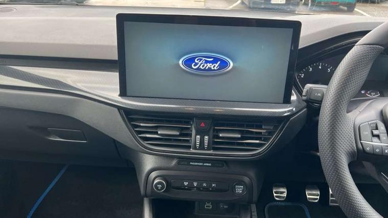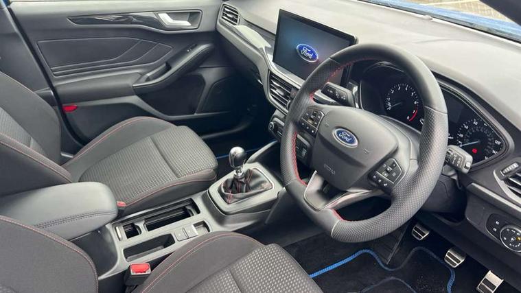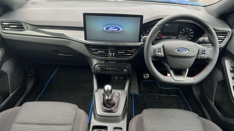 4.2" TFT coloured cluster, Bluetooth system, Digital clock, E-call, Easy fuel capless refuelling system, Eco mode, Ford SYNC 3 navigation with 8" TFT touchscreen, DAB radio and app link Android auto/Apple carplay, Intelligent speed assist, Lane keeping system - lane keeping alert and lane keeping aid, PAS, Selectable drive mode, Trip computer, Sports tuned suspension, 2 USB ports, Aux input, Auto dimming rear view mirror, Auto headlamps (on/off), Automatic rain sensing wipers, Body colour large rear spoiler, Body coloured bumpers, Body coloured door handles, Body coloured electrically operated and heated door mirrors with side indicators, Electrically operated front and rear windows with one touch opening and closing, Front variable intermittent wipers with electric wash, Heated rear window, LED daytime running lamp, LED front fog lamps with cornering function, LED reflector headlamps, Polished twin tailpipe, Power folding door mirrors, Quickclear heated windscreen, Rear privacy glass, Rear side wing doors, Roof rails, ST-Line upper and lower grille with full body styling kit and wing badges, Tailgate wash/wipe, Third brake light, 2nd Load floor, 3 seat bench in 2nd row, 3 spoke flat bottomed Sensico steering wheel with red stitching, Aluminium gear knob, Auto fold rear seats, Cloth upholstery, Dark headliner, Driver's lumbar support, Front floor mats, Height adjustable front headrests, Isofix child seat preparation, Manual air conditioning, Reach + rake adjustable steering column, Rear centre headrest, Single front passenger seat, 3x3 point rear seatbelts, ABS+Electronic Brake force Distribution, Auto hold function, Driver airbag, Electronic parking brake, Electronic stability control, Front and rear seatbelt reminder, Front inertia reel height adjustable seatbelts with pre-tensioners, Front passenger airbag, Front side airbags, Hill start assist, Manual rear child locks, Passenger airbag deactivate switch, Post collision braking, Pre collision assist with autonomous emergency braking and pedestrian/cyclist detection, Side curtain airbags, Three rear inertia reel lap/diagonal seatbelts, Tyre pressure monitoring system, Ford keyfree system with Keyless entry and keyless start/sleep mode key fob, MyKey system, Remote central locking & engine immobiliser, Thatcham category 1 alarm, 17" 5x2 spoke alloy wheels with rock metallic finish, Mini steel spare wheel,