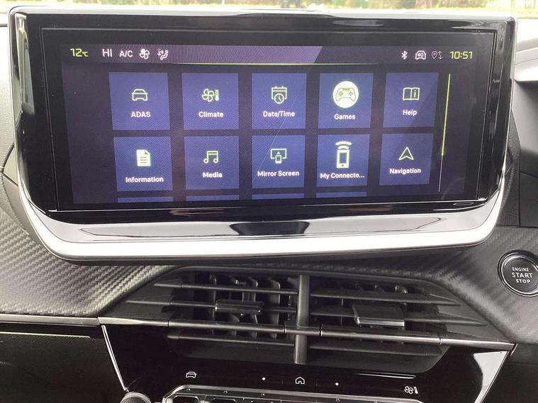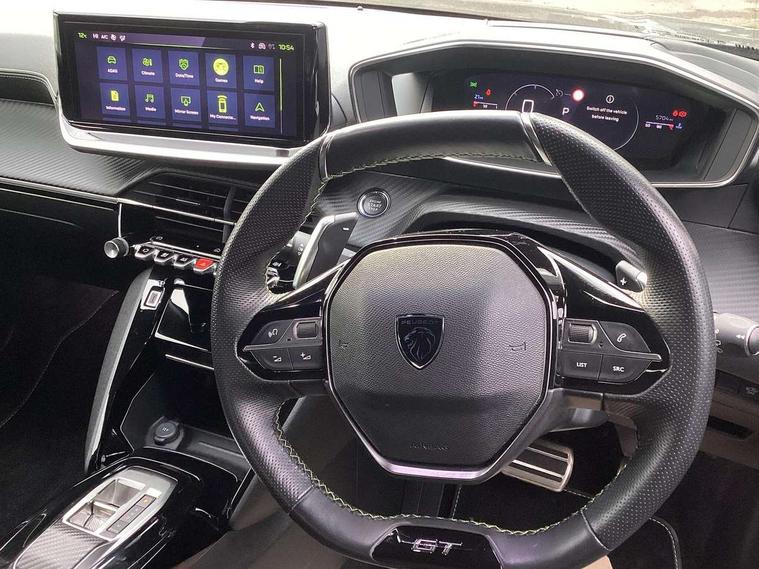 Bluetooth telephone facility, Driver attention warning, E-call, Exterior temperature indicator with ice warning, Multi function trip computer, PEUGEOT i-Cockpit with compact steering wheel, PEUGEOT i-Cockpit with configurable 3D headup instrument panel, PEUGEOT SOS and assistance, Smartphone charging plate, Speed limit recognition and recommendation, Wireless mirror screen with mirror link, apple carplay and android auto, Petrol Particulate Filter, 1x USB-C socket in rear and 1x USB-A socket in rear, 2 USB-C ports in the front, 6 speakers radio with mp3 compatible, DAB Radio (Digital Audio Broadcasting), Voice recognition for radio, navigation and telephony features, 2 X Rear number plate lights, Aluminium door sill scuff plates with peugeot lettering, Automatic hazard light activation upon heavy brake application, Black diamond roof, Black front wing trim with gloss black detail and GT badging, Body coloured exterior door handles, Dark tinted rear side and tailgate windows, Diamond black mirror shells, Diamond black rear roof spoiler, Electric, heated, and power folding door mirrors, Frameless electrochrome interior rear view mirror, Front bumper - Meteor grey lower trim, Full LED headlights with smartbeam assist with auto height adjustment, Gloss black finish on B pillar, Gloss black rear cluster connecting strip, Gloss black roof bars, Gloss black window surround, GT model designation badging on tailgate, Headlights left on audible warning, LED daytime running lights with distinctive 3 claw signature, LED side indicator lights integrated into door mirrors, LED third brake light, Model designation badges front and rear, One touch electric front/rear windows with pinch protection, Radiator grille - body coloured vertical chequered grille, Radiator grille - gloss black top edge trim, Rear full LED 3D peugeot signature claw effect lights with daylight function, Rear reversing lights, Rear side wing doors, Rear windscreen wiper triggered automatically in reverse gear, Tailgate with heated rear windscreen and wiper blade, Twin chromed exhaust pipes, Wheel arch extensions, 1/3 to 2/3 split folding rear seats, 12V socket, 3 seat bench in 2nd row, 8 Colour personalisable ambient lighting, Automatic air conditioning with pollen and active carbon filter, Central front armrest with storage compartment, Driver and front passenger sport seats, Electric power steering with reach and rake adjustable steering column, Front and rear carpet mats in black, Front LED interior light with 2 reading spotlights and rear interior light with timer, Front passenger seat manual adjustment - height, longitudinal and back rest angle, High centre console, ISOFIX child seat mounting points on passenger seat, Mistral full-grain perforated leather steering wheel with Lime Green stitch detail and satin chrome 'GT' emblem, Multifunction steering wheel, Piano keys: Gloss black and chrome toggle switches to access main functions of the vehicle and touchscreen functions, Roof lining - Mistral black, Seatbelt unfastened on the move audible and visual alert for front and rear seats, Single front passenger seat, Two position modular boot floor, Visibility pack - 2008, 2x 2nd row ISOFIX child seat mountings, ABS (Anti-lock Braking System) with EBD (Electronic Brakeforce Distribution) and EBA (Emergency Braking Assistance), Active safety brake with night function/cyclists/pedestrians, Adaptive driver and front passenger airbags with passenger airbag deactivation function, Child locking functionality on rear doors, Driver/front passenger side airbags, Electric parking brake, ESP (Electronic Stability Program) + Hill Start Assist, Front and rear curtain airbags, Front and rear disc brakes, Front and rear three-point retractable seatbelts, with force limiters, Front optimised safety headrests and rear retractable headrests (x3), height adjustable, Tyre pressure sensor, Automatic door locking when moving off, Deadlocks, Electronic code immobiliser, Peugeot Open and Go (keyless entry and push button start), Thatcham category 1 alarm, Carbon effect Dashboard, front and rear door panel finish,