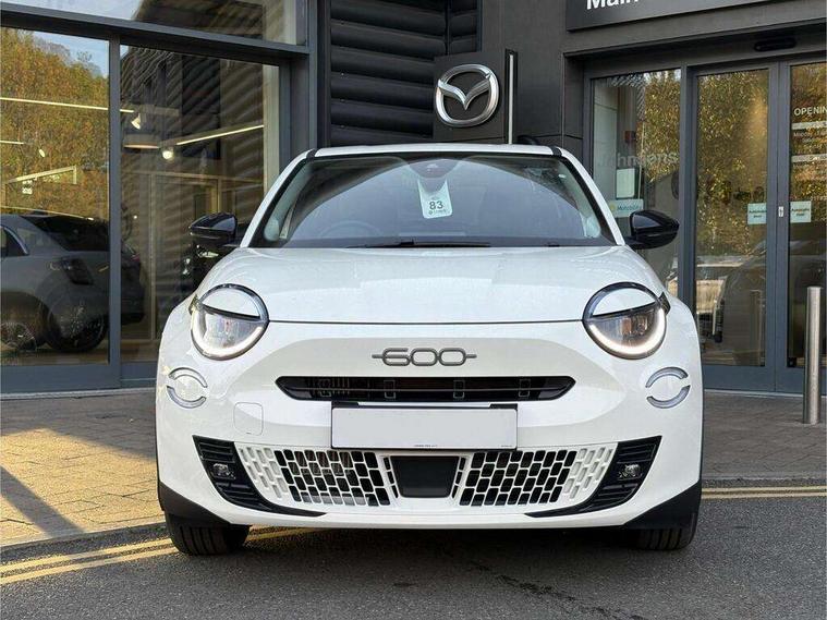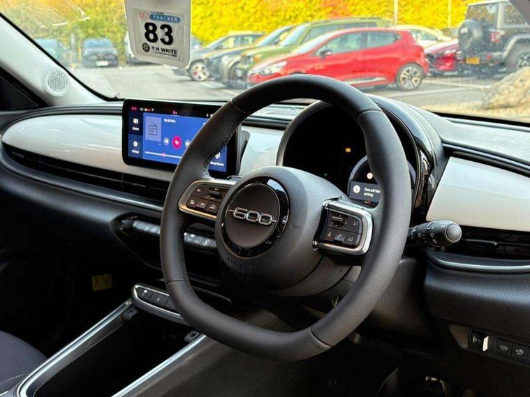 7" TFT digital cluster, Bluetooth connectivity, BSRF connectivity box, Connected services, Cruise control, Drowsy driver detection, Emergency E-call assist, Engine emission level default, GSR II step 1, Intelligent speed assist, Lane keeping assistant (LKA), Odometer, Power assist steering, Rain and dusk sensors, Rear parking sensors, Traffic sign recognition, Wireless apple car play/android Auto, Without drive mode selector, L2-AGM 12V battery, 1st Row USB type-A and USB type-C, 4 speaker audio system, Radio, Uconnect infotainment 10.25" touchscreen with DAB, All power windows express Up/Down, Auto dimming frameless rear view mirror, Automatic headlights, Body coloured door handles, Chrome day light openings, Electric adjustable door mirrors, Exterior chrome accents, Front and rear Chromed 600 logo, Gloss black finish B pillar, Gloss black shark fin antenna, Glossy black door mirrors, Heated windscreen wiper blade area, LED 3rd brake light, LED daytime running lights, LED Fog lamps with cornering function, LED front signature lighting, LED front turn indicators and position lights, LED rear lights, LED rear signature lighting, LED reflector headlamps, Matt black side skirts with 600 chromed logo, Rear bumper embossed 600 logo, Rear roof spoiler, Rear side wing doors, Rear wiper, 2 Spoke synthetic leather steering wheel with audio control, 3 rear headrests, 3 seat bench in 2nd row, 4 way manually adjustable passenger seat, 6 way manually adjustable drivers seat, Auxilliary 12V power socket, Body colour dashboard fascia, Chrome interior door handles, Dark metachrome dashboard ring, English handbook, Front centre armrest, Front headrests, Front passenger grab handle, Front seatback pockets, ISOFIX attachment on front passenger and rear passenger seats, Manual climate control, Metachrome central compartment bezel, Monogram fabric upholstery, Paddle shifts, Partial body cover for shipment, Predisposal for accessory upgrade to default tunnel pad cover (dedicated prnd bezel), Rear seat 40/60 split, Single front passenger seat, Smart 15L storage central tunnel with tunnel pad cover, Sunvisor label ciao Fiat, Sunvisors with vanity mirrors, 3x3 point rear seatbelts, 6 airbags, ABS, Autonomous Emergency Brake (AEB) & Vulnerable Road User (VRU) Protection, Child locks on rear doors, Electronic parking brake with auto hold, ESC (Electronic Stability Control), Front passenger airbag deactivation, Seatbelt reminder and pretensioners for all seats, Anti-theft volumetric alarm, Anti-theft wheel bolts, Keyless Go, 17" Diamond cut alloy wheels, Fix and go puncture repair kit,