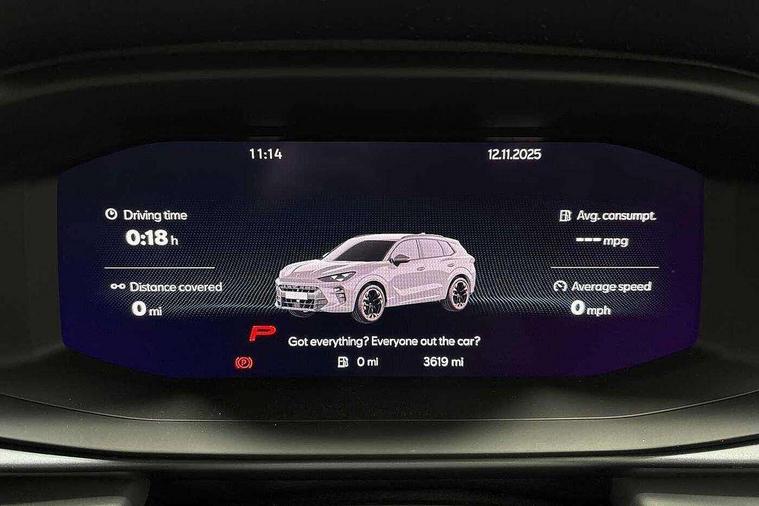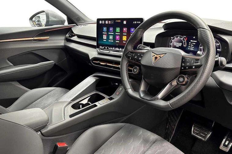 10.25" digital cockpit and configurable dashboard, Adaptive cruise control with follow-to-stop and speed limiter, Advanced driver alert system, Advanced lane assist with semi-automatic vehicle control in a medical emergency and traffic jam assist, Driving profile selection and conventional shock absorber, Dynamic road sign display, E-call, Electric tailgate with virtual pedal, Emergency steering support with turn assist, Four x USB Type C ports (2 in front and 2 in rear), Front and rear parking sensors, Front assist (Forward collision warning with automatic braking) with multifunction camera and front cross traffic assist, Head up Display, Intelligent park assist, Media system with Nav - 12.9" touch display, voice control, full link phone (wired/wireless), DAB and Steering wheel mounted controls, Rear traffic assist, Side and exit assist, Speed sensitive power steering, Start/stop system with regenerative braking, Top view camera (front camera, rear camera, 2 side cameras), Wireless phone charger, Auto dimming rear view mirror, Black roof rails, CUPRA 3D rear lights with ceremony & swiping indicator and illuminated logo, Dark tinted rear windows, Daytime running lights with automatic headlight control and Coming and Leaving home function, Door mirrors with memory function and lowing function on passenger mirror, Dynamic headlight range control, Electric front/rear windows, Electrically adjustable, heated and folding door mirrors, Front fog lamps with cornering function, Heat reflecting windscreen, High beam assist, LED headlamps with signature "CUPRA LED", Rain sensing wipers, Rear fog light on one side, back up light on both sides, Rear side wing doors, Rear wash/wipe, Third brake light, Welcome lights (within exterior mirror housing), 3 seat bench in 2nd row, Black roof lining, Cupra sports pedals, Dinamica cloth upholstery, Driver seat memory function, Electrically adjustable front seats including lumbar support, Front and rear head restraints, Front and rear reading lights X 4, Front centre armrest, Heated front seats, Heated leather wrapped multi function sports steering wheel with tiptronic, Illuminated interior front door sills, Isofix, Operating voltage 12V, Single front passenger seat, Smart wraparound interior lighting, Sunvisors with illuminated mirror, Three zone climate control with control panel in rear, Unsplit rear seat bench, split folding backrest, with centre armrest, Variable luggage/load compartment floor, 3 point seatbelts in front with pretensioner and electric height adjustment, 3 point seatbelts on all rear seats, Brake control system - ESC and brake booster, Child proof door locks, Driver and front passenger airbags, Electronic parking brake, Front and rear disc brakes, Front interaction airbag, Front passenger airbag deactivation switch, Front side airbags with curtain airbags, Pre-crash front and rear seat belt tensioner, window closure and hazard lights, Tyre pressure monitoring system, Visual and acoustic seat belt reminder, electric contact in front and rear, Anti theft alarm, Keyless locking and starting system with keyless access, Locking wheel bolts, Black decorative trims, Chrome interior detailing, 19" Spectrum exclusive machine alloy wheels, Tool kit,