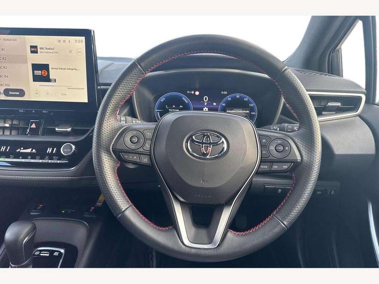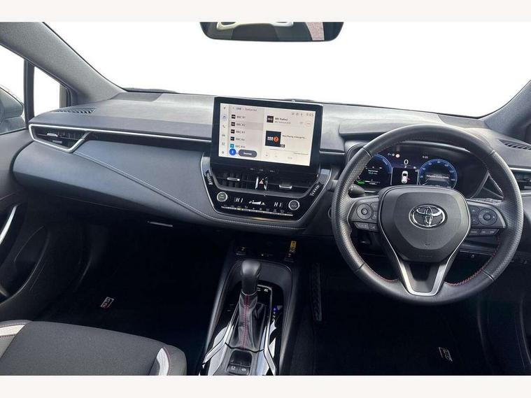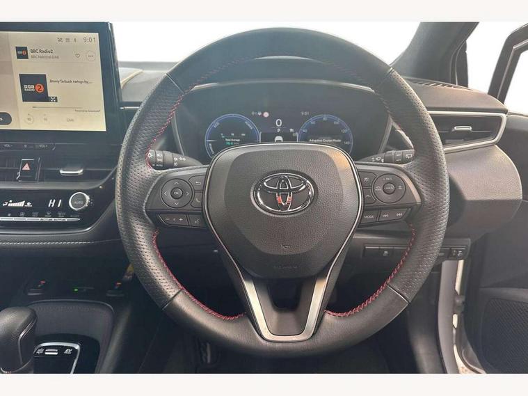 10.5" Multimedia display screen, Bluetooth telephone connectivity, Connected car functionality upgrade, tracker, remote status and e-care, Drive mode select (Eco, Normal), E-call, Electrically assisted power steering, EV drive indicator, Front and rear parking sensors with auto brake, Full Digital 12.3" TFT Digital Combimeter, Key reminder warning, Lane Departure Alert (LDA) switch on steering wheel, Memory on adjustable speed limiter, MyT connected services, Proactive driving assist (PDA), Reversing camera, Smart entry and push button start with GR Logo, Smartphone integration with Apple CarPlay and wired android auto, Tailgate, Toyota remote services, Toyota smart connect navigation, Wireless charger, Gasoline particulate filter, Vehicle Stability Control (VSC), 6 speakers, AM/FM radio, DAB Digital radio, Front USB-C in centre console, Front USB-C in dashboard, Smart voice assist/ Voice recognition, USB and Aux in connectors + 12V front outlet, Anti-jam protection on power windows, Auto up and down function on all power windows, Automatic folding mirrors, Automatic headlights with high beam assist, Black centre and side air vents, Black toyota logo in front, Body coloured bumpers, Body coloured door mirrors, Body coloured outside door handles, Dark chrome lower grille, Electrochromatic mirror, Follow me home headlights, GR Sport dark chrome front mesh grille and black rear grille, GR Sport exclusive under guard, GR sport scuff plates, LED daytime running lights, LED dual beam projector headlights, LED front fog lights, LED High mounted stop light, LED rear combi lights with LED lightguide, Manual headlight levelling system, New grille pattern, Noise reduction layer on windscreen, Piano black diffuser, Power adjustable heated door mirrors, Power front windows, Power rear windows, Privacy glass with UV filter, Rain sensing wipers, Rear side wing doors, Rear window defogger, Rear window wiper, Reverse tilting door mirrors, Rocker and door lower moulding, Roof spoiler, Satin chrome insert on front air vents, Satin chrome insert on front door assist grips, Satin silver front spoiler, Shark fin antenna, Tailgate release with push button, Time adjustment on intermittent wiper, Turning signal integrated indicators in door mirrors, Unique lower skirt, Unique side rocker with black insert, UV-filter on driver and passenger windows, 2 Shopping bag hooks in luggage compartment, 3 rear headrests, 3 seat bench in 2nd row, 3 spoke leather steering wheel with satin insert/red stitching + gear knob, 4 tie down hooks in luggage compartment, 60/40 split folding rear seat, Adaptive cruise control (ACC) switch on steering wheel, Adjustable speed limiter switch on steering wheel, Audio, multimedia and telephone switches on steering wheel, Black armrest on centre console box, Black gear shift console, Boot light, Centre room light, Driver and front passenger personal light, Driver and passenger assist grip, Driver and passenger seatback pockets, Driver and passenger sun visor with mirror and light, Dual zone automatic air conditioning with ECO mode switch, Fabric/synthetic leather upholstery, Front and rear cup and bottle holders, Front door pockets, Front head restraints, Front passenger seat, Front sliding synthetic leather armrest, GR Sports seats with partial leather bolsters, Heated seats, Illuminated entry system in room lamp, ISOFIX seat fixing (2 fixings on rear outer seats), Manual height adjustable for driver and front passenger seat, Manually tilt with sliding driver and front passenger seat, Nanoe-X air purifier, Parcel shelf, Pollen filter, Power window switches with satin chrome inserts, Rear armrest with 2 cupholders, Rear passenger coat hooks (2), Red stitching on gear shift, Remote air conditioning, Satin chrome inside door handles, Satin chrome surround on speedometer, Sliding armrest on centre console box, Slow opening glovebox with lights, Textile floor mats, Tilt/telescopic steering column, Voice recognition switch on steering wheel, Whiplash Injury Lessening (WIL) feature (active headrest) for seats, White ambient lighting on open tray and front cup holder, Toyota safety sense 3 pack - Corolla, 3x3 point rear seatbelts, Adjustable driver and front passenger seat belt extender to top anchor point, Anti lock braking system + Electronic brake force distribution, Brake assist function, Child locks on rear doors, Downhill Assist Control (DAC), Electronic parking brake, Emergency brake light signal (EBS), Front passenger airbag on/off switch, Front seatbelt reminder, HAC - Hill start assist control, Rear seat belt reminder, Seatbelt pretensioners and force limiters, Supplemental restraint system (SRS) 7 airbags - dual driver, dual side curtain, side impact and driver knee airbags, Traction control, Tyre pressure warning system, Acoustic vehicle alert system (AVAS), Alarm with motion sensor and immobilizer, Power passenger window lock, Remote central locking + deadlocks, GR Sport interior styling with accents and exterior styling, Satin chrome dash trim, Soft touch texture on upper dashboard, Stitching on lower dashboard, 18" Black machined face 10 spoke alloy wheels, Tyre repair kit, Unique wheel finish with red wheel cap,