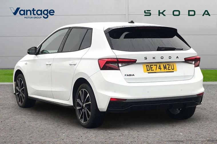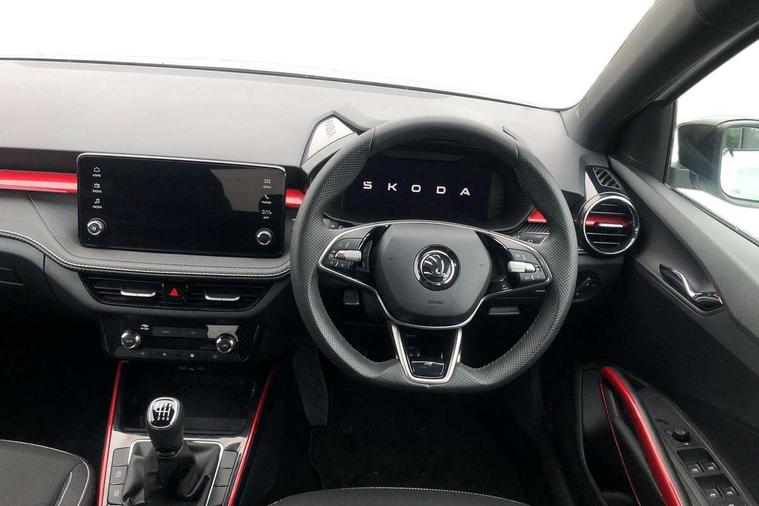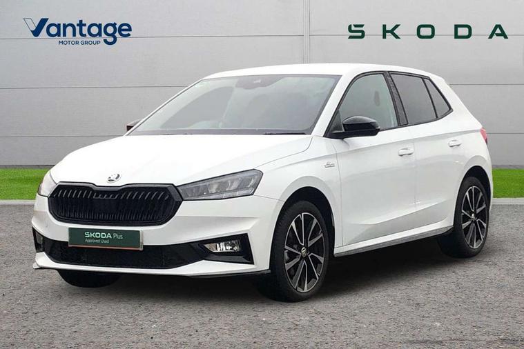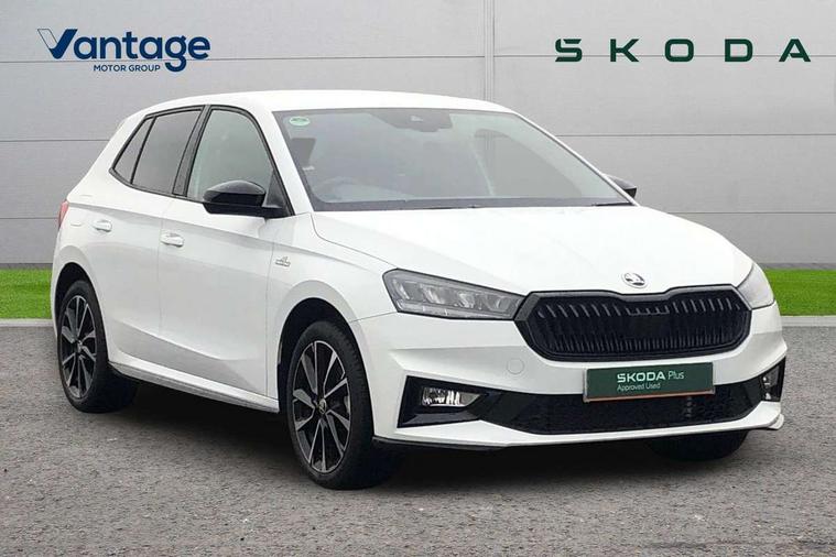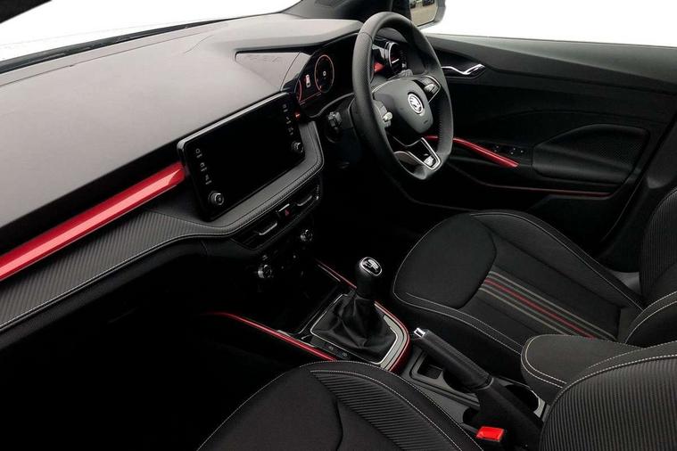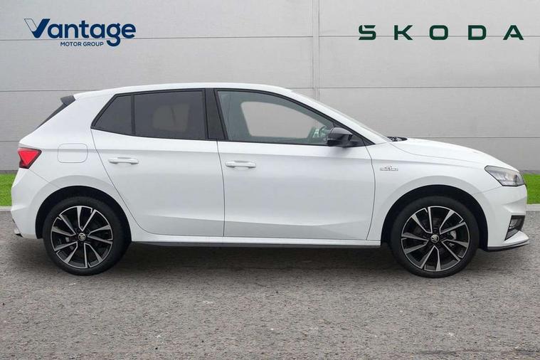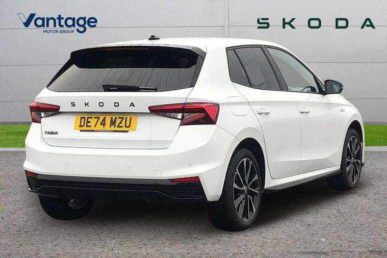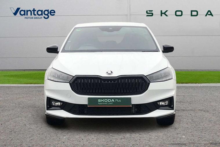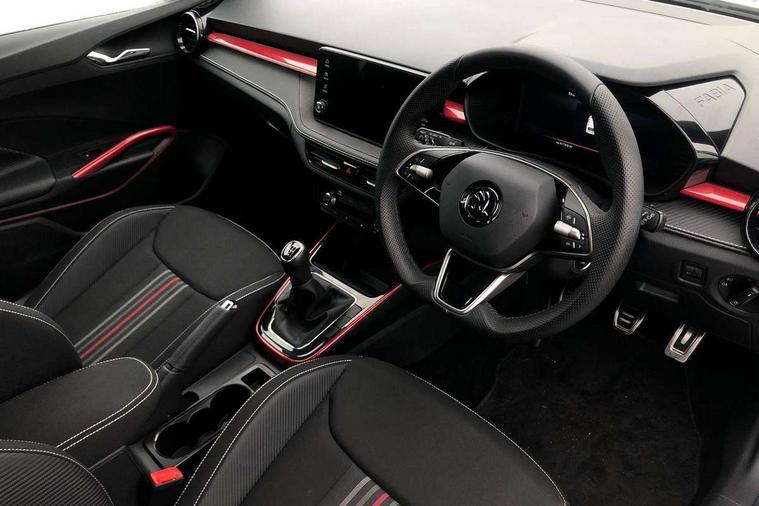 Advanced driver attention and drowsiness monitor, Bluetooth connection, Electromechanical power steering, Exterior temperature gauge, Service interval indicator, Traffic sign recognition, Virtual cockpit with 10.25" colour display, Wireless SmartLink for Apple CarPlay and Android Auto, 6 Speakers (4 in front and 2 in rear), Auxiliary socket for external MP3 player, DAB digital radio reception, Auto dimming rear view mirror, Black radiator grille, Body coloured bumpers, Door mirror integrated indicators, Front and rear electric windows, Front window wiper intermittent control, Headlight range control - Automatic, Ice scraper in fuel cap, LED daytime running lights with coming and leaving home feature, LED rear lights, Monte Carlo badging, Privacy glass, Rear LED fog light, Rear side wing doors, Rear window wiper with washing nozzles, Roof mounted spoiler, SKODA tailgate lettering in black, Sports bumpers, Third brake light, 2 reading lights in front and 2 reading lights in rear, 3 rear headrests, Aluminium pedals, Backrest split and folding, Black headlining, Central console with removable cup holder and storage box, Chrome handbrake release button, Door sills with fabia badging, Dual zone air conditioning with climatronic electronic control, Fabric/artificial leather upholstery, Front centre armrest, Front sports seats, Gearshift knob/handle in leather, Hand brake lever handle in leather, Height adjustable front headrests, Height adjustable front seats, Height adjustable steering wheel, ISOFIX and TopTether anchorage points to the outer rear seats, ISOFIX and TopTether on the front passenger seat, Luggage compartment lighting, Manually adjustable lumbar support in front seats, Metallic painted red central console cover, Metallic red interior door handles, Pollen filter, Rear seat bench unsplit, Single front passenger seat, Sun visors with mirror and airbag label on passenger side, Textile floor mats, Ticket holder, Umbrella in drivers door, 3-point height adjustable front seats belts with pretensioner and force limiter, Automatic warning lights in case of crash, Driver and passengers airbag with switch off function, e-Call+, ESC including ABS, MSR, ASR, EDS, HBA and XDS, Front and rear seat belt warning, FRONT ASSIST (AEB City and AEB Inter Urban), Front side airbags, Head airbags, One tone horn, Pedestrian protection, Three rear 3-points safety seat belts with pretensioner and force limiter including stop function for outer rear seat belts, Tyre pressure monitoring system, Anti-theft alarm system including immobiliser, interior monitoring, backup horn, and towing protection, Central locking with radio remote control, interior controls, SAFE function and 2 foldable keys, Carbon effect door and side trim panels, Carbon effect lower decorative trim with white stitching, Monte carlo air vents, Red metallic upper decorative trim, Anti-theft wheel bolts protection, Super-low rolling resistance tyres,