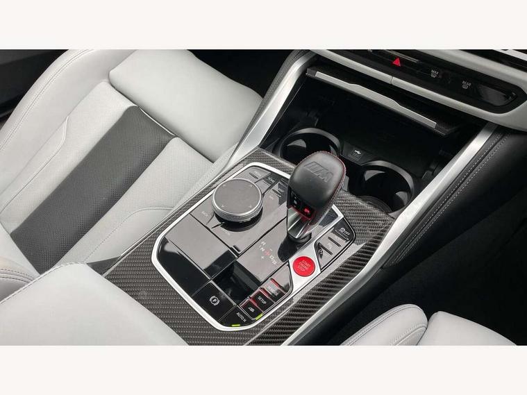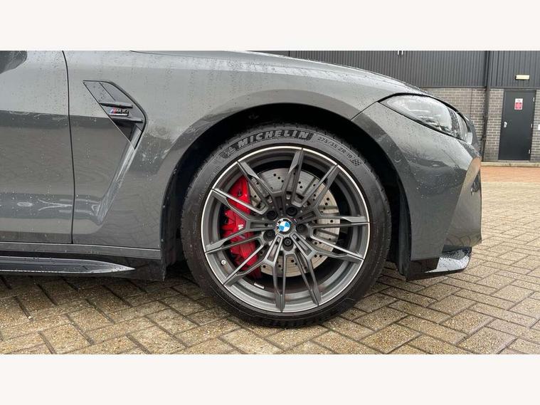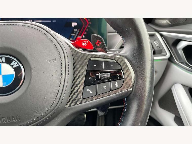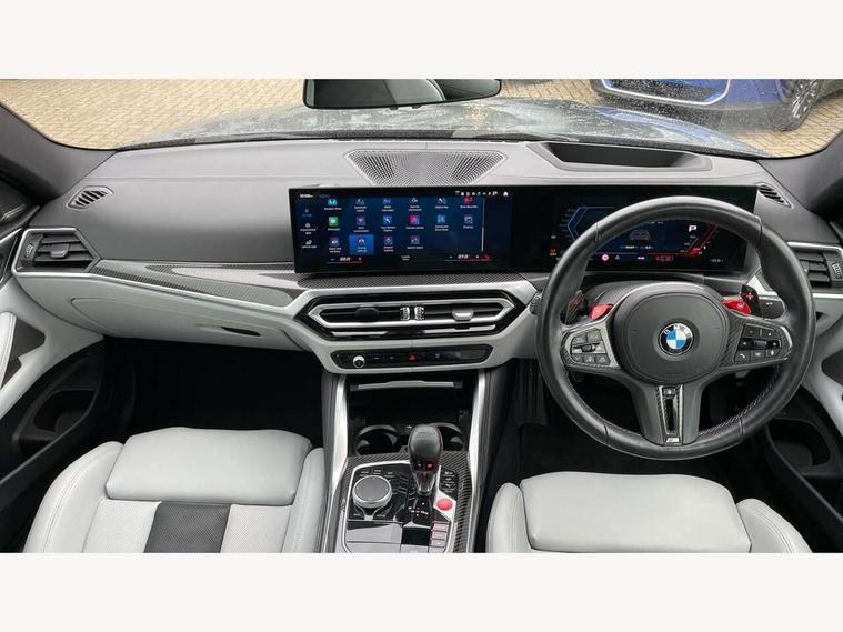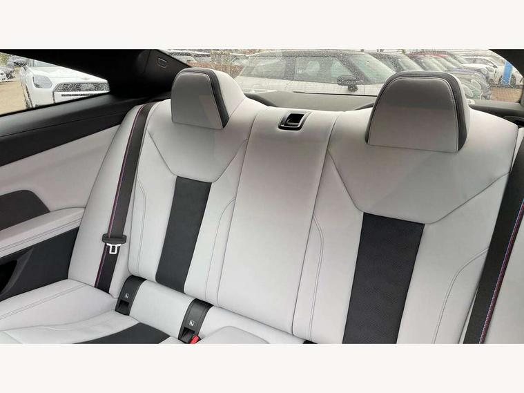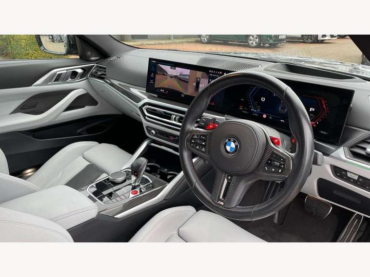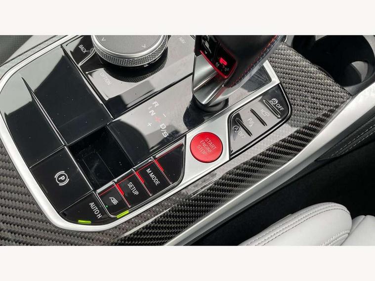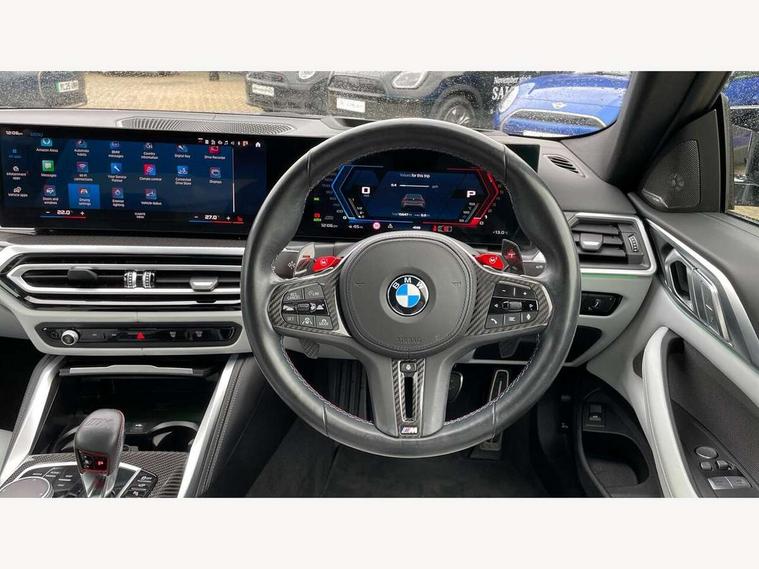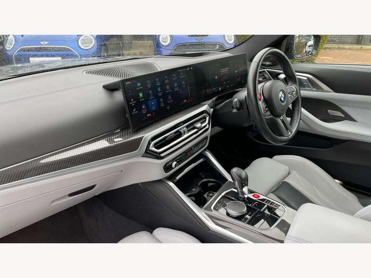 Active guard plus, Automatic start/stop system, BMW ConnectedDrive online services, BMW iDrive controller on centre console, BMW legal emergency call, BMW Live Cockpit Professional sat nav system with 12.3" instrument display and high resolution control display, BMW Teleservices, Brake pad wear indicator warning light, Condition based service, Door/boot open warning light, Driving experience switch, Electric Power Steering (EPS) with Servotronic, Instrument cluster with extended contents, Lights on warning, M drive buttons, Oil sensor for level and grade, warning by check control system, Oil temperature gauge, On board computer, On board diagnostics, Optimum shift indicator, Outside temperature display, Park distance control, Pull away assistant, Run flat indicator, Service interval indicator, Shifting point display, Speed limiter, Variable sport steering, Adaptive M Sport suspension, Double joint spring strut front axle, M Drive Professional including track mode, laptimer, traction control & Drift analyser, M Sport differential, M steptronic sport transmission with drivelogic, Safety battery terminal clamp, 8 programmable favourite buttons, Auxiliary point for auxiliary devices, BMW professional radio/CD/MP3, DAB Digital radio, Harman/Kardon loudspeaker system, Acoustic laminated side glass, Auto dimming driver's door mirror, Auto dimming rear view mirror, Automatic headlights + automatic windscreen wipers, Black chrome exhaust tailpipes, Black model designation badges, BMW high gloss shadow line with extended contents, BMW Individual shadowline lights, Body colour bumpers, Body colour door handles, Carbon fibre reinforced plastic (CFRP) roof, Day time running light, Door mirror integrated indicators, Door sill finishers with aluminium inserts, Dynamic brake lights, Electric adjustable heated door mirrors, Electric folding door mirrors, Follow me home headlights, Front and rear bumper system, Front electric windows with open and close fingertip control, anti trap facility and comfort closing, Headlight beam throw control, Heat protection, sun protection glazing, Heated washer jets, High beam assistant, High gloss black frameless kidney grille with M badge, LED number plate light, LED tail lights with 3D L-shaped LED light design, M designation, Mirror glass aspheric on driver's side, convex on passenger side, Rain sensor, Rear boot, Rear fog lights, Rear reflectors, Reversing light, Shark fin roof aerial, Third brake light, Visible VIN plate, Welcome lighting, 2 cupholders in front centre console, 2 cupholders in rear armrest, 2 rear head restraints, 2 x 12 V Power sockets (luggage compartment and front centre console), 2 x USB Type C ports for charging and data transmission in front centre console, 40:20:40 split folding rear 2 seat bench with loading system, Ambient lighting, Anthracite headlining, Battery in luggage compartment, Carbon fibre centre console incl. cover for cupholders and storage compartment, Carbon fibre decorative steering wheel finishers, Carbon fibre shift paddles, Carbon fibre strip in instrument panel on front passenger side, Centre console armrest with storage compartment, Compartment in front of cupholder, Driver/passenger sunvisors with illuminated vanity mirrors + covers, Electric front seats + driver memory, English handbook, Floor mats in velour, Footwell lighting, Front and rear door exit lights, Front door storage bins with bottle holder, Front interior light, Front isofix attachment + airbag deactivation, Front seat backrest width adjustment, Front seats lumbar support, Front/rear door armrests, Gearshift lever with embossed M badge, Heated front seats, Height adjustable front headrests, Interior mirror lighting, Isofix on 2nd row outer seats, Lockable/illuminated glovebox, Luggage compartment lighting, Multifunction steering wheel, Rake/reach adjustable steering wheel, Single front passenger seat, Storage compartment in rear doors, Storage tray and compartment with cover in centre console, Three zone automatic air conditioning, Toolkit located in luggage compartment, Wireless charging tray, Additional storage compartment pack - M4, Connected package professional - M4, High gloss shadowline exterior trim pack - M4, 4 x 3 point seatbelts, ABS/EBD, Automatic Stability Control (ASC), Brake energy regeneration, Brake fade compensation, Compound structure brake discs, Cornering brake control (CBC), Crash sensor, Curtain airbags, Driver/Front Passenger airbags, Dry braking, Dynamic brake control, Dynamic Stability Control with M Dynamic mode, Dynamic Traction Control - DTC, Electromechanical parking brake, Electronic differential lock control (EDLC), Front and rear head airbags, Front seat side impact airbags, Front seatbelt pretensioners + load limiters, Hill start assist, M Sport seat belts, Seat occupancy detection for driver and passenger side, Seatbelt warning, Side impact protection, Two tone horn, Tyre pressure sensor, Warning triangle and first aid kit, Centre lock switch, Closing system with central locking, Digital key, Electronic immobiliser, Remote central locking, Thatcham cat 1 remote alarm, Vehicle Key with 4 buttons including the integrated key, Galvanic finish to control surrounds, High gloss black interior trim, Tyre repair kit,