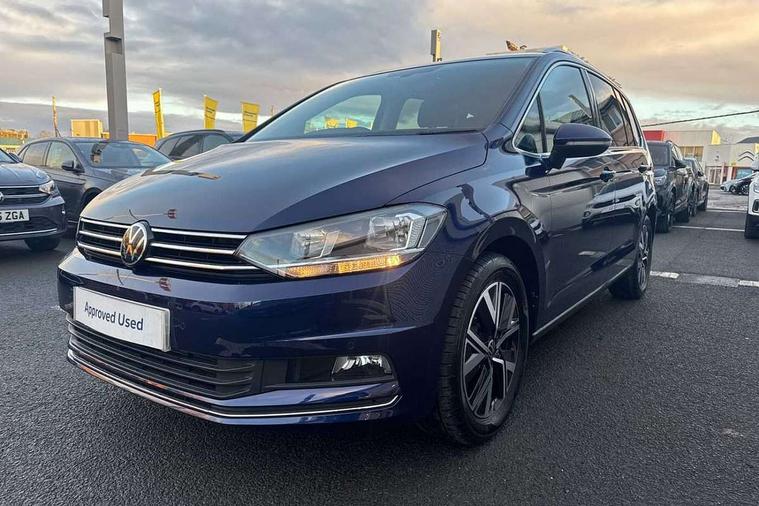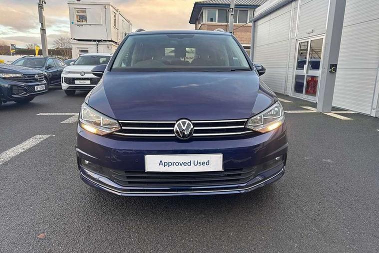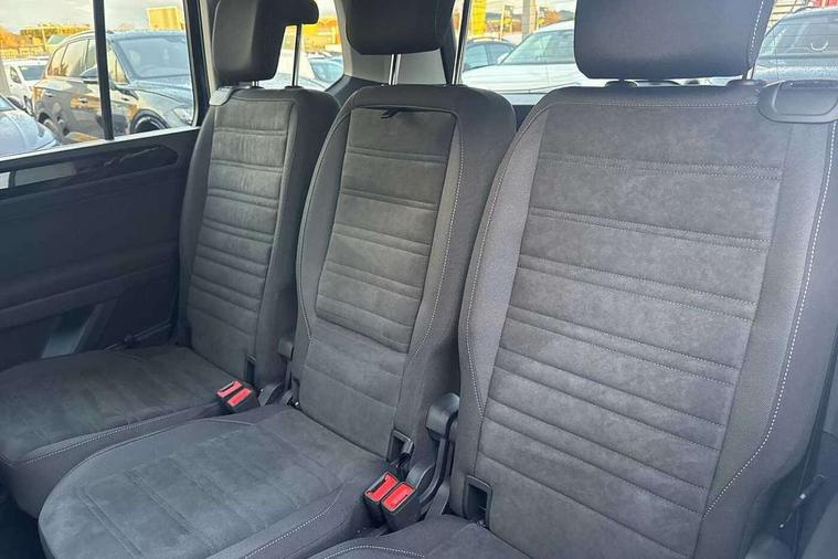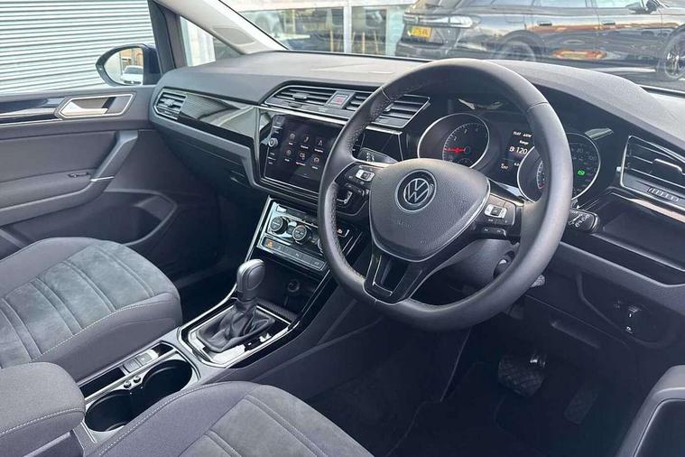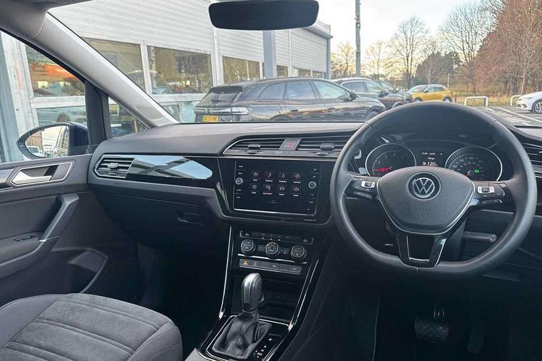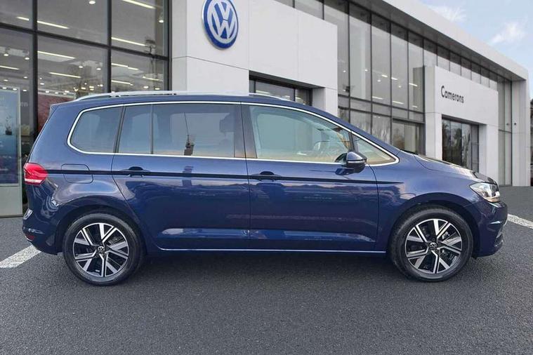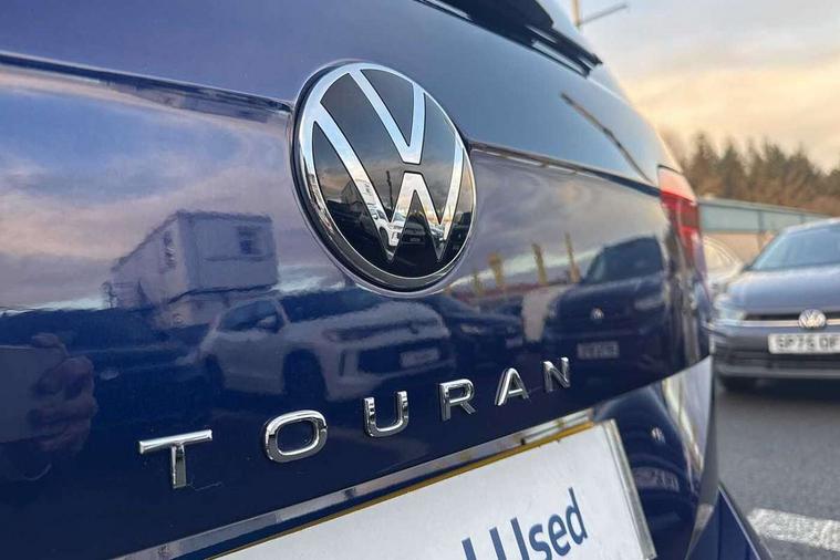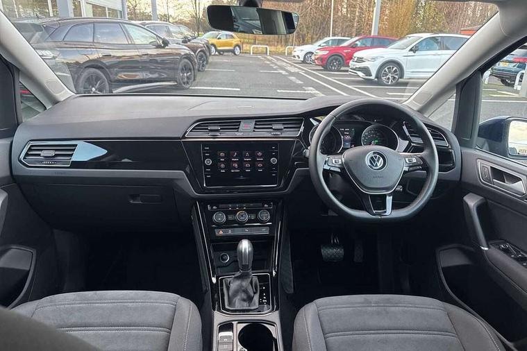 Adaptive cruise control, Audible lights on warning, Bluetooth telephone connectivity, Car information display, Digital cockpit, Discover nav, Euro 2D/3D map view+6.5" colour touchscreen CD + Radio, European map data, Car net guide/inform, Driver alert system, Driver electronic voice amplification function, Driver profile selection, Electronic odometer, Emergency services call system, Extended, crash-active and proactive Pedestrian and cyclist monitoring, External temperature gauge, Lane change system side assist and rear traffic alert, Lane keep assist, Mobile pairing with SMS function, Multifunction colour display, Rev counter with fuel gauge, Speed limiter, Speed sensitive power steering, Stop/start system, Think blue trainer driver tips and journey analysis, Trip and service interval display, Wireless app connect, Petrol Particulate Filter, XDS electronic differential lock, 4x20 watt output, 8 Speakers, Audio Connectivity System, DAB Digital radio, External USB-C data socket with increased charging performance - 2 USB sockets 45W, MP3/WMA compatability, SD card slot, Title and cover art display, USB connection, Aerial integrated into side window, Auto dimming door mirrors, on driver side, surround lighting and front passenger side mirror lowering function, Auto dimming rear view mirror, Automatic coming/leaving home lighting function, Body colour bumpers, Body colour door handles, Body colour door mirrors with integral indicators, Chrome fog light surround, Chrome lower front bumper insert, Chrome trimmed front air intake surrounds, Chrome trimmed radiator grille louvre inserts, Chrome trimmed side windows, Dusk sensor + auto driving lights, Front and rear electric windows, Front fog lights with static cornering function, Fully galvanised body, Gloss black finish B pillar, Green tinted heat insulating glass, High level third brake light, Rain sensor, Rear side wing doors, Rear tinted glass from B-pillar backwards approx 65% tinted, Rear wash/wipe with intermittent wipe setting, Silver roof rails, Tailgate wiper- reverse gear activation, Twin chrome exhaust tailpipes, Volkswagen roundel, Windscreen wipers intermittent wipe, 12V power point for Row 2, 12V socket in luggage compartment, 2 individual fold flat 3rd row seats, 2 three point seatbelts in 3rd row, 2nd row centre armrest, 2nd row centre seat converts into table, 3 single slide/fold/removable 2nd row seats, 3 spoke steering wheel, 3 Zone electronic climate control with automatic air recirculation, 3x3 point seatbelts on 2nd row with height adjust on outer seats, 4 boot load lashing points, 4 way adjustable front head restraints, 5 headrests, Ambient lighting in door trim and foot well, Art velour/Microfibre cloth upholstery, Driver and front passenger under seat drawer, Dust/pollen filters, Foldable front passenger seat backrest, Front + rear carpet mats, Front and rear reading lights, Front centre armrest with storage compartment, Front comfort seats with lumbar support, Front cupholders x 2, Front passenger seat height adjust, Front seat storage pockets, Front seatback folding tables, Height adjustable driver's seat, Height/reach adjust steering wheel, Illuminated glovebox, Illuminated vanity mirrors, Instrument lighting white adjustable panel illumination with red night time illumination, Interior light with delay, Isofix on 2nd row outer seats, Isofix on 3rd row seats, Large storage compartment in roof console, Leatherette on rear of front seats, Low tunnel 2nd row seat, Luggage compartment lighting, Media box in dashboard on passenger side, Multi storage in passenger/luggage areas, Multi-function centre console with storage facilities, Multifunction leather trimmed steering wheel including leather trimmed gear knob with 3.5" screen with multifunction computer, Retractable luggage cover, Split folding rear seat backrests, Storage bins on all doors, Mirror pack - Touran, 3 point height adjustable front seatbelts, Auto hold function, Automatic post collision braking system, Door open warning reflectors, Driver/Front Passenger airbags, Drivers knee airbag, EDL + ASR, Electrically operated child locks on rear doors, Electronic parking brake, Energy recovery system, ESC with ABS, First aid kit, Front and rear (row 2) curtain airbags, Front assist including city emergency braking, Front seat side impact airbags, Front seatbelt pretensioners, Front/rear disc brakes, Hill hold control, Hydraulic Brake Assist (HBA), Loose wheel warning function, Passenger airbag deactivation system, Pre crash preventive occupant protection, Proactive passenger protection system with front and side assist, Rear child proof door locks, Seatbelt warning lamp and buzzer, Traction control, Two tone horn, Warning triangle, Alarm with remote central locking and interior protection, Electronic engine immobiliser, Chrome plated instrument surrounds, Piano black decorative inserts, 17" Alexandria alloy wheels with self sealing tyres and anti-theft wheel bolts, Run flat tyres,