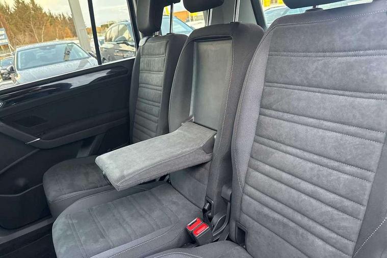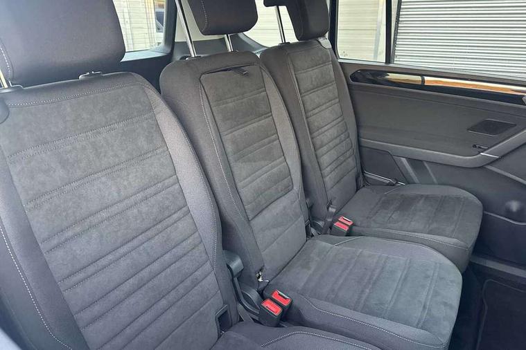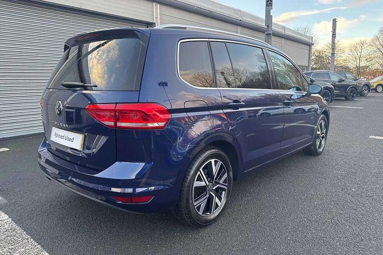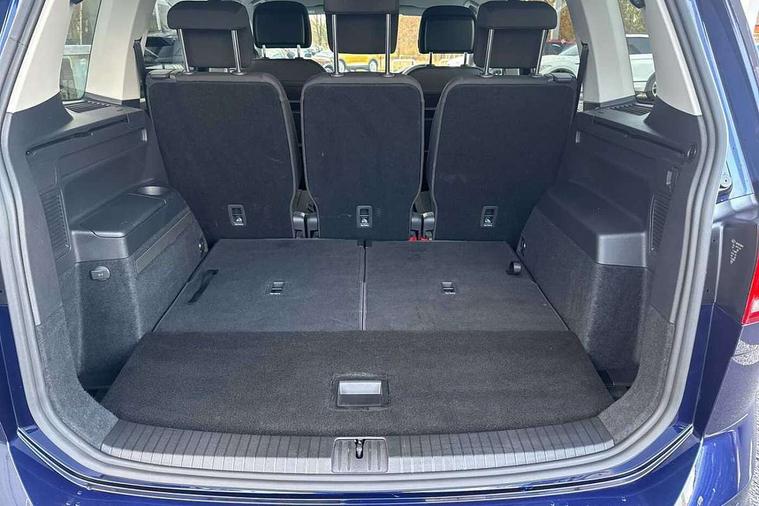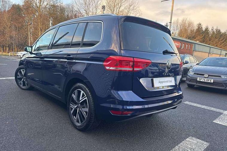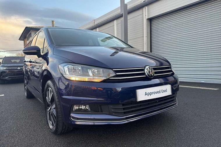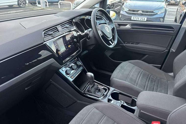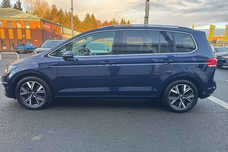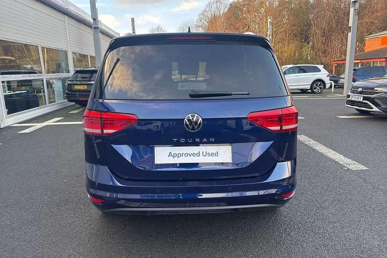 Adaptive cruise control, Audible lights on warning, Bluetooth telephone connectivity, Car information display, Digital cockpit, Discover nav, Euro 2D/3D map view+6.5" colour touchscreen CD + Radio, European map data, Car net guide/inform, Driver alert system, Driver electronic voice amplification function, Driver profile selection, Electronic odometer, Emergency services call system, Extended, crash-active and proactive Pedestrian and cyclist monitoring, External temperature gauge, Lane change system side assist and rear traffic alert, Lane keep assist, Mobile pairing with SMS function, Multifunction colour display, Rev counter with fuel gauge, Speed limiter, Speed sensitive power steering, Stop/start system, Think blue trainer driver tips and journey analysis, Trip and service interval display, Wireless app connect, Petrol Particulate Filter, XDS electronic differential lock, 4x20 watt output, 8 Speakers, Audio Connectivity System, DAB Digital radio, External USB-C data socket with increased charging performance - 2 USB sockets 45W, MP3/WMA compatability, SD card slot, Title and cover art display, USB connection, Aerial integrated into side window, Auto dimming door mirrors, on driver side, surround lighting and front passenger side mirror lowering function, Auto dimming rear view mirror, Automatic coming/leaving home lighting function, Body colour bumpers, Body colour door handles, Body colour door mirrors with integral indicators, Chrome fog light surround, Chrome lower front bumper insert, Chrome trimmed front air intake surrounds, Chrome trimmed radiator grille louvre inserts, Chrome trimmed side windows, Dusk sensor + auto driving lights, Front and rear electric windows, Front fog lights with static cornering function, Fully galvanised body, Gloss black finish B pillar, Green tinted heat insulating glass, High level third brake light, Rain sensor, Rear side wing doors, Rear tinted glass from B-pillar backwards approx 65% tinted, Rear wash/wipe with intermittent wipe setting, Silver roof rails, Tailgate wiper- reverse gear activation, Twin chrome exhaust tailpipes, Volkswagen roundel, Windscreen wipers intermittent wipe, 12V power point for Row 2, 12V socket in luggage compartment, 2 individual fold flat 3rd row seats, 2 three point seatbelts in 3rd row, 2nd row centre armrest, 2nd row centre seat converts into table, 3 single slide/fold/removable 2nd row seats, 3 spoke steering wheel, 3 Zone electronic climate control with automatic air recirculation, 3x3 point seatbelts on 2nd row with height adjust on outer seats, 4 boot load lashing points, 4 way adjustable front head restraints, 5 headrests, Ambient lighting in door trim and foot well, Art velour/Microfibre cloth upholstery, Driver and front passenger under seat drawer, Dust/pollen filters, Foldable front passenger seat backrest, Front + rear carpet mats, Front and rear reading lights, Front centre armrest with storage compartment, Front comfort seats with lumbar support, Front cupholders x 2, Front passenger seat height adjust, Front seat storage pockets, Front seatback folding tables, Height adjustable driver's seat, Height/reach adjust steering wheel, Illuminated glovebox, Illuminated vanity mirrors, Instrument lighting white adjustable panel illumination with red night time illumination, Interior light with delay, Isofix on 2nd row outer seats, Isofix on 3rd row seats, Large storage compartment in roof console, Leatherette on rear of front seats, Low tunnel 2nd row seat, Luggage compartment lighting, Media box in dashboard on passenger side, Multi storage in passenger/luggage areas, Multi-function centre console with storage facilities, Multifunction leather trimmed steering wheel including leather trimmed gear knob with 3.5" screen with multifunction computer, Retractable luggage cover, Split folding rear seat backrests, Storage bins on all doors, Mirror pack - Touran, 3 point height adjustable front seatbelts, Auto hold function, Automatic post collision braking system, Door open warning reflectors, Driver/Front Passenger airbags, Drivers knee airbag, EDL + ASR, Electrically operated child locks on rear doors, Electronic parking brake, Energy recovery system, ESC with ABS, First aid kit, Front and rear (row 2) curtain airbags, Front assist including city emergency braking, Front seat side impact airbags, Front seatbelt pretensioners, Front/rear disc brakes, Hill hold control, Hydraulic Brake Assist (HBA), Loose wheel warning function, Passenger airbag deactivation system, Pre crash preventive occupant protection, Proactive passenger protection system with front and side assist, Rear child proof door locks, Seatbelt warning lamp and buzzer, Traction control, Two tone horn, Warning triangle, Alarm with remote central locking and interior protection, Electronic engine immobiliser, Chrome plated instrument surrounds, Piano black decorative inserts, 17" Alexandria alloy wheels with self sealing tyres and anti-theft wheel bolts, Run flat tyres,