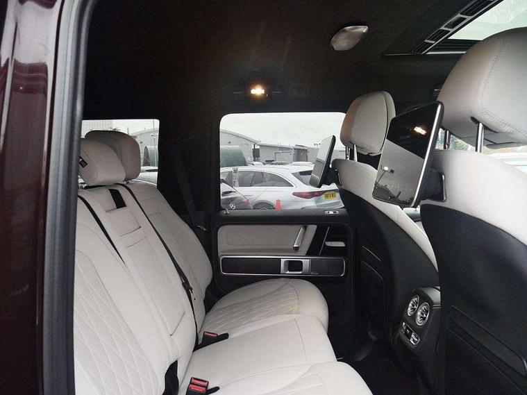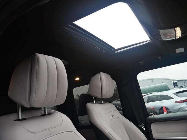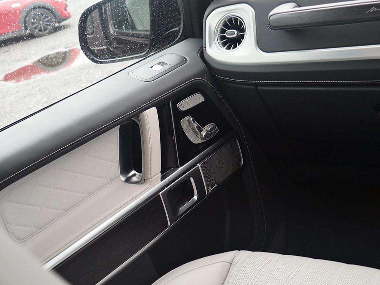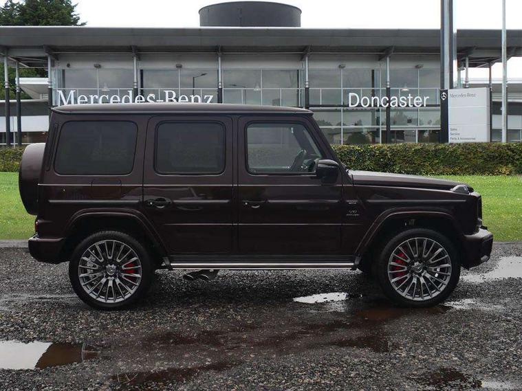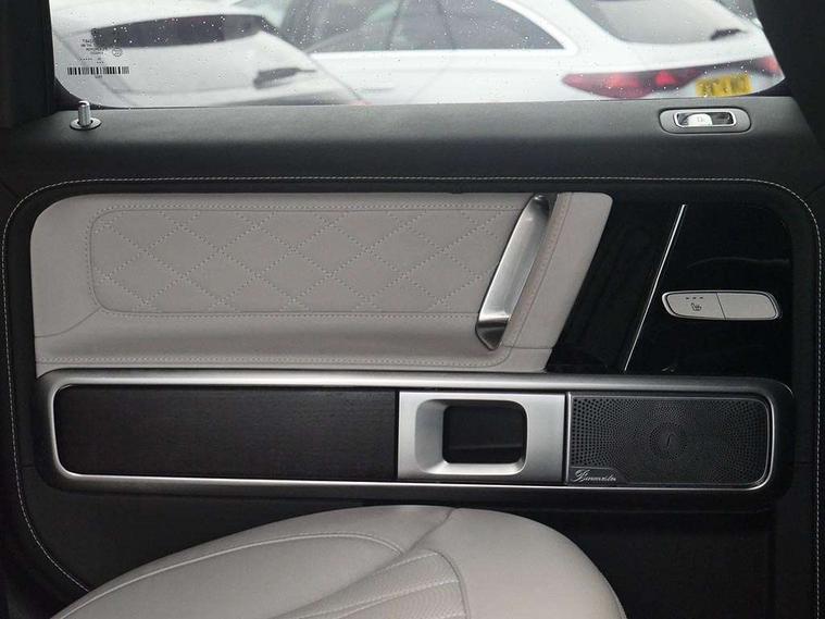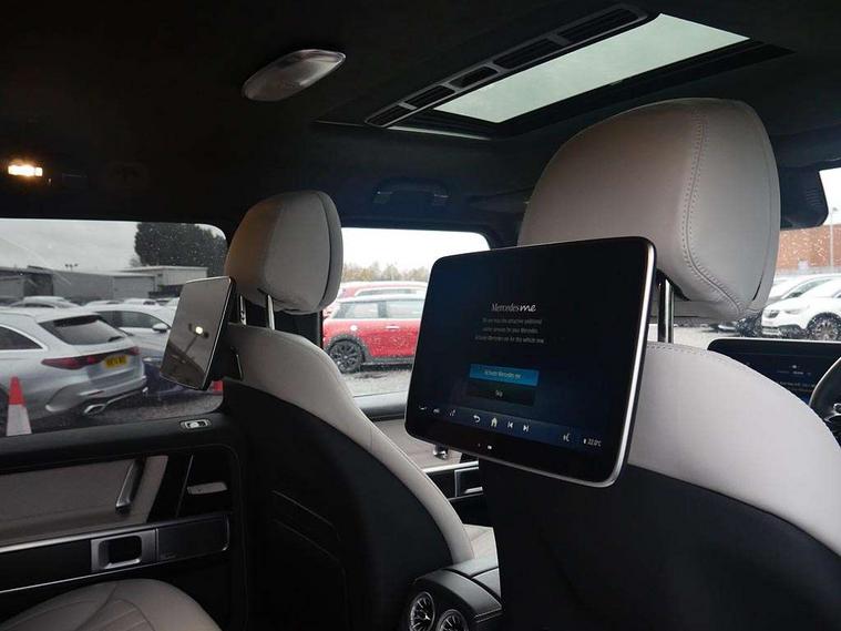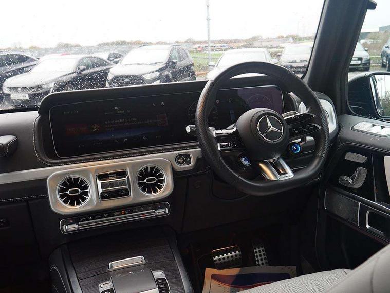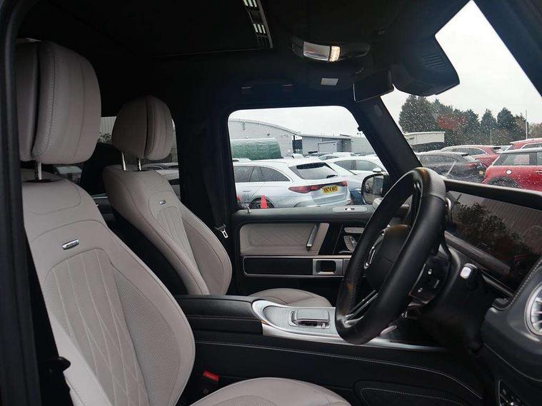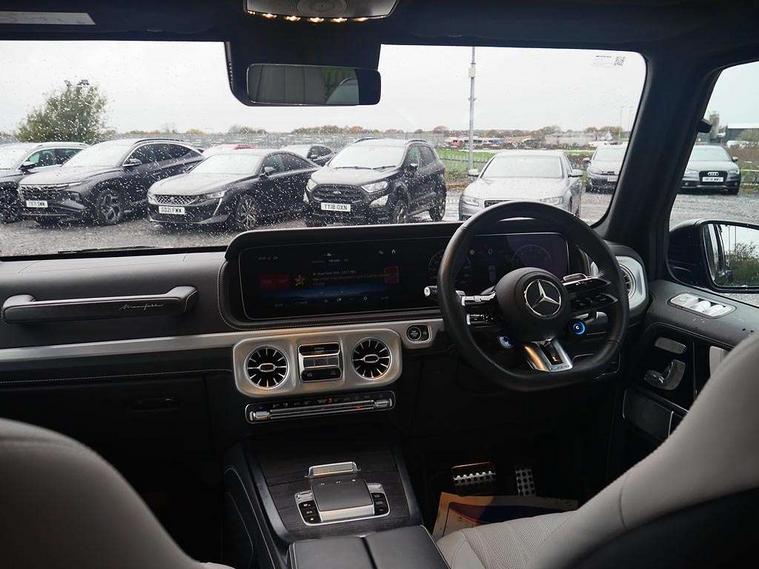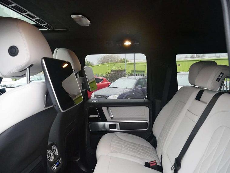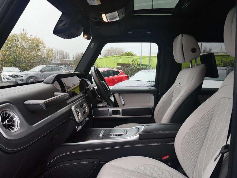 360 degree parking camera, Active parking assist with PARKTRONIC, AMG instrument cluster with dual bonded 12.3" widescreen displays, AMG specific IWC design analogue clock, Attention assist, Bluetooth interface for hands free telephone, Communications module (LTE), MBUX augmented reality for navigation, Mercedes connect me, Mercedes-Benz emergency call, PAS, Passive person presence reminder, Remote Services Premium, Service indicator (ASSYST), Smartphone integration with Apple CarPlay and Android auto, Trip computer, Widescreen cockpit with dual bonded 12.3" widescreen displays, Wireless charging, 4MATIC permanent four wheel drive, AMG Active Ride Control suspension, AMG SPEEDSHIFT 9G Tronic sports transmission with cruise control and variable speed limiter, Differential lock, Low range gear reduction (Electronically selectable while driving), Petrol Particulate Filter, 2 USB ports in the rear, Aux-in socket, Burmester 3D surround sound system, DAB digital radio module, MBUX multimedia system, Sound personalisation, 3rd brake light, Adaptive highbeam assist plus - automatic low high beam switching, AMG bodystyling with exclusive Mercedes AMG G 63 front aprons with cooling air intakes and AMG flared wheel arches in vehicle colour, AMG Crest on engine hood, AMG Crest projection in outside mirror, AMG fuel cap, Automatic headlamp activation, Automatically dimming rear view mirror, Bumper insert in stainless steel, Dark tinted heat insulated glass, Door mirrors - Electrically adjustable/heated/integrated indicators, front area lighting and automatically dimming driver's mirror, Electric sunroof sliding, with one-touch opening, Front and rear electric windows, Heated windscreen, LED daytime running lights, MANUFAKTUR logo projector in exterior mirror, Multibeam LED headlights with anti-dazzle feature, Privacy glass - Dark glass from B-pillar backwards, Rain sensor windscreen wipers, Rear side wing doors, Rear wiper, Towbar, Trailer coupling with ESP trailer stabilisation, Transparent Bonnet, Underguard in silver, V8 BITURBO lettering, 1/3 to 2/3 split folding rear seats, 12V socket in centre console, rear and load compartment, 2 cup holders in front and rear, 3 seat bench in 2nd row, Ambient lighting with 64 colours and projection of brand logo, AMG floor mats with AMG lettering, AMG Performance steering wheel in nappa leather, AMG steering wheel buttons, Centre armrest between front seats with integrated stowage compartment, Cushion length adjustment with gapless cushion, Designo dinamica microfibre roof lining in Black, Electrically adjustable steering column, with automatic adjustment for entry/exit, Four illuminated stainless steel door sill panels, Front head restraints, Front seats with heated and electrically adjustable, memory function for seats, head restraints, exterior mirrors and steering wheel, Heated front seats, Heated rear seats, Heated steering wheel, Ionisation of interior air including fine particle activated charcoal filter system, Luggage compartment cover, MANUFAKTUR grab handles in leather, MANUFAKTUR instrument panel in two tone nappa leather, Partition net, Rear head restraints, Single front passenger seat, THERMOTRONIC automatic climate control system with 3 climate zones and 3 climate styles - Medium, Diffuse and Focused, Assistance package with PRE-SAFE Impulse side - G Class, Stowage space pack - G class, 3x3 point rear seatbelts, ABS with Brake Assist, Airbags - windowbags, AMG high performance braking system with internally ventilated and perforated brake discs, Driver/Front Passenger airbags, Electronic four wheel traction control, ESP with ASR, Front side airbags, Hill start assist, i-Size child seat attachment system for the outer rear seats, PRE-SAFE system for preventive occupant protection, Rear door child safety locks, Rear side airbags, Red painted AMG brake calipers, Seat belts, 3-point design in black, Seatbelt pretensioners, Tyre pressure monitoring system, Anti-theft alarm system/interior protection with tow-away protection and interior monitoring systems, Dashcam, Guard 360 degree vehicle protection plus, Immobiliser, Keyless Go starting function, G MANUFAKTUR Black flamed open-pore ash wood trim, Full size spare wheel,