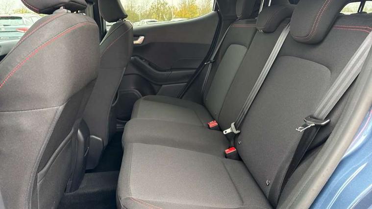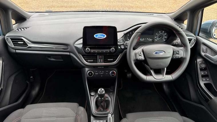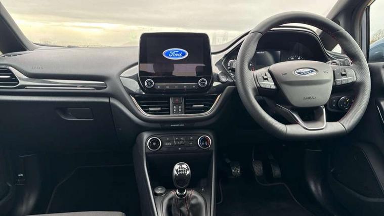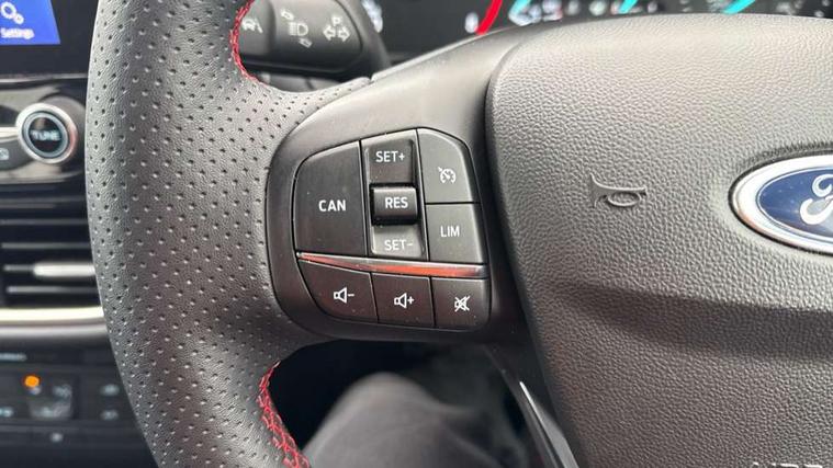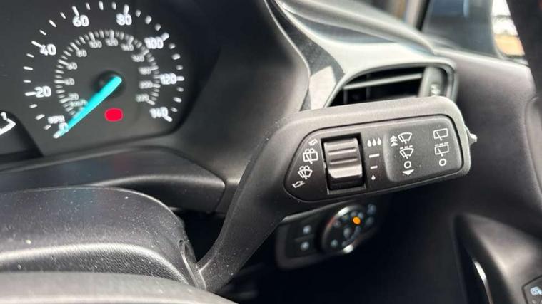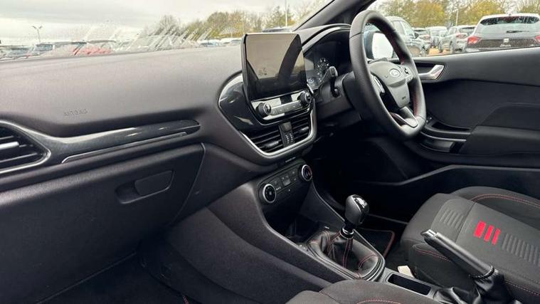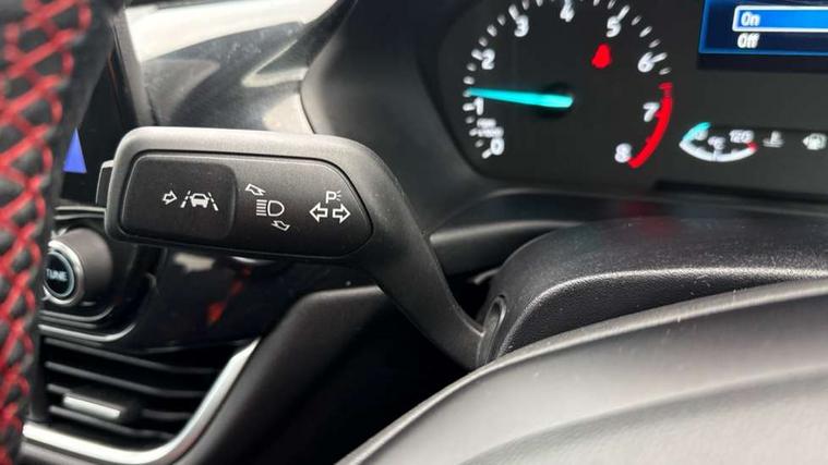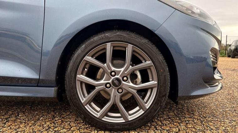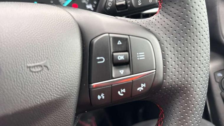 4.2" Colour TFT Ice blue illumination analogue cluster, Driver alert system, Electric power steering, Ford easy fuel, Lane keep assist, Lane keeping aid, Rear parking distance sensors, Selectable drive modes (Normal, Sport, Track), Trip computer, Sports suspension, 3rd brake light, Auto high beam, Automatic headlights, Body colour bumpers, Body colour large rear spoiler, Body coloured electrically operated with side indicators, Electric front windows/one touch facility, Electric rear windows, Quickclear heated windscreen, Rain sensing wipers and auto dimming rear view mirror, Rear privacy glass, Rear side wing doors, Rear wiper, Unique ST-Line grille, full bodystyling kit and large body coloured rear spoiler, 3 rear headrests, 3 seat bench in 2nd row, Adjustable head restraints, Black headlining, Centre console with opening armrest, 2x cupholders, 12v and USB, Cloth upholstery with red stitching, Leather gear knob, Manual 2 way passenger seat adjust, Manual 4-way driver seat adjust, Manual air conditioning, Premium floor mats, Sensico wrapped steering wheel, Single front passenger seat, 3 point seatbelts on all rear seats, Electronic stability control with hill start assist, Front and rear seat belt warning, Manual child lock in rear doors, Tyre pressure monitoring system, Keyless start with 'Ford Power' starter button, MyKey system, Remote central locking, Thatcham alarm with power door dead locks, 17" 5x2 spoke alloy wheels with rock metallic finish,