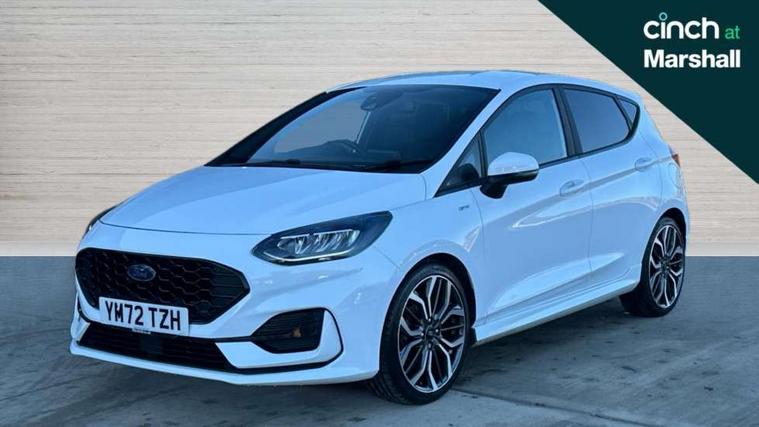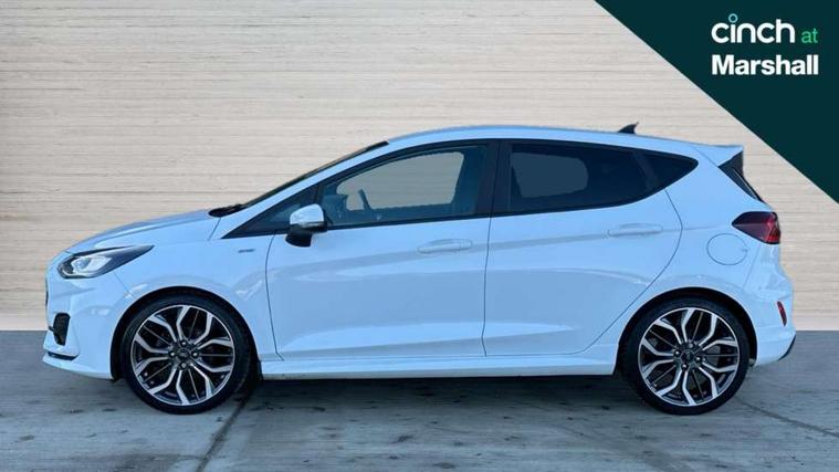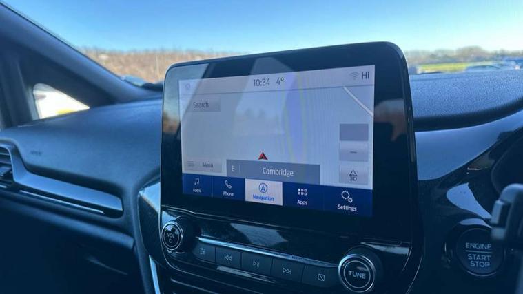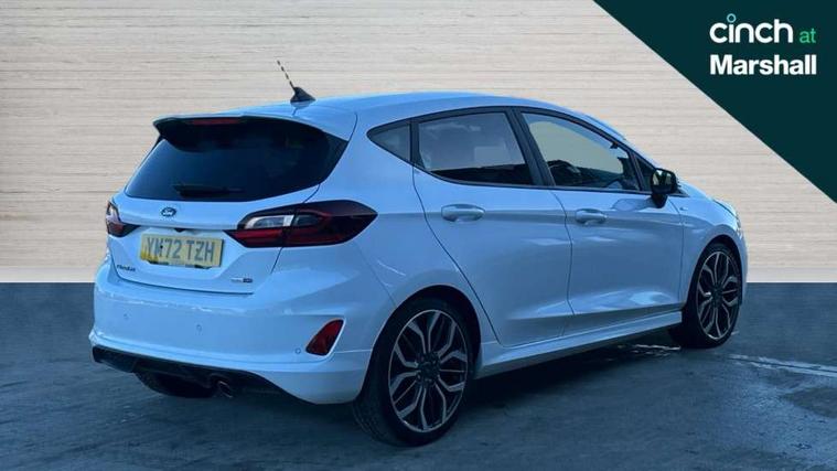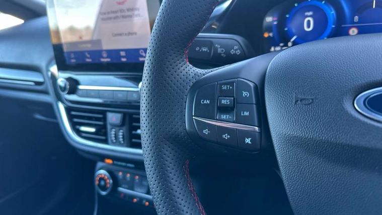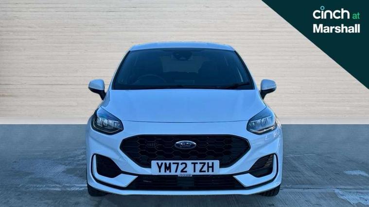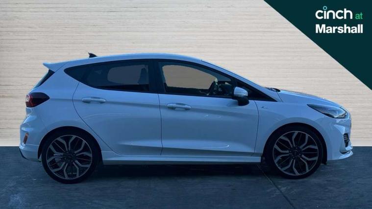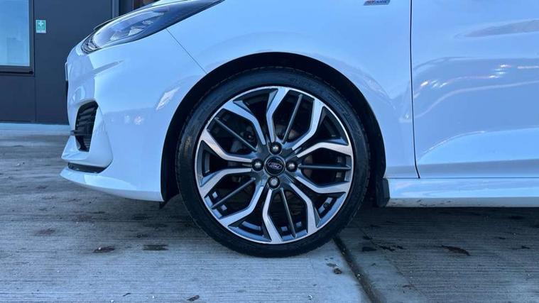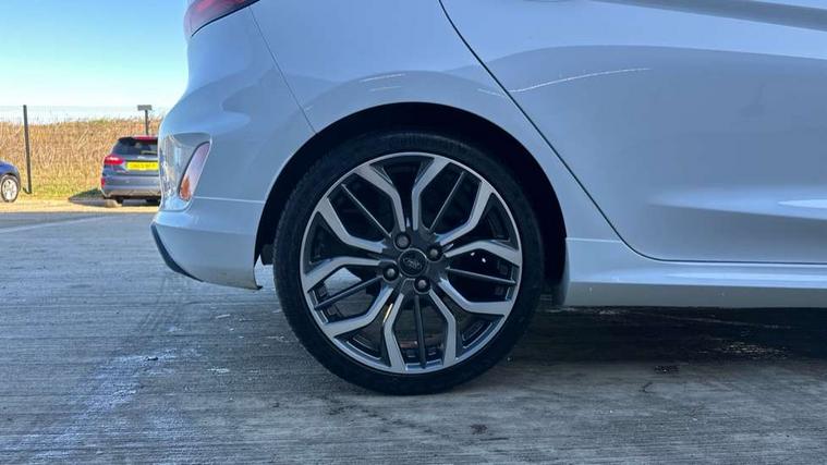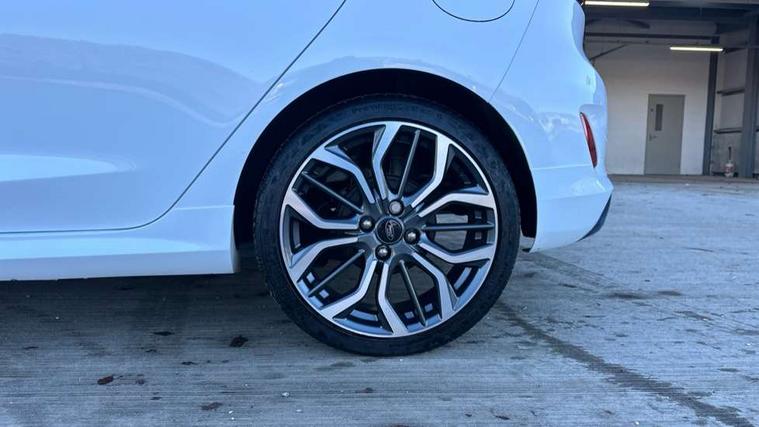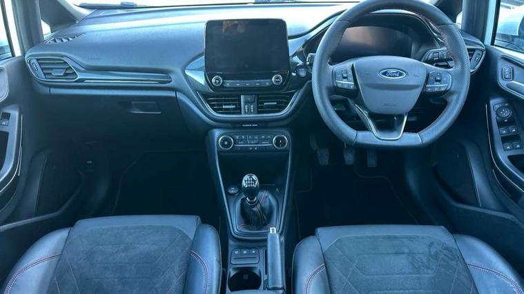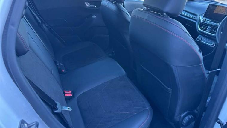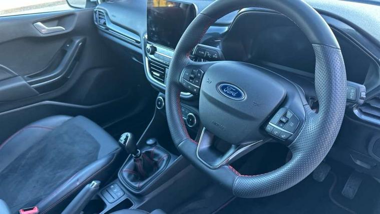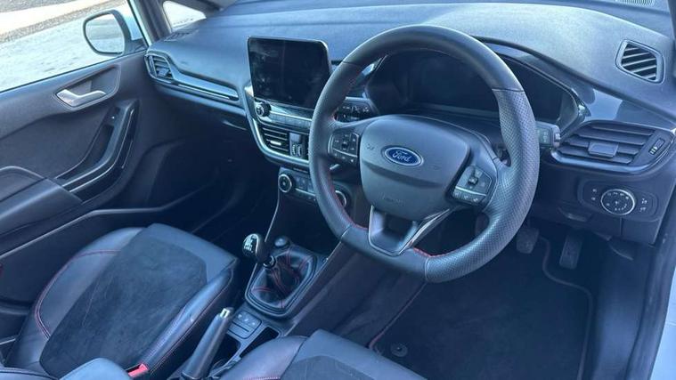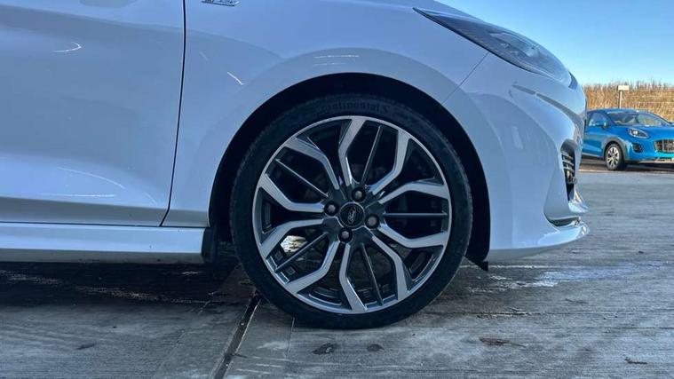 4.2" TFT instrument cluster screen, Bluetooth system, Electric power steering, Ford easy fuel, Rear parking distance sensors, Selectable drive modes (Normal, Sport, Track), Traffic sign recognition, Trip computer, Sports suspension, 2 USB ports, Auxiliary input socket, B&O Premium audio system with 8" touchscreen, 10 speakers, 360 degree sound system, Ford SYNC 3 navigation system and Ford pass connect, DAB Digital radio, Steering wheel mounted controls, Auto high beam, Body colour bumpers, Body colour door handles, Body colour large rear spoiler, Body coloured electrically operated and heated door mirrors with side indicators, Cornering front fog lights, Electric front windows/one touch facility, Electric rear windows, LED Night signature to rear lights, Power foldable door mirrors with puddle lights, Quickclear heated windscreen, Rain sensing wipers and auto dimming rear view mirror, Rear privacy glass, Rear wiper, Unique ST-Line upper grille & full bodystyling kit with ST-Line wing badges, 3 spoke flat bottomed leather steering wheel, 60/40 split folding rear seat, Adjustable head restraints, Black headlining, Boot carpet, Centre console with opening armrest, 2x cupholders, 12v and USB, Chrome inner door handles, Drivers and Passenger lumbar support, EATC - Electronic Auto Temperature control, Footwell illumination, Front floor mats in velour, Front map reading lights, Front seat and rear pockets, Height adjustable passenger seat, Illuminated glovebox, Leather gaiter, LED ambient lighting, Load area light, Manual 4-way driver seat adjust, Overhead console with sunglasses holder, Pollen filter, Rake/reach adjustable steering wheel, Sensico wrapped steering wheel, Sports front seats, NCAP Pack - Fiesta, ST-Line X Trim Pack - Fiesta, 3 point seatbelts on all rear seats, ABS+EBA, Curtain airbags, Driver and passenger airbags, Drivers knee airbag, Electronic stability control with hill start assist, Front passenger airbag deactivation, Front side airbags, Seatbelt warning, Two tone horn, Tyre pressure monitoring system, Ford keyfree system with Keyless entry and keyless start, MyKey system, Remote central locking & engine immobiliser, Thatcham Cat.1 alarm, 18" 5 spoke alloy wheels with rock metallic machined finish,