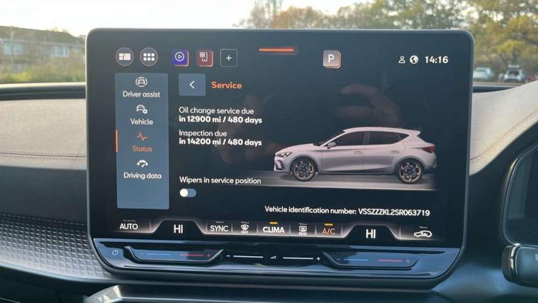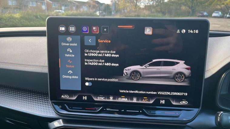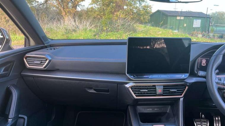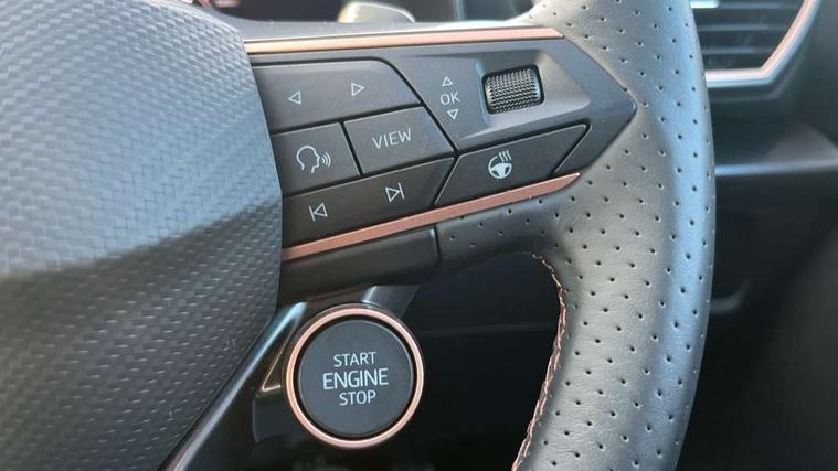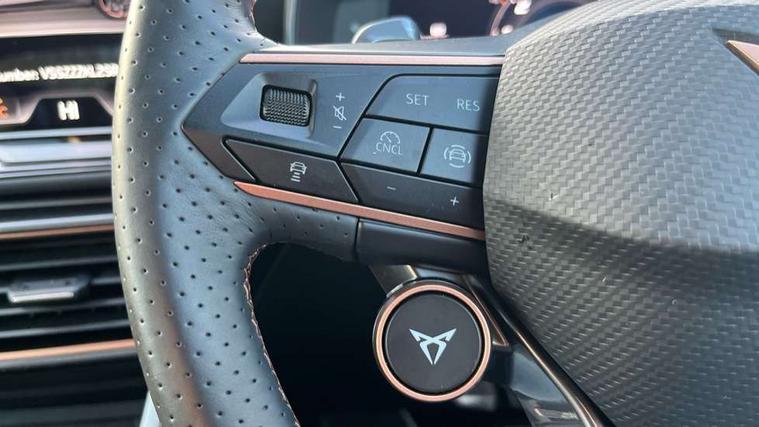 Adaptive cruise control with follow-to-stop and speed limiter, CUPRA drive profile selection with (Comfort/Sport/Individual), throttle response and gearshift mode, Digital cockpit, Dynamic road sign display, E-call, Four x USB Type C ports (2 in front and 2 in rear), Front and rear parking sensors, Front assist with forward collision warning braking reaction to vehicles, pedestrians and cyclists, Full link smartphone integration with Mirror Link, wireless Apple CarPlay and wired Google Android Auto, Lane assist, Lockable tailgate, PAS, RPM, trip computer, outside temp gauge, instrument light brightness, low fuel warning light, lights on reminder, gearshift indicator, Service interval indicator, Start/stop system with regenerative braking, Wireless phone charger, 7 speakers, Auxiliary input socket, Auto dimming rear view mirror, Body colour door handles, Body coloured bumpers, Cupra sports bumpers, Dark tinted rear windows, Electric front/rear windows, Electrically adjustable, heated and folding door mirrors, High beam assist, LED front fog lamps with cornering function, LED headlights with dynamic turn signals, tail lights, rear fog lights with rear coast to coast lighting, LED rear fog lamp, Rain sensing wipers, Rear side wing doors, Rear wash/wipe, Separate daytime running light with automatic headlight control and coming home feature, Third brake light, Welcome light with logo projector in door mirrors, 12v power supply in centre console, 3 seat bench in 2nd row, 5 headrests, 60/40 split rear bench seat with armrest, Ambient lighting with glovebox, footwell and single monocolour, Black headlining, Cloth/PVC upholstery, Cupra sports pedals, CUPRA Supersports, heated steering wheel with satellite buttons, Driver and passenger seat with manual height and lumbar adjustment, Folding boot cover, Front and rear reading lights X 4, Front centre armrest, Height/reach adjust steering wheel, Illuminated interior front door sills, ISOFIX points in outer rear seats with top tether anchorage points, Single front passenger seat, Storage pockets on rear of front seats, Sunvisors with illuminated mirror, Three zone climate control, Media system plus with 12.9" display + navigation pack - Leon Cupra, 3 point seatbelts on all rear seats, ABS, Brake control system - ESC and brake booster, Child proof door locks, Cupra black brake calipers, Driver and front passenger airbags with front passenger airbag de-activation, front side and curtain airbags, Electronic parking brake, Hill hold control, Rear disc brakes, Seat belt reminder for front and rear seats, Tiredness recognition system, Tyre pressure monitoring system, Anti theft alarm system with interior monitoring in cab, backup horn and towing protection, Central locking system Keyless Go, Locking wheel bolts, Chrome and copper interior detailing, 18" Windstorm machined sport black matt and silver alloy wheel with 92Y XL tyres, Tool kit,