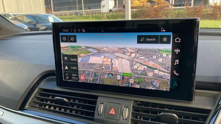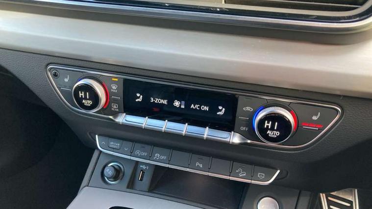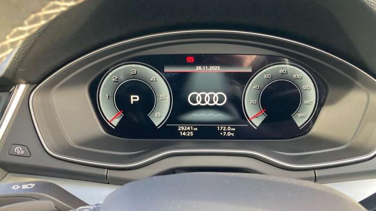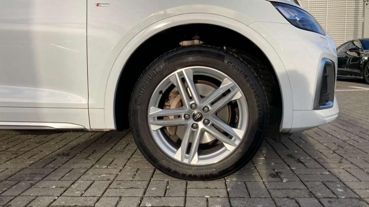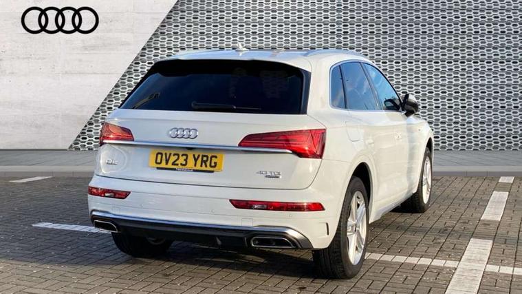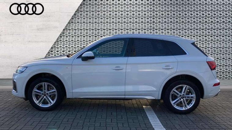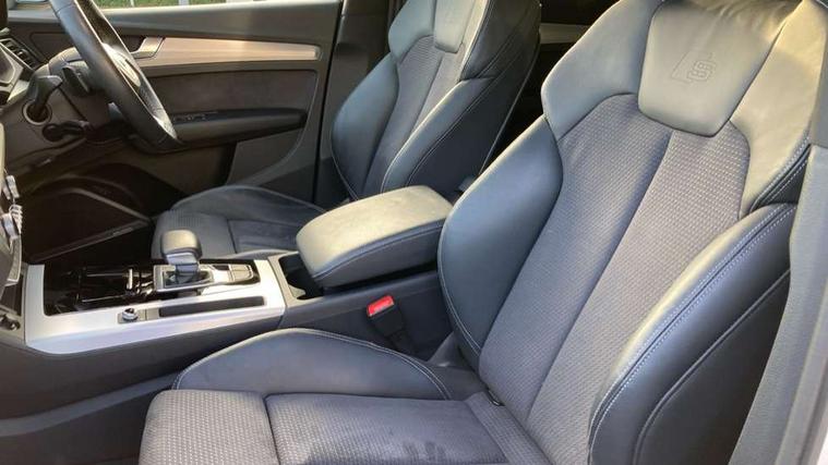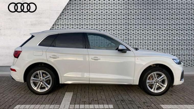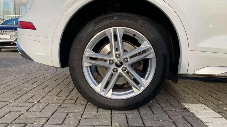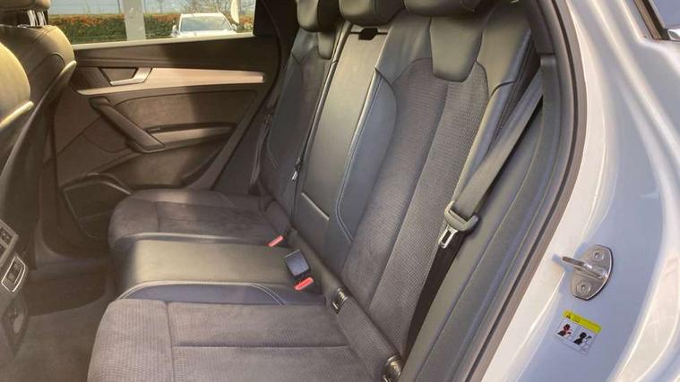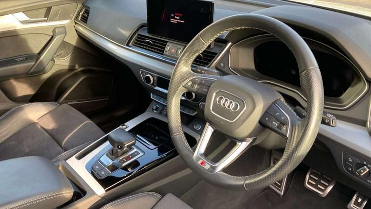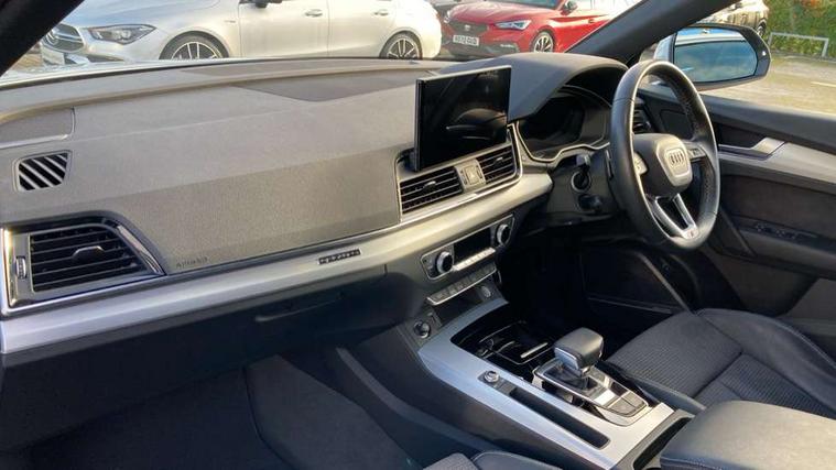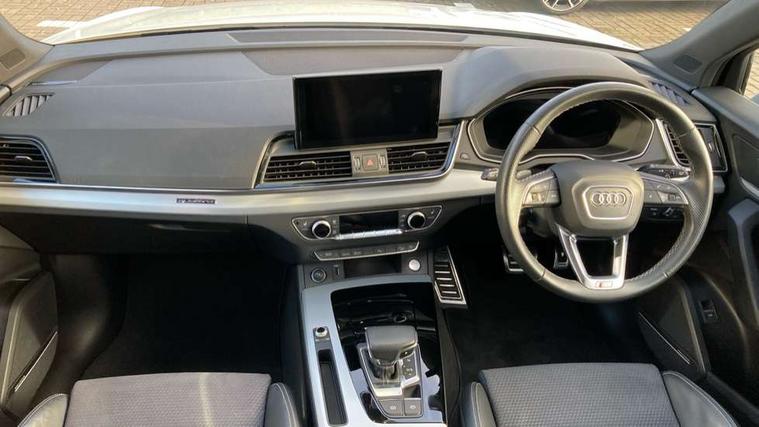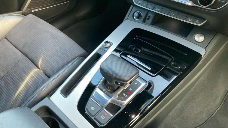 Acoustic front and rear parking sensor, Audi connect safety and service (e-call), Audi connect with Amazon Alexa Integration, Audi drive select, Audi virtual cockpit plus with 12.3" screen and three different layout designs, Audi wireless smartphone interface, Automatic start-stop system with coasting functionality and efficiency programme, Bluetooth interface, Electro - mechanical power assisted steering, MMI navigation plus with 10.1" touch screen, Power tailgate, Reversing camera, Service interval indicator, Voice control system with Audi hotword activation "Hey Audi", Diesel particulate filter, Quattro on demand, S line sports suspension, 2 x USB charging port with aux input socket, 8 loudspeakers, DAB Digital radio, Acoustic windscreen, Aluminium roof rails, Audi matrix LED headlights with dynamic front and rear indicators, Auto dimming door mirrors, Auto dimming frameless rear view mirror, Automatic headlight adjustment, Automatic headlights and windscreen wipers, Body colour bumpers, Body colour door mirrors, Body colour rear diffuser with matt aluminium silver surrounds, Body colour underbody protection, Chrome plated exhaust trims, Daytime running lights, Door sills in Selenite silver, Electric adjustable/heated/folding door mirrors, Front air inlet surrounds in aluminium, Front and rear electric windows, Front radiator grille in honeycomb design, Headlight washers, High level LED brake light, Lower bumpers painted in contrast Manhattan grey, Rear chrome trim strip below lights, Rear privacy glass and rear side windows, Rear side wing doors, Rear wiper, Roof bars, S Line badges on the front wings, S Line front and rear bumpers, S Line rear spoiler, S Line side skirts, 3 rear headrests, 3 spoke leather multifunction steering wheel with S badging perforated leather grips, 40:20:40 split folding 3 rear bench seat in 2nd row with rear centre armrest, Black cloth headlining, Comfort front centre armrest, Contrast stitching on seats, steering wheel and gear lever gaiter, Deluxe 3 zone electronic climate control, Front/rear floor mats, Gear lever in black leather, Heated front seats, Height adjustable front head restraints, Height/reach adjustable steering column, Illuminated door sill trims with S logo, Luggage compartment cover, Manual seat adjustment with 4-way electric lumbar support, Removable luggage compartment floor, Single front passenger seat, Stainless steel pedals, Sunvisors with vanity mirrors, High gloss pack - Q5, LED interior light pack - Q5, 3 point seatbelts on all seats, 6 airbags - Driver, front passenger, curtain and side airbags, Electrically operated child locks on rear doors, Electromechanical parking brake, Electronic stabilisation control including ABS, ASR and EDL, First aid kit with warning triangle and vests, Front passenger airbag deactivation, Hill descent control, Hill hold assist, ISOFIX child seat mounting for front passenger seat and ISOFIX child seat mounting with Top Tether for outer rear seats, Multi collision brake assist, Pop-up bonnet for pedestrian protection, Pre sense city, Seat belt force limiter, Seatbelt monitoring, Tyre pressure warning, Anti theft alarm, Anti-theft wheel bolts, Keyless Go access/ignition system, Remote central locking, Air vents inserts and centre console in gloss black, Matt brushed aluminium inlays,