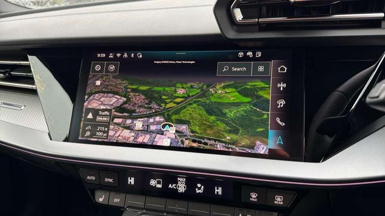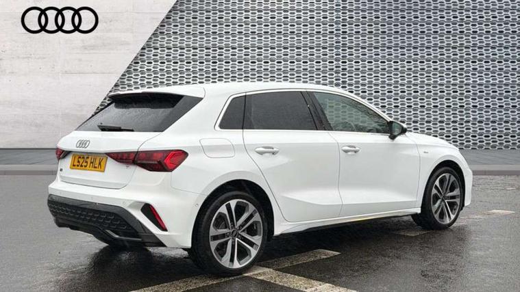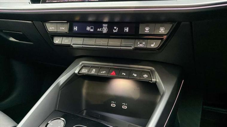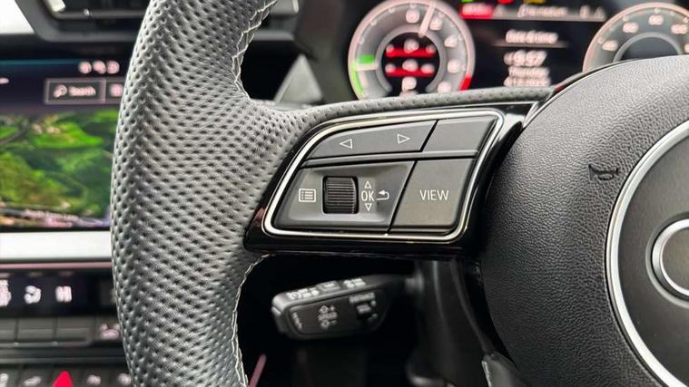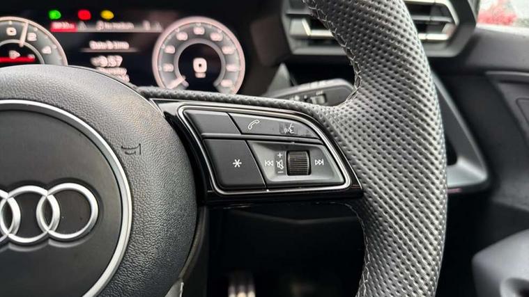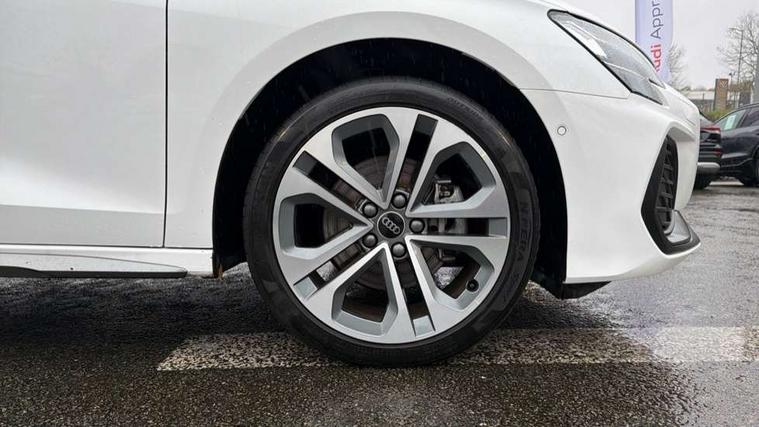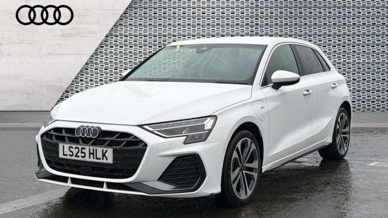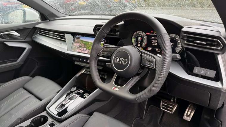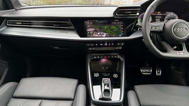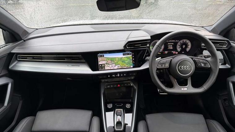 Adjustable speed limiter, Audi drive select, Audi smartphone interface with app store includes wireless Apple carplay, Android auto and Amazon alexa integration, Audi virtual cockpit plus - 12.3" full HD resolution dynamic digital instrument cluster, Automatic start/stop system with recuperation, Bluetooth interface, Camera based traffic sign recognition, Collision avoidance assistant, Cruise control, Distraction and Fatigue warning, e-Call (emergency call), Electromechanical power speed sensitive steering, Lane departure warning system, MMI Navigation Plus with high resolution 10.1" colour touch screen display, Park Assist with parking system Plus, Service indicator, Trip computer, Voice control system with natural language interaction, 3 pin 10 amp domestic charging cable, CCS socket for DC charging, Charging cable for public charging, mode 3 (type 2), up to 22 kW (AC), Compact charging system, Industrial connector CEE 32 A, 230 V, length 1.6 m, Standard suspension, Type 2 socket for AC charging, Audi Phonebox light with wireless charging, Audi sound system - 10 loudspeakers including centre loudspeaker and subwoofer, DAB Digital radio, USB ports with charging function in the rear, Acoustic glass windscreen, Aluminium window trim, Auto dimming frameless rear view mirror, Body colour exterior mirrors, Chrome exhaust tailpipes, Electrically adjustable/heated/folding/auto dimming door mirrors with integrated LED indications + kerb view function for passenger side, Exterior model badging, Front and rear side air inlets in grained matt black with dark liquid chrome frame, Front electric windows, Front radiator grill in high gloss dark chrome, Heat insulating glass windscreen, Illuminated door sills with aluminium inserts at the front with S logo, LED 3rd brake light, LED daytime running lights, LED headlights with LED rear lights and dynamic rear indicators, Light and rain sensors, Privacy glass - dark tinted rear window, rear door and side windows, Rear diffuser and grill in grained matt black with inlay in dark liquid chrome, Rear electric windows, Rear side wing doors, Rear wiper, S line bumpers, S roof spoiler, Side S line emblems on front wings, Side sill trim in dark liquid chrome, 12V socket and storage compartment in front centre console, 3 seat bench in 2nd row, 3 spoke flat bottomed leather multifunction sport steering wheel with gear shift paddles, 3-zone deluxe automatic air conditioning, 4 way electrically adjustable lumbar support for driver and front passenger, 40/20/40 split folding rear seat bench, Black cloth headlining, Convenience auxiliary air conditioning, Front and rear centre armrest in artificial leather, Front and rear centre armrest in artificial leather with contrasting stitching on armrests and instrument panel, Front and rear headrests, Front/rear floor mats, Heated front seats, Height and reach adjustable steering wheel, Manual boot compartment lid, Manually adjustable front seats, Rear cup holders, S badging on the steering wheel, Seat side bolsters, Single front passenger seat, Stainless steel pedals and front footrest in black, Twin leather upholstery with front sports seats S embossed logo, Aluminium interior elements pack - A3 Sportback, Multi-coloured LED interior lighting package - A3, 3x3 point rear seat belts, Acoustic vehicle alerting system, Driver and front passenger airbag with passenger airbag deactivation, Electronic Stabilisation Control (ESC) including ABS, ASR and EDL, First aid kit with warning triangle and 2 safety vests, Front side airbags with head airbags and interaction airbag, Hill hold assist, Pre-sense front with pedestrian and cyclist detection, Seatbelt monitoring, Tyre pressure loss indicator, Anti theft alarm, Anti-theft wheel bolts, Electronically operated child locks, Immobiliser, Remote central locking with safelock, Dash & door Inlay in dark aluminium Spectrum, Tyre repair kit,
