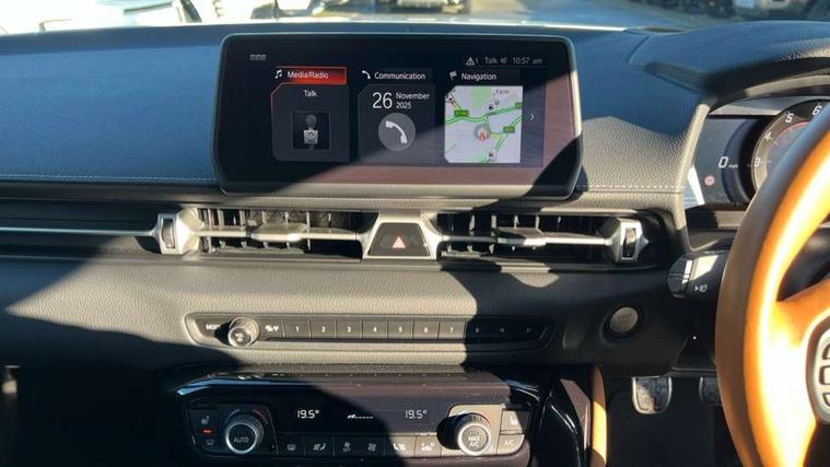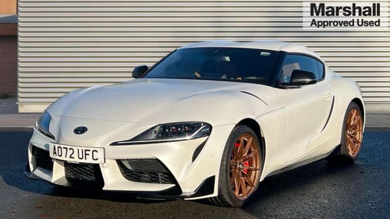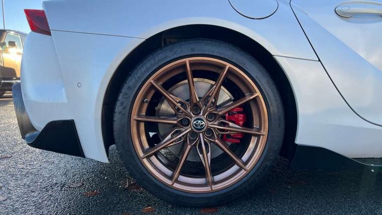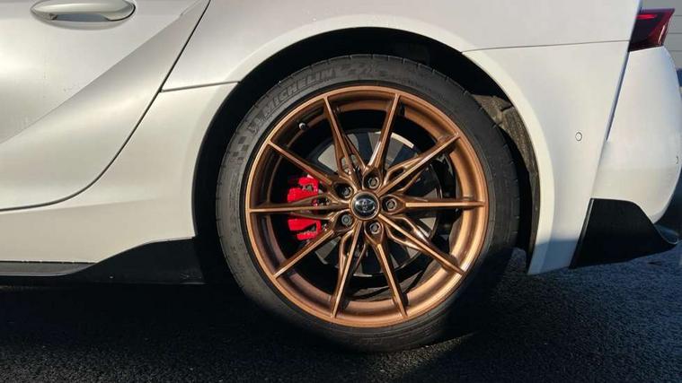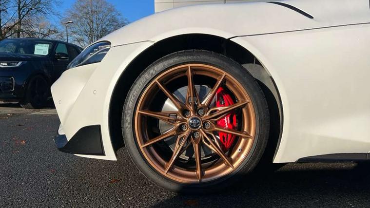Blind spot monitor, Cruise control with steering wheel, Digital speedometer, Drive mode selector, Driver and passenger microphone, Driving assistant, Dynamic guide lines on reversing camera, E-call, Front and rear parking sensors, Head up Display, Lane departure alert with steering control, PAS, Push button start, Rear collision warning, Rear cross traffic alert, Rear view camera, Remote boot door release in cabin, Reversing camera display, Road sign assist - RSA, Service indicator, Smartphone integration with Apple CarPlay, Sport drive mode, Telephone switch on steering wheel, Toyota supra connect, Voice recognition, Wireless charger, Active sports differential, Adaptive variable suspension, Vehicle Stability Control (VSC), 2.1 amp USB connector, 8.8" toyota touch multimedia system, Audio switch on steering wheel, DAB Radio (Digital Audio Broadcasting), Glass integrated antenna, JBL premium sound system with 12 speakers, Toyota touch 2 with go navigation system, Auto adaptive high beam, Auto cut off headlamps, Auto dimming inside rear view mirror, Auto headlights, Automatic headlight levelling, Automatically retractable door mirrors, Boot door release with push button, Brushed stainless steel dual exhaust pipes, Cornering light, Electric heated door mirrors, Electric windows, Electrically adjustable driver and passenger door mirrors with memory function, Electrochrome door mirrors, Follow me home headlights, Indicators integrated on door mirrors, LED daytime running lamp, LED dual beam projector headlights, LED front light guide, LED High mounted stop light, LED Indicators, LED rear fog light, Piano black door mirrors, Premium metallic paint, Rain sensing wipers, Rear window defogger, Rear wiper, Reverse gear tilting passenger door mirror, Variable intermittent windscreen wipers, 12V power outlet - Boot, 12v power outlet - front, 3 spoke leather steering wheel, Active sound control, Adjustable speed limiter switch on steering wheel, Aluminium door scuff plates, Aluminium pedals, Boot light, Chrome insert on centre console, Driver and front passenger personal light, Driver and passenger seatback pockets, Driver seat memory function, Driver/passenger sunvisors and illuminated vanity mirrors, Dual zone automatic air conditioning, Electrically adjustable lumbar support for driver and front passenger, Electrically height adjustable, sliding and reclining front seats, Floor mats, Front cupholders, Front footwell lights, Front headrests, Front sports seats, Gear shift indicator, Heated driver and front passenger seats, Leather upholstery, Luggage holding net, Luggage hooks, Multimedia switches on steering wheel, Power tilting cushion on driver seat, Single front passenger seat, Tilt/telescopic adjustable steering wheel, Tonneau cover, Voice recognition switch on steering wheel, Anti lock braking system (ABS) with brake assist, Child restraint system, Electronic parking brake, Emergency brake light system (EBS), Front seatbelt reminder, Pre-collision system with pedestrian and cyclist detection, Red sports rear brake caliper, Red supra Sports front brake caliper, Start holding control, Supplemental restraint system (SRS) airbags - 7 airbags including driver, front passenger, curtain, side and knee airbags, Traction control, Tyre pressure monitoring system, Immobiliser, Intrusion sensor, Locking wheel nuts, Power door locks, Remote door lock, Smart entry, Speed detecting automatic door lock, Tilt detection sensors, 19" 10 spoke gunmetal grey forged alloy wheels, Tyre repair kit,