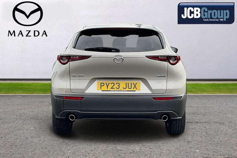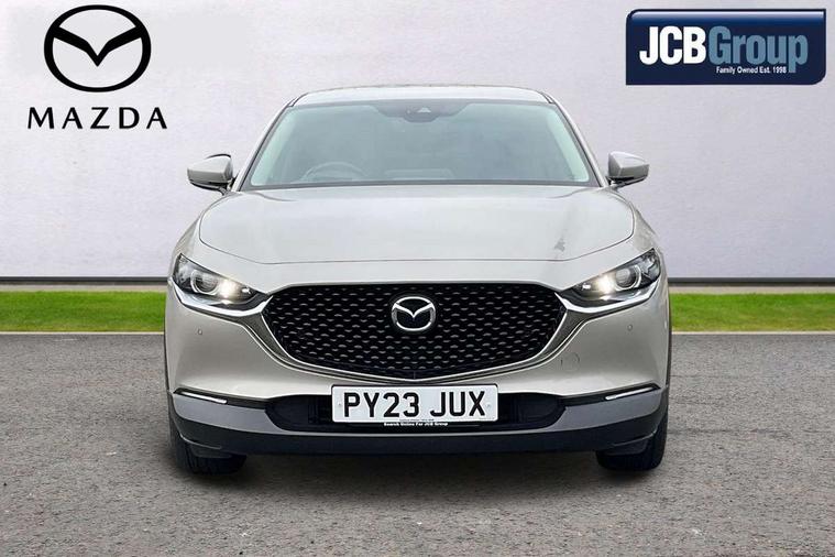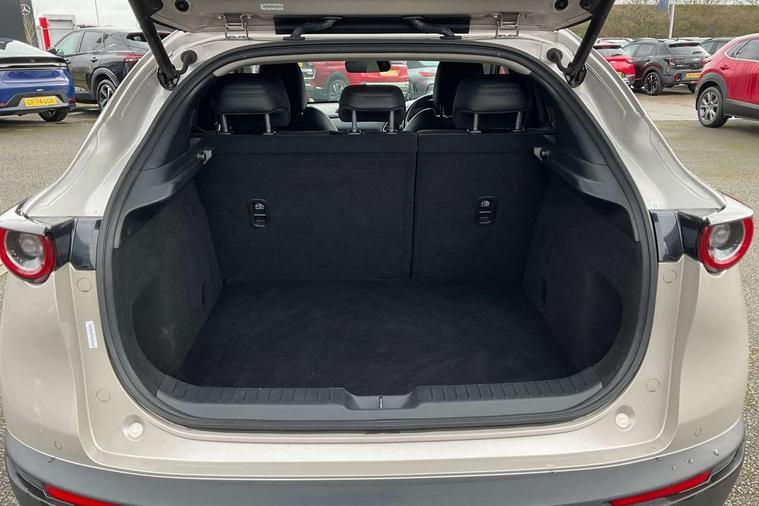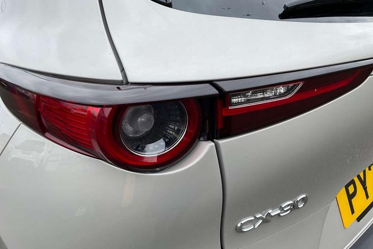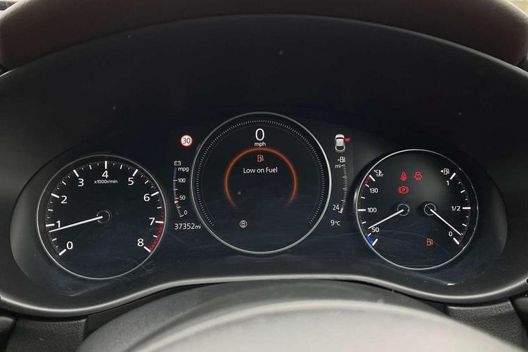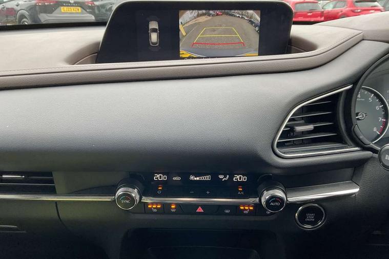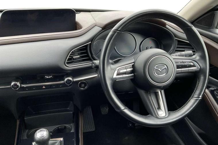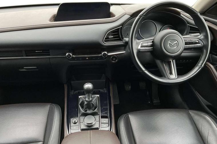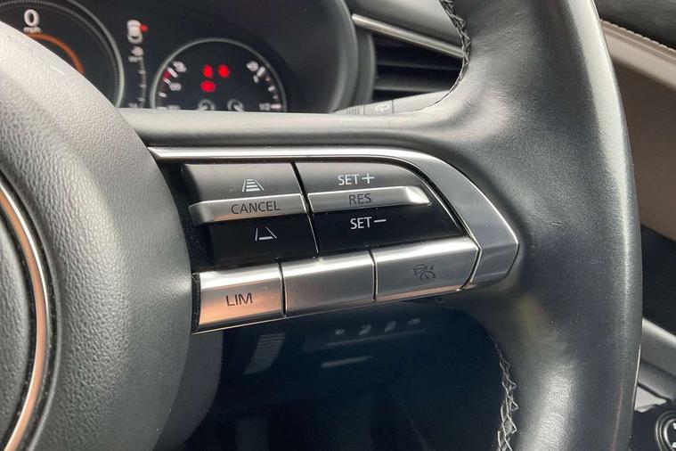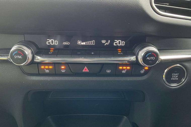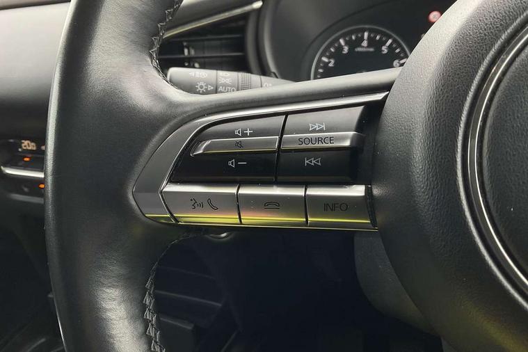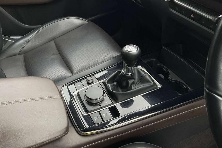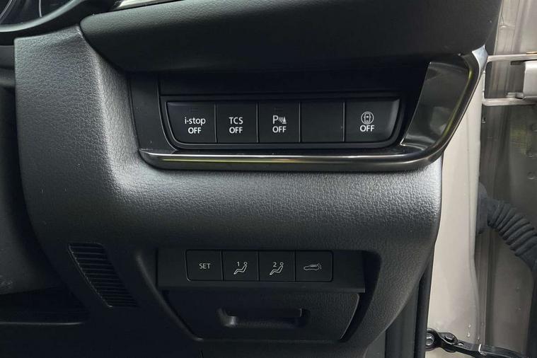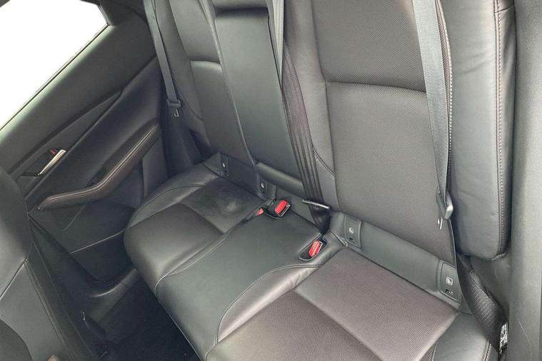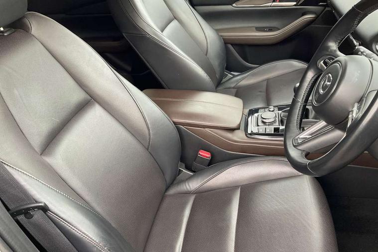 7" TFT Colour driver instrument panel display, 8.8" Colour centre touch screen display with Mazda Connect infotainment, Adaptive cruise control (Mazda radar cruise control), Apple car play/Android Auto, Blind spot monitoring with rear cross traffic alert, Driver attention alert system, E-call with GPS, Emergency stop signalling system, Engine start/stop button, Front and rear parking sensors, Integrated bluetooth, Integrated Mazda navigation system, Intelligent speed assist, Lane keep assist system (LAS) with Lane departure warning system (LDWS), Mazda connected services, PAS, Power lift gate, Reversing camera, Service indicator, Tailgate, Traffic sign recognition, Trip computer, Windscreen projected colour active driving display (HUD), Cylinder Deactivation, i-stop, 2 USB charging ports in front inner central armrest, AM/FM and DAB radio, Bose surround sound system with 12 Speaker, Bose center point, Bass match and audio pilot technology, Multimedia Commander including separate volume dial, Steering wheel mounted audio/bluetooth controls, Auto dimming driver's door mirror, Auto headlight levelling, B-pillar and C-pillar garnishes in piano black finish, Body coloured, electrically adjustable, heated auto power folding door mirrors with integrated indicators, Chrome finish signature wing in front grille, Coming/leaving home lighting function, Door mirrors with adjustable memory and tilt-down function when reversing, Dual chrome exhaust, Dusk sensing headlights, Electric front/rear windows with one touch auto up/down, Frameless auto dimming interior rear view mirror, Front kodo turn signal, Gloss black front grille, Gloss black rear roof spoiler, High beam assist, LED Headlights, LED signature daytime running lights, Privacy glass (rear side windows and rear screen), Rain sensing front wipers with adjustable speed and intermittent wipe, Rear fog lights, Rear side wing doors, Rear wiper, Signature LED rear combination lights, Third brake light, 12V power outlet in centre console, 3 seat bench in 2nd row, 60/40 split fold down rear seats, Chrome horn pad ring, Chrome interior trim accents with steering wheel centre bezel, surround of engine start / stop button and glove box handle, Dashboard, door cards and front centre armrest in rich brown leather, Driver and front passenger visors with covered vanity mirror and driver ticket holder, Driver's seat, power tilt, slide, recline, height and lumbar adjustment, Driver, front passenger and two rear door storage, Driver, Front passenger and two rear grab handles with coathooks, Dual zone climate control air conditioning with rear air vents, Folding rear centre armrest with two cup holders, Front and rear (x3) head restraints, Front and rear LED lighting, Front armrest, Front centre storage with two cupholders with lid, Front passenger seatback pockets, Front passengers seat manual slide, recline and height adjustment, Gear shift indicator, Glovebox illumination, Heated front seats with 3 stage setting, Heated steering wheel, ISOFIX child seat anchorage points attached on outer rear seats, Leather upholstery with interior accents, Leather wrapped gear shift knob, Leather wrapped steering wheel with telescopic and tilt adjustment, LED luggage compartment lighting, Light roof headlining and pillars, Rear armrest inner material in cloth, Roof mounted sunglasses holder, Single front passenger seat, 3 point ELR front seat belts x2 with pretensioners, 3 point ELR rear seat belts, Anti-lock braking system (ABS), Drivers knee airbag, DSC - Dynamic Stability Control, Electronic parking brake with auto disengage function and auto hold function, Front and rear curtain airbags, Front dual stage driver and single stage front passenger airbags, Front passenger airbag cut-off switch, Front side airbags, Front smart city brake support, G-Vectoring control plus, Hill launch assist, Manual child lock in rear doors, Mild Hybrid system with regenerative braking, Seatbelt reminder for driver/front passenger and rear seats, Traction control system (TCS), Tyre pressure monitoring system (TPMS), Remote central locking with deadlocking and automatic door lock when driving, Smart keyless entry, Thatcham accredited alarm and immobiliser, Dark vinyl door panel inserts, 18" Silver alloy wheels, Emergency tyre repair kit,