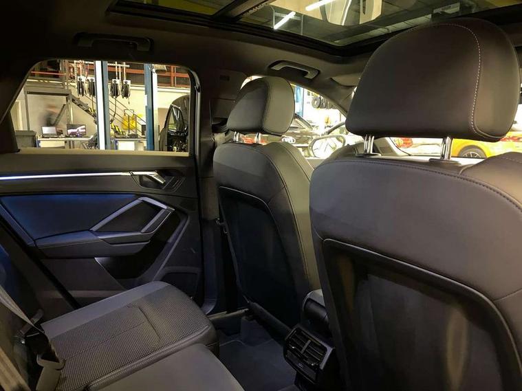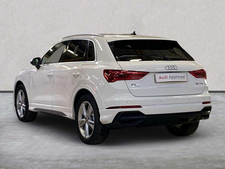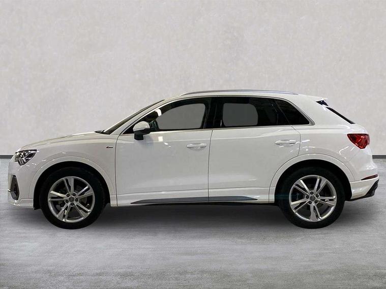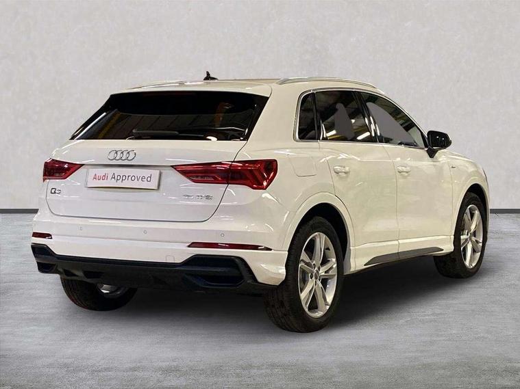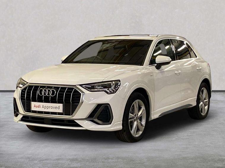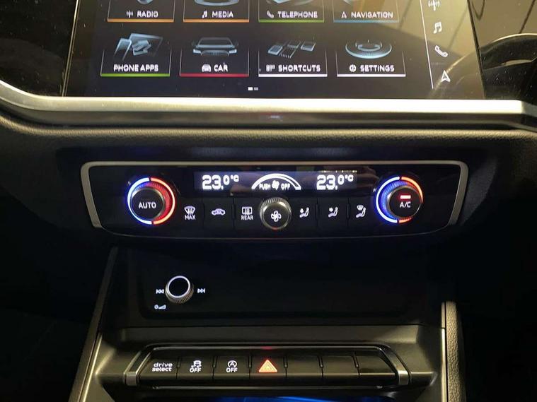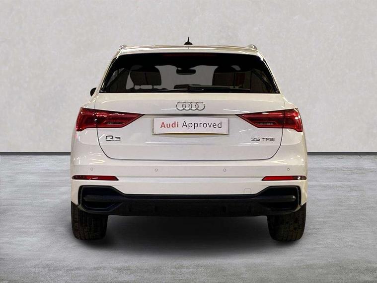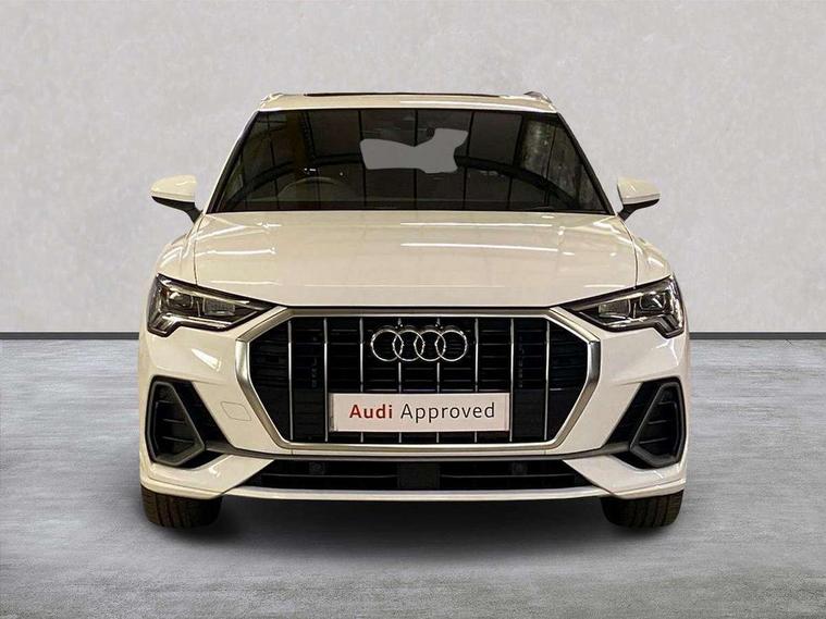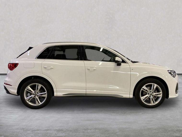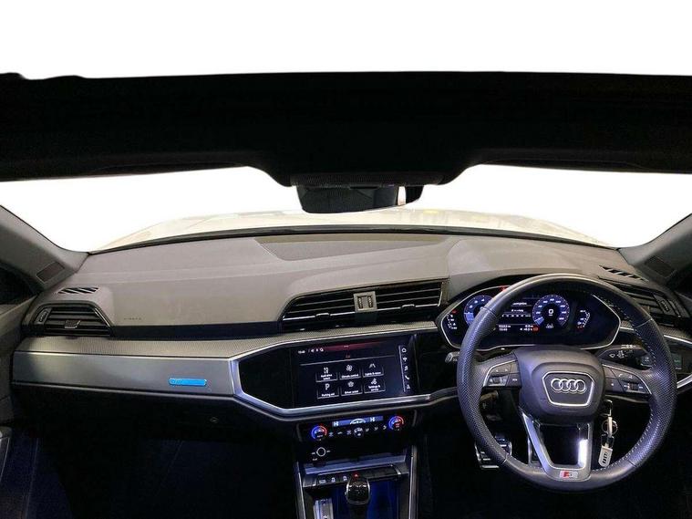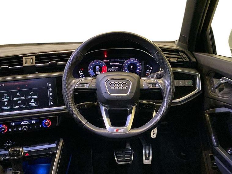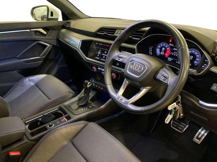 Audi connect safety and service (e-call), Audi drive select, Audi lane departure warning, Audi side assist, Audi smartphone interface, Bluetooth interface, Camera based traffic sign recognition, MMI navigation plus with MMI touch, Power opening/closing tailgate, Progressive steering, Rear parking sensors, Service interval indicator, Stop/start system, Voice control system, Sports suspension, 1 x USB type C and 1 USB type A charging points, 6 speakers, DAB digital radio module, Acoustic windscreen, Aluminium roof rails, Aluminium window trim, Auto dimming rear view mirror, Body coloured bumpers, Diffuser in matt Platinum grey, Electrically adjustable and heated door mirrors with integrated LED side indicators, Front and rear electric windows, Front fog lights, Front side air inlets in matt platinum grey, Front spoiler blade in matt platinum grey, Grille vertical bars in aluminium silver/Matt, High gloss black finish B and C pillars, LED headlights with LED daytime running lights and dynamic rear indicator, LED rear lights, Privacy glass, Rain and light sensors, Rear diffuser strip in matt titanium black, S Line badge on wings, S Line front and rear bumpers, Side skirt insert in matt Platinium grey, Titanium black radiator grille, 12V socket in rear centre console, 40:20:40 split folding rear bench seat, Adjustable rear seat bench/backrest with centre armrest and cupholder, Aluminium door sill trims, Black cloth headlining, Dual zone climate control, Front and rear black floor mats with contrast stitching in rock grey, Front and rear headrests, Front centre armrest with storage compartment and angle adjustment, Illuminated door sill trims with S logo, ISOFIX child seat mounting and Top Tether with front passenger airbag deactivation, Manual front seats with height adjustment, Perforated leather gearknob, Stainless steel luggage compartment sill finisher, Stainless steel pedals, Non smoking pack - Q3, 3x3 point rear seatbelts, 6 airbags - Driver, front passenger, curtain and side windows, Audi pre-sense front with pedestrain and cyclist recognition, Electrically operated child locks on rear doors, Electromechanical parking brake, Electronic stabilisation control including ABS, ASR and EDL, Hill hold assist, Pre sense basic, Seatbelt monitoring, Tyre pressure warning, Warning triangle and first aid kit, Anti theft alarm, Anti theft wheel bolts, Remote central locking, Dark matt brushed aluminium inlay, MMI touch colour display in gloss black with aluminium surround, Tool kit, Tyre repair kit,