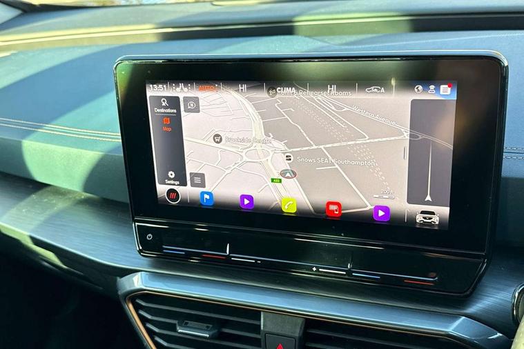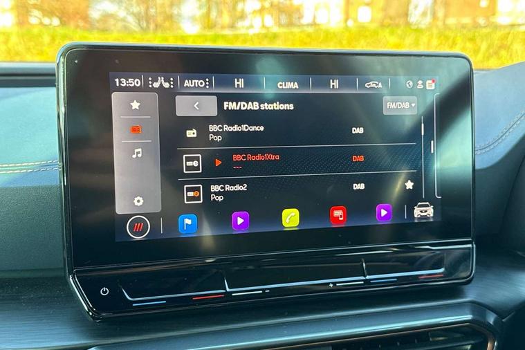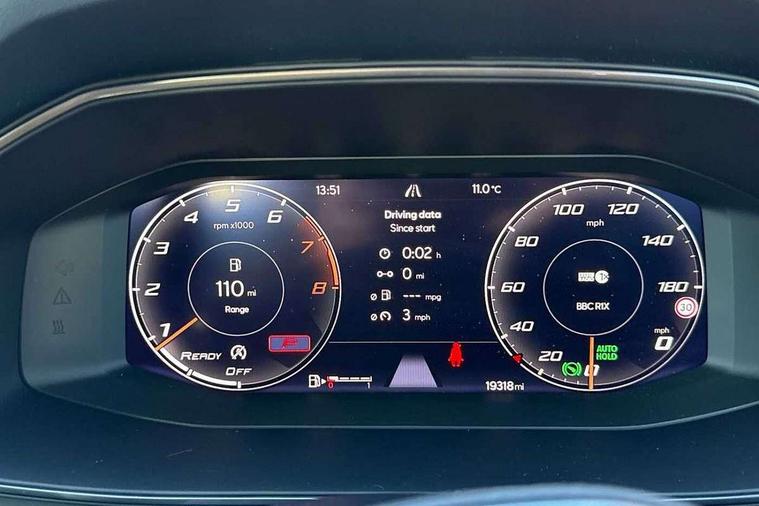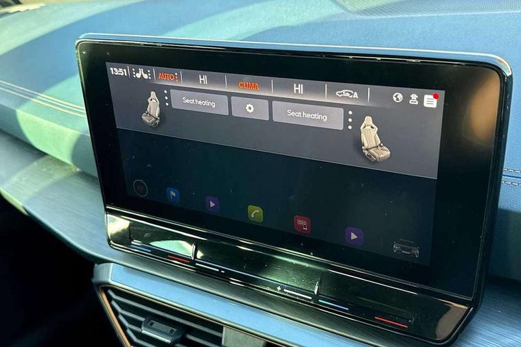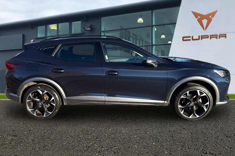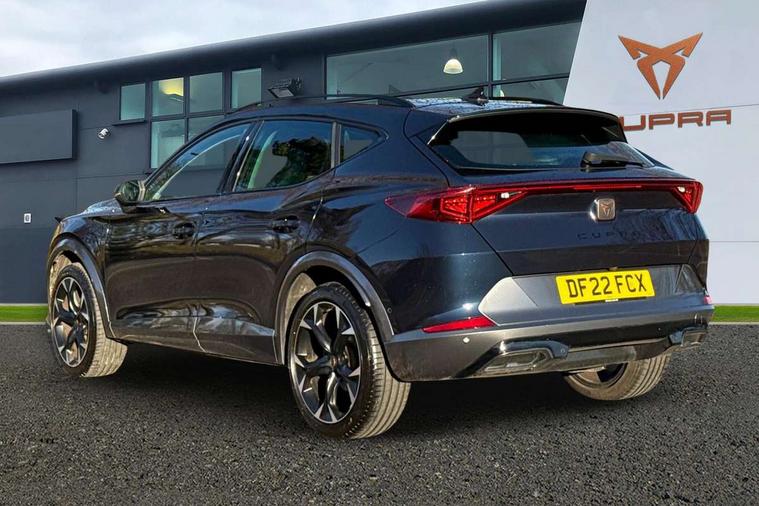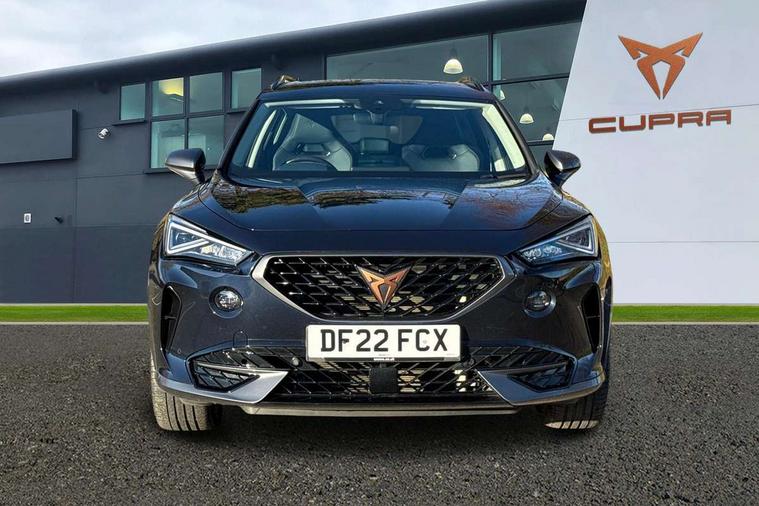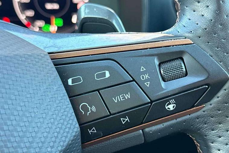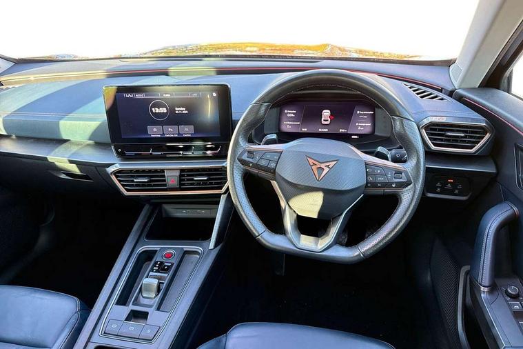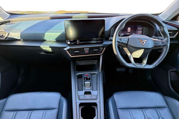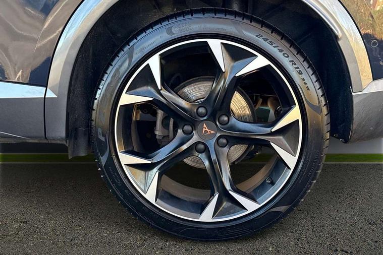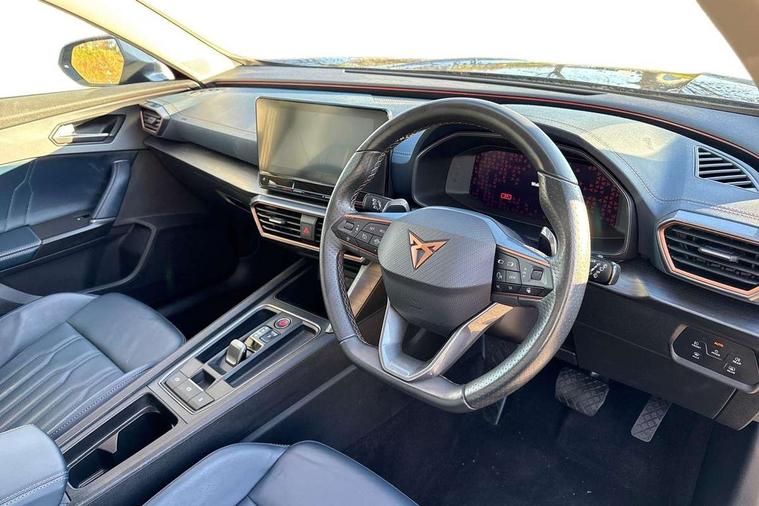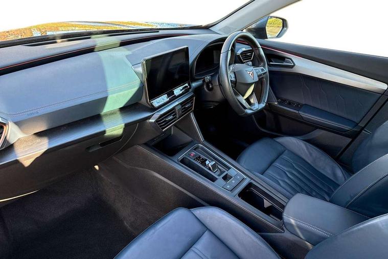 Digital cockpit and configurable dashboard, Driver alert system, Driving profile selection, E-call, Forward collision warning with automatic braking, Lane assist, Navigation system with 12'' Touchscreen Display, Park assist (inc front/rear parking sensors), PAS, Predictive adaptive cruise control with speed limiter, Rear view camera, RPM, trip computer, outside temp gauge, instrument light brightness, low fuel warning light, lights on reminder, gearshift indicator, Service interval indicator, Start/stop system with regenerative braking, Voice control system, Wireless apple carplay, Wireless phone charger, Electronic locking differential and dynamic traction support, Standard suspension, 2 front and 2 rear USB type C sockets, Auxiliary input socket, DAB radio, Auto dimming rear view mirror, Body colour door handles, Body coloured bumpers, Dark grey wing mirror, Daytime running light with automatic headlight control and coming home feature, Dynamic headlight range control, Electric front/rear windows, Electrically adjustable heated and folding door mirrors with memory function, Front fog lamps with cornering function, Gloss black roof rails and window surrounds, LED Headlights, LED Taillights with dynamic indicator, Rain sensing wipers, Rear diffuser with black simulated exhaust pipes, Rear side wing doors, Rear wash/wipe, Third brake light, Tinted rear windows, Welcome lights, 12v power supply in centre console, 12V socket, 12v socket in loadspace, 2 front and 2 rear reading lights, 230V socket, 3 seat bench in 2nd row, 60/40 split rear bench seat with armrest and mechanical seat release, Dust/pollen filter, Front and rear head restraints, Front centre armrest, Height/reach adjust steering wheel, Illuminated interior front door sills, Illuminated sunvisor with mirror, Isofix, Leather multi function heated steering wheel with gear shift paddles, Luggage tie-down hooks, Single front passenger seat, Three zone climate control with control panel in rear, Variable luggage/load compartment floor, Wraparound lighting, Genuine Nappa leather Pack - Cupra, 3 point seatbelts on all rear seats, ABS, Brake control system - ESC and brake booster, Child proof door locks, Driver and front passenger airbags with front passenger airbag de-activation, Electronic parking brake, Front and rear disc brakes, Front side curtain airbags, Hill hold control, Seat belt reminder for front and rear seats, Tyre pressure monitoring system, Anti theft alarm system, Keyless entry and start system (KESSY), Locking wheel bolts, Copper and aluminium interior detailing, 19" 'Exclusive' machined sport matte black and silver alloy wheels,
