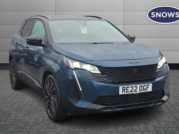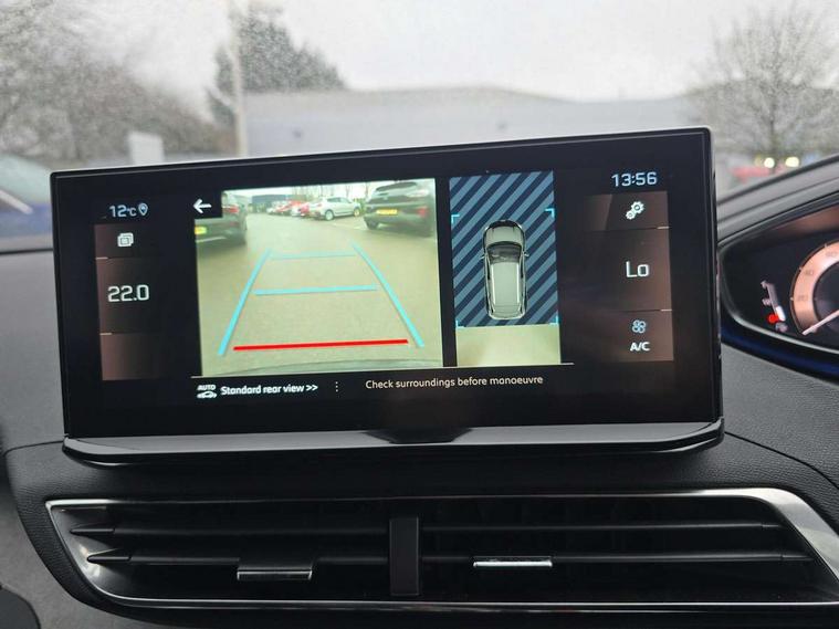 180 degree colour reversing camera, 3D connected navigation with 10" HD touchscreen, Bluetooth telephone facility, Drive modes select (Eco, normal and sport), Driving Time Warning (DAA1), Emergency services call system, Extended traffic sign recognition, Exterior temperature indicator with ice warning, Mirror screen with mirror link, apple carplay and android auto, Multi function trip computer, PEUGEOT i-Cockpit with 10" high definition capacitive touchscreen, Peugeot i-cockpit with compact multi-function sports steering wheel, PEUGEOT i-Cockpit with configurable 12.3" Head-up digital instrument panel, PEUGEOT SOS and assistance, Rear passenger USB charging sockets (x2) (type A), Speed limit recognition and recommendation, Voice recognition, Dynamic stability control and electronic anti-skid system, Stop/start function, DAB Digital radio, USB socket, Auto self levelling headlights, Automatic hazard light activation upon heavy brake application, Automatic triggered rear windscreen wiper in reverse gear, Black with chrome detailed front wing trim, Body colour door handles, Body colour rear roof spoiler with stainless steel edging trim, Body protectors (bottom of front and rear bumpers + wheel arches + protection at bottom of doors) in black, Dark tinted rear side windows + tailgate window, Diamond Black door mirror shells, Door mirror mounted LED courtesy floor lighting, Electric folding door mirrors with exterior courtesy LED lighting, Electric operated/heated door mirrors, Fog Mode, Front windscreen wiper with magic wash cleaning system, Full LED headlights with LED fog lights with static cornering function, Gloss black B and C pillar and aerodynamic deflector trim, Gloss black front bumper air scoops, Gloss black rear cluster connecting strip, Gloss black windscreen trim, GT emblem in satin copper (front wings and tailgate), Headlights left on audible warning, Heated rear windscreen with integrated antenna, LED daytime running lights, LED front indicator, LED rear number plate lighting, LED side indicator lights integrated into door mirrors, LED third brake light, One touch electric front/rear windows with pinch protection, Rear LED Peugeot signature 'Claw Effect' lights, Rear side wing doors, Stainless steel roof arches, Twin exhaust tailpipe, 1/3 to 2/3 split folding rear seats, 12V Sockets in dashboard, rear cabin and load area, 2 cupholders in front centre console, 2 cupholders in rear armrest, 2 x Rear reading spotlights, 2x Rear coat hooks, 3x Isofix child seat fittings in the front passenger and outer rear seats, 4 Grab handles retractable and damped, Aikinite stitching in armrest, gear lever and dashboard facia, Aluminium pedals, Blue ambient lighting for connecting zone, Blue ambient lighting to front door panels, central storage and cupholders, Blue ambient lighting to headup instrument panel, Centre front armrest with butterfly wing opening and illuminated storage compartment, Driver seat manual adjustment (longitudinal and back rest angle), Dual zone automatic climate control, Electric power steering with reach and rake adjustable steering column, Flocked front door pocket interior with blue ambient lighting, Flocked glovebox interior, Foldable front passenger seat with picnic table, Footwell illumination, Front interior light with 2 reading spotlights and rear interior light with timer, Front passenger seat manual adjustment (longitudinal and back rest angle), Front seat back map pockets, Gear shift indicator, Illuminated glovebox, Individual left and right controls in boot for seat folding, LED interior lighting in storage spaces and load area, LED roof interior lighting, Mistral floor mats with Aikinite contrast stitching, Mistral full grain perforated leather steering wheel with aikinite stitch detail and satin chrome 'GT' emblem, Rear bench seat with central armrest and ski hatch, Rear centre console ventilation system, Roof lining - Mistral black, Satin chrome dashboard trim, Satin chrome digital instrument panel and touchscreen trim, Satin chrome front door panel recess trim, Satin chrome interior door handles, Satin chrome scorpion's tail and toggle switch trim, Seatbelt not fastened audible and visual alert for front seats, Seatbelt unfastened on the move audible and visual alert for front and rear seats, Sunvisors with illuminated vanity mirrors, Two position boot floor, Drive assist plus pack - 3008, Driver sport pack - 3008 Auto, Safety plus pack with high beam assist - 3008, Visibility pack - 3008, 3x Rear three-point retractable seatbelts with force limiters in the outer rear seats, ABS (Anti-lock Braking System) with EBD (Electronic Brakeforce Distribution) and EBA (Emergency Braking Assistance), Adaptive driver and front passenger airbags with passenger airbag deactivation function, Driver and front passenger side airbags, Electric child locking functionality on rear windows and doors, Electric parking brake, Front and rear curtain airbags, Front optimised safety headrests and 3 x rear retractable headrests with height adjustable, Front three point retractable seatbelts with pre tensioners and force limiters, Front ventilated disc brakes and rear disc brakes, Hill start assist, Two tone horn, Automatic door locking when moving off, Electronic immobiliser, key operated exterior door lock from the left hand door, Perimetric and volumetric alarm with lift and tilt sensor, Peugeot Open and Go System, Remote control central locking with two plip keys, Puncture repair kit including compressor, sealant cartridge and towing eye,
