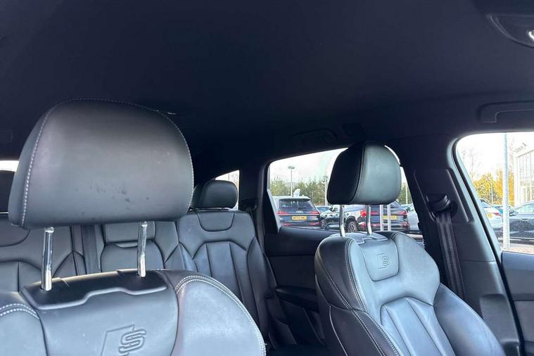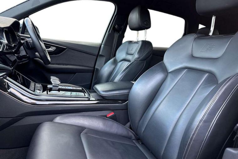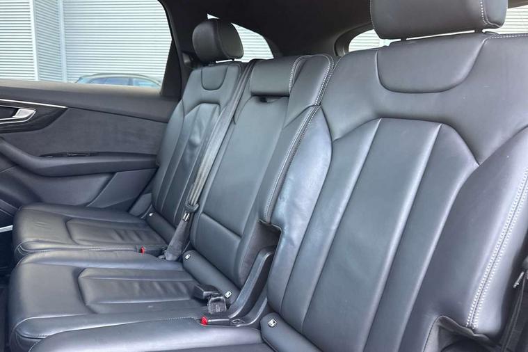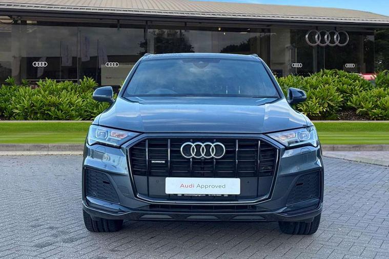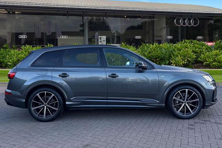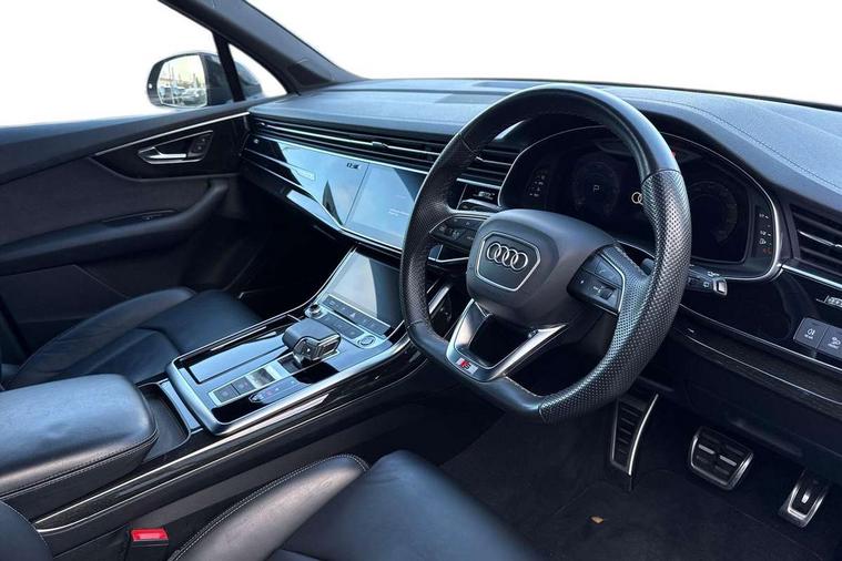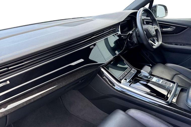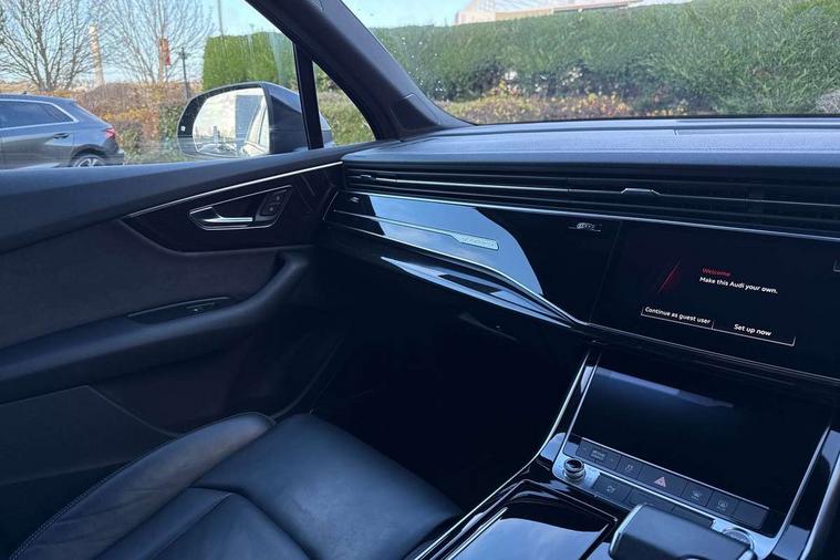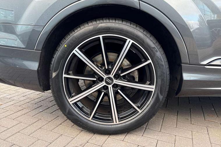 Audi connect safety and service (e-call), Audi connect with Amazon Alexa Integration, Audi drive select (Auto, Comfort, Dynamic, Efficiency, Individual, Off-road and All road), Audi smartphone interface includes wireless Apple carplay/Android Auto, Bluetooth interface, Camera based traffic sign recognition, Electromechanical steering, MMI navigation plus with MMI touch screens includes 10.1" and 8.6" screens with haptic feedback, Natural voice recognition, Parking system plus with 360 degree display (front, rear and side sensors) - acoustic and visual park assist system, Power operated tailgate, Rear view camera, Start/stop system, 48V Mild hybrid technology, Adaptive air sports suspension, Quattro all wheel drive with self locking centre differential, Audi music interface - front 2 USB-C ports with charger and data functions, Audi sound system with 6 channel amplifier, 180 watt amplifying capacity and 10 loudspeakers including subwoofer, DAB digital radio module, 3rd brake light, Audi matrix LED headlights with dynamic front and rear indicators, Auto dimming frameless rear view mirror, Black roof rails, Bumpers in contrast paint scandium grey finish includes door trim and wheel arch trim strips, inlays in door strip contain quattro embossing, Electrically adj heated/folding + automatically dimming exterior mirrors with memory + automatic kerb side function for passenger side exterior mirror, Heat insulating glass in windshield, Integrated LED indications in door mirrors, LED daytime running lights, LED rear tail lights, Privacy glass - dark tinted rear and rear side windows from B-pillar backwards, Rear side wing doors, Rear wiper, 2 seat bench in 3rd row, 3 seat bench in 2nd row, 4 zone deluxe automatic climate control, 7 seat layout with ISOFIX points for the front passenger seat and rear passenger seat, Black cloth headlining, Comfort front centre armrest, Electric adjustable front seat with 4 way lumbar support, driver memory functionality, Folding rear seats, Front head restraints, Front/rear floor mats, Heated front seats, Illuminated door sill trims with S logo, LED interior ambient lighting, Luggage compartment cover, Luggage compartment sill protection in stainless steel, Rear head restraints, Single front passenger seat, Stainless steel pedals, Sunvisors with illuminated vanity mirrors, Titanium black styling pack - Q7/SQ7, 3 point seatbelts on all rear seats, Audi pre sense front, Child locks on rear doors, Driver and front passenger, front side and curtain airbags, Electromechanical parking brake, Electronic Stabilisation Control (ESC) including ABS, ASR and EDL, Extended pedestrian protection measures, Hill hold assist, Seatbelt monitoring, Tyre pressure loss indicator, Warning triangle and first aid kit, Anti theft alarm, Anti-theft wheel bolts and wheel loosening detection, Keyless Go, Remote central locking, Polished oak trim with grey finish inlay, Tool kit, Tyre repair kit,
