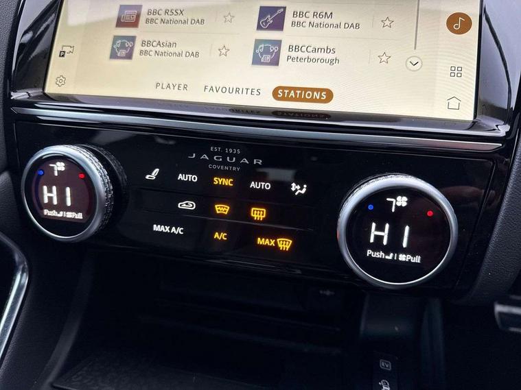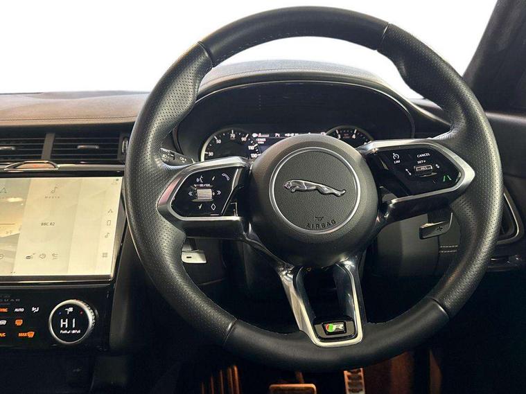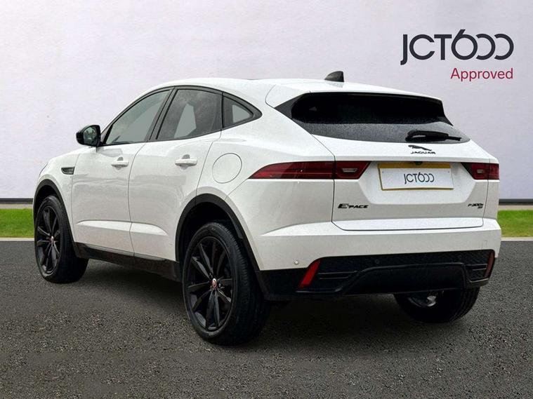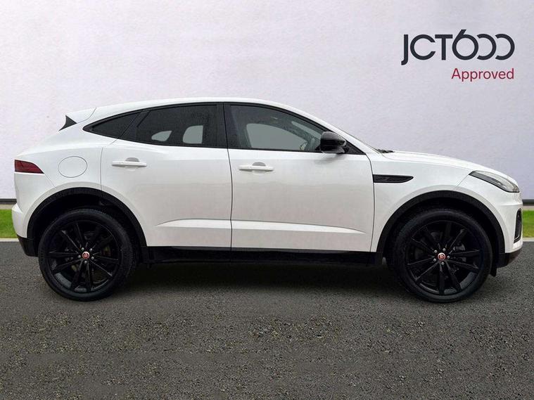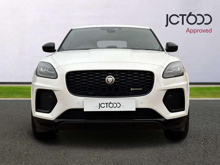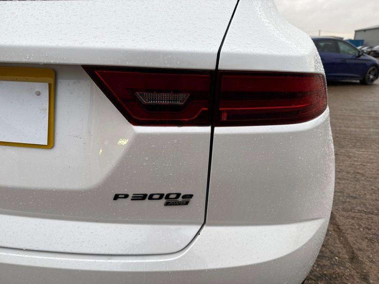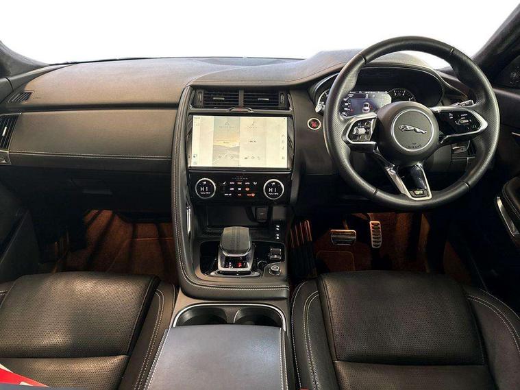 11.4" touchscreen with central ICP, 12.3" full digital instrument panel, Adaptive cruise control, Android Auto, Apple car play, Driver condition monitor, Eco driving style assistant, Electric power assisted steering, Emergency services call system, Front and rear parking aid, InControl remote, Jaguar drive control with adaptive surface response, Jaguar Toggle sport shift selector, Lane keep assist, Outside temperature gauge, Pivi pro connected infotainment system with smart settings and navigation pro, Push button start, Speed proportional steering, Traffic sign recognition with adaptive speed limiter, Trip computer, Voice control system, 7 kW onboard charger, Configurable dynamics, Electric rear axle drive, Home charging cable Mode 2, Large fuel tank, Passive suspension, Public charging cable Mode 3, AM/FM DVD MP3 radio, Bluetooth connectivity including audio streaming, DAB digital audio broadcast, Dynamic volume control, 3 flash lane change indicators, Approach Illumination, Auto high beam assist, Automatic headlights, Body colour door handles, Body colour upper spoiler, Body coloured side sills, Centre high-mounted stop light, Electric front/rear windows with one touch/auto up/down, Electric heated/power fold memory door mirrors with approach lights and auto dimming driver side, Embossed leaper for grained and windsor leather, Fixed panoramic glass sunroof, Heated washer jets, Heated windscreen, Jaguar script and leaper, LED tail lights, LED third brake light, Narvik black antenna pod and side pillar finisher, Narvik black door mirrors, Narvik black front and rear low bumpers, Narvik black lower side cladding, P300e AWD badge, Privacy glass, R Dynamic badge, Rain sensor windscreen wipers, Rear fog lights, Rear side wing doors, Rear wash wiper, Satin black grained front outer grille, low grill mesh and low bumper valence, side fender vent mesh and finisher, rear tow eye cover and grille mesh, Twin exhaust tailpipe, Variable front intermittent wipers, 3 rear head restraints, 3 seat bench in 2nd row, 40:20:40 rear seat fold, Bright metal pedals, Carpet mats, Centre console with armrest, Enhanced ambient lighting, Hooks loadspace, ISOFIX on outer rear seats, Loadspace cover, Loadspace light, Loadspace storage net, Luggage tie-downs in loadspace, Manual height/reach adjust steering wheel, Multifunction steering wheel, Overhead lighting console, Passive front head restraints, Power sockets, R-Dynamic branded leather steering wheel, Rear air vents, Rear bench seats, Satin chrome gearshift paddles, Single front passenger seat, Sunvisors with illuminated vanity mirrors, Twin front cupholders, Two zone climate control, Exterior black pack - E-pace, 3x3 point rear seatbelts, ABS, All surface progress control (ASPC), Child locks on rear doors, Customer configurable autolock, DSC - Dynamic Stability Control, Electronic brake force distribution, Electronic parking brake, Emergency brake assist, Emergency braking, Front airbags with passenger seat occupant detector, Front and rear curtain airbags, Front and rear seatbelt reminder, Front passenger airbag deactivation, Front seatbelt pretensioners, Front side airbags, Height adjustable front seatbelts, Hill start assist, Low friction launch, Power child locks, Torque vectoring brake, Tyre pressure monitoring system, Intrusion sensor and alarm, Locking wheel nuts, Remote central locking,