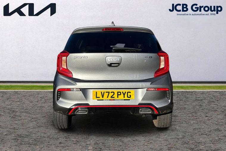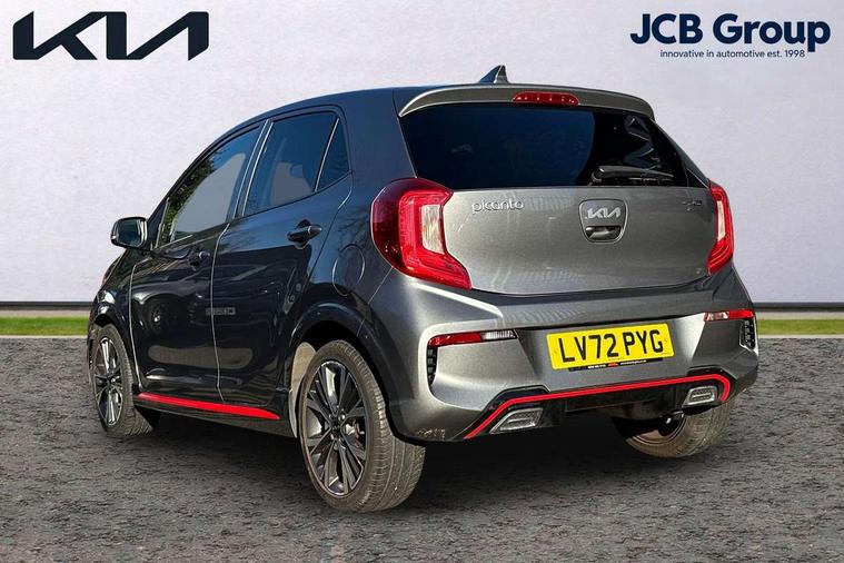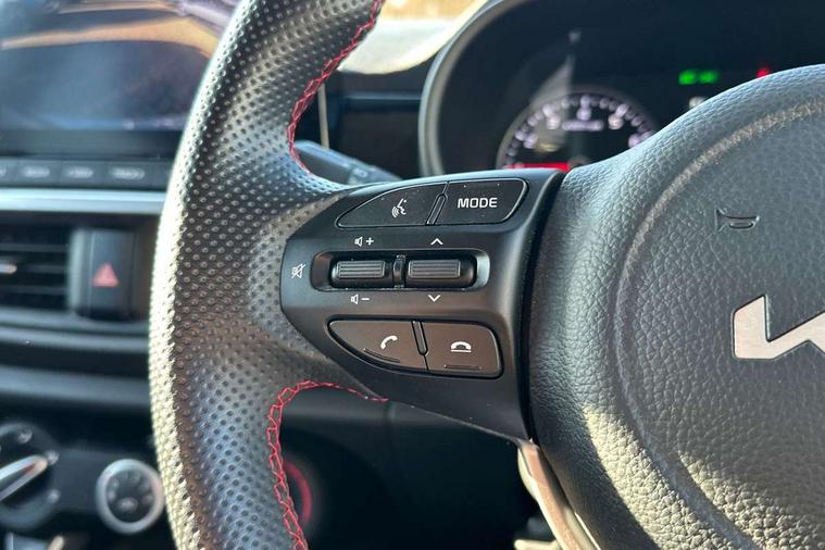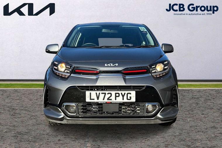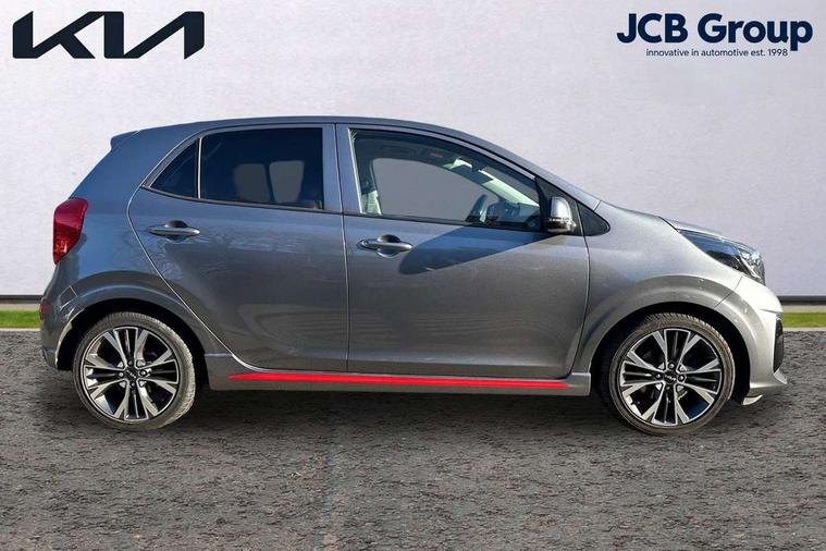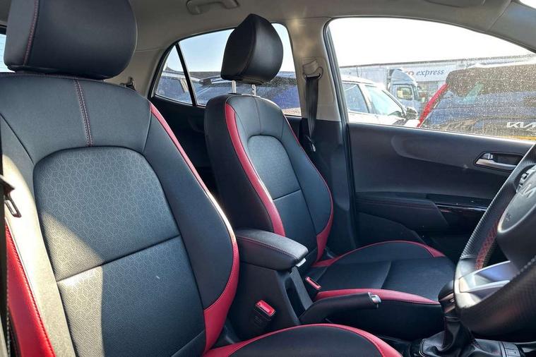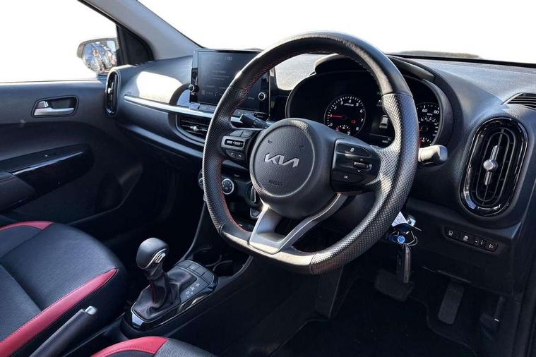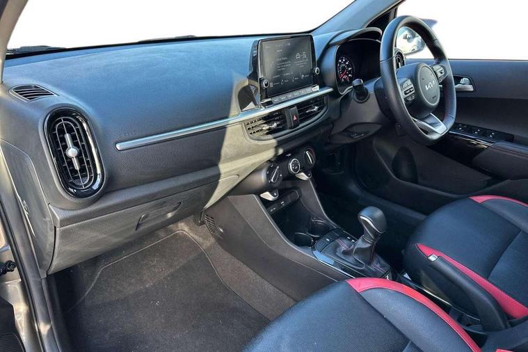 8" touchscreen display with RDS and DAB, Apple car play/Android Auto with voice control, Emergency call service, Emergency stop signalling system, External temperature gauge, Motor driven power steering, Reversing camera system with dynamic guidelines (Integrated into centre fascia screen), Tachometer, Trip computer, 6 speaker audio system, Bluetooth with music streaming, Steering wheel mounted controls, USB ports for connection of a media device, Automatic headlight control system, Bi-function projection headlights, Black beltline mouldings, Black grille with silver surround, Body colour B pillars, Body colour bumpers, Body colour mirrors and door handles, Body colour side sill mouldings, Day/night rear view mirror, Electric adjustable/heated/folding door mirrors with LED indicators lights, Front and rear electric windows with drivers's auto up/down function, Front fog lights, Headlamp levelling, Heated rear window, High mount brake light, LED daytime running lights, LED rear fog lights, Privacy glass - Rear windows and tailgate, Rain sensor, Rear side wing doors, Rear wash/wipe, Speed variable front wipers, Sports front and rear bumpers with gloss black skid plates twin exhaust, Tinted glass, Visible VIN plate, Welcome and follow-me home light functionality, 1 x rear coat hook, 12V power point front, 2 seat bench in 2nd row, 3 x passenger assist grips, 60/40 split/folding 2nd row of seats, All round height adjustable headrests, Black and red accents front door armrest, Centre Console with Storage Box and Sliding Armrest, Cupholders in centre console, D-cut steering wheel with red stitching, Driver and front passenger sunvisor with vanity mirror, Driver seat height adjust, Faux leather upholstery, Front cabin lights, Glovebox, High gloss lower centre fascia trim, door armrest and air vents, ISOFIX Child seat top tethers and anchor fixings, Leather trimmed steering wheel and gearshift, Luggage area light, Luggage area parcel shelf, Manual air conditioning, Passenger front seatback pockets, Satin chrome interior door handles, Single front passenger seat, Slide/reclining front seats, Tilt adjustable steering wheel, Advanced Driver Assistance Pack - Picanto, 2 x 3-point rear seatbelts, ABS/EBD, Automatic unlocking of doors in case of impact, Dual front airbags, ESC + BAS + VSM + HAC, Front passenger airbag cut-off switch, Front seatbelt height adjusters, Front seatbelt pretensioners + load limiters, Hill hold control, Knee airbags, Rear child proof door locks, Seatbelt warning, Side impact protection, Torque vectoring brake based and straight line stability (SLS), Traction control, Twin curtain airbags, Twin front side airbags, Tyre pressure monitoring system, Anti theft alarm, Engine immobiliser, Folding key, Locking wheel nuts, Remote central door locking, 16" alloy GT-Line wheels, Tyre mobility kit,