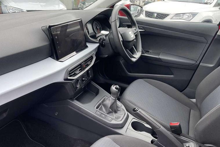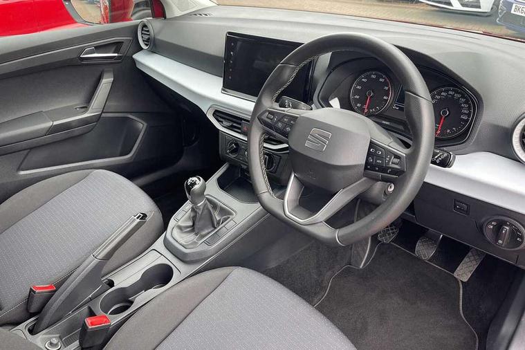 16" Design machined alloy wheels in Nuclear grey, Electronic engine immobiliser, Locking wheel bolts, Remote central locking + deadlocks, Auxiliary input socket, Radio/MP3 player, SD card slot, Steering wheel mounted controls, 3 point seatbelts on all 3 rear seats, ABS, Active front headrests, Child locks on rear doors, Electronic stability control, Energy recovery system, Front assist forward collision warning and autonomous emergency braking, Front driver and passenger side airbags with curtain airbag and front passenger airbag deactivation, Hill hold control, Multi-Collision braking, Seat belt reminder for front and rear seats, Tiredness recognition system, Tyre pressure monitoring system, Anti theft roof antenna, Body colour bumpers, Body colour door handles, Body colour door mirrors, Dimming interior rear view mirror, ECO LED automatic headlights and LED daytime running lights, Electric front windows, Electric headlight adjustment, Electrically adjustable door mirrors, Front/rear fog lights, Halogen tailights, 60/40 split folding rear seat, Air conditioning with dust and pollen filter, Chrome interior detailing and grey headlining, Cloth upholstery, Comfort seats, Front courtesy lights, Front cupholders x 2, Front reading lights, Gear shift indicator, Glovebox, Height adjustable front and rear headrests (five), Height adjustable front seats, Height/reach adjust steering wheel, Illuminated boot, Instrument lighting with brightness control, Isofix, Leather multifunction flat bottomed sports steering wheel, Passenger sunvisor, Sunvisors with mirror and driver side card holder, 'Lights On' Reminder warning buzzer, 9.2" touchscreen navigation system with type C USB socket, Voice control and DAB/AM/FM radio, Auto start and stop system, Bluetooth audio streaming with handsfree system, Cruise control, Digital clock, Full link smartphone integration with mirror link, wireless apple carplay, Google android auto + USB Type C cable for apple and android devices, Lane assist, Low fuel warning light, Outside temperature gauge, Power Steering, Seat connect with safety, serivice, remote and online, SEAT logo boot release, Speed limiter, Trip computer, Comfort suspension,