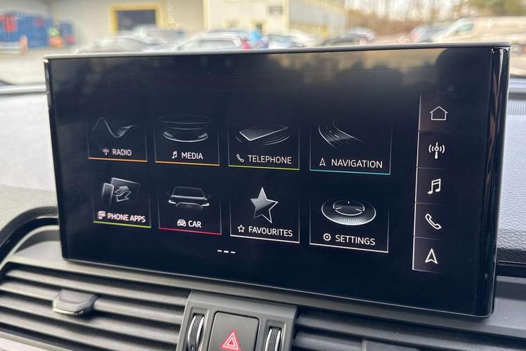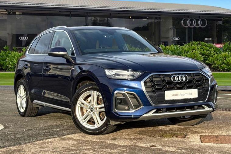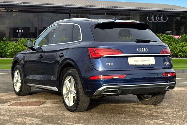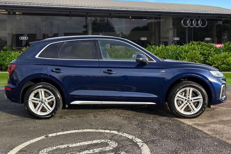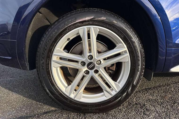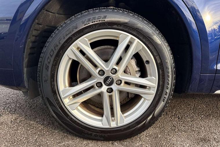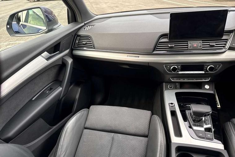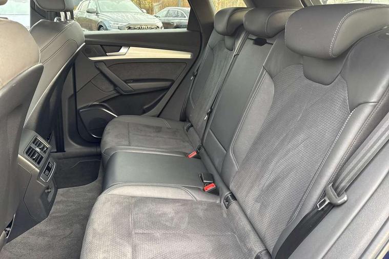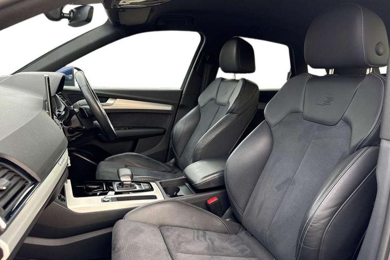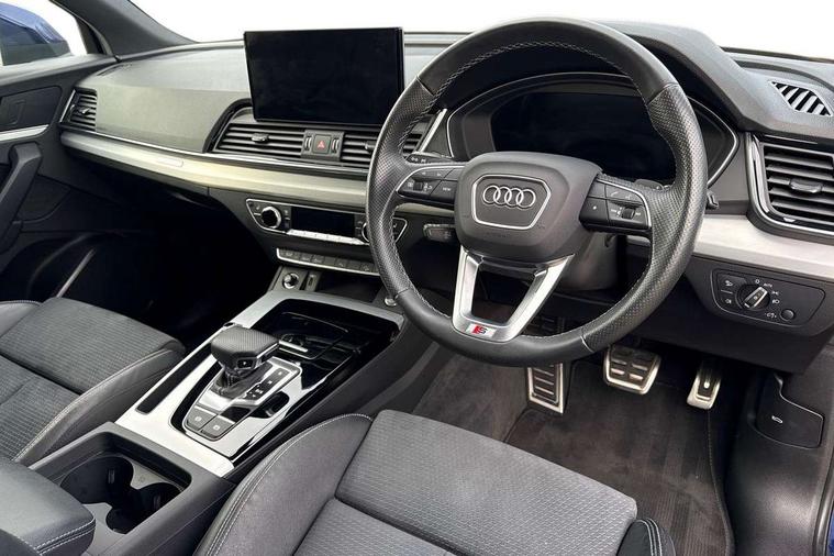 Amazon alexa Integration, Audi connect safety and service (e-call), Audi drive select, Audi virtual cockpit plus with 12.3" screen and three different layout designs, Audi wireless smartphone interface, Automatic start-stop system with coasting functionality and efficiency programme, Electro - mechanical power assisted steering, MMI navigation plus with 10.1" touch screen, Mobile telephone preparation - bluetooth interface, Power tailgate, Service interval indicator, Voice control system with Audi hotword activation "Hey Audi", Diesel particulate filter, Quattro on demand, 2 USB charging ports, DAB Digital radio, Acoustic windscreen, Aluminium roof rails, Audi matrix LED headlights with LED rear lights + dynamic front and rear indicators, Auto dimming rear view mirror, Automatic headlight adjustment, Automatic headlights and windscreen wipers, Body colour bumpers, Body colour door mirrors, Body colour rear diffuser with matt aluminium silver surrounds, Body colour underbody protection, Chrome plated exhaust trims, Door sills in Selenite silver, Electric adjustable/heated/folding door mirrors, Front air inlet surrounds in aluminium, Front and rear electric windows, Front radiator grille in honeycomb design, Headlight washers, Lower bumpers painted in contrast Manhattan grey, Rear chrome trim strip below lights, Rear privacy glass and rear side windows, Rear spoiler, Rear wiper, Roof bars, S Line badges on the front wings, S Line front and rear bumpers, S Line side skirts, 3 rear headrests, 40:20:40 split folding rear seat with rear centre armrest, Black cloth headlining, Contrast stitching on seats, steering wheel and gear lever gaiter, Deluxe 3 zone electronic climate control, Front centre armrest, Front/rear floor mats, Gear lever in black leather, Heated front seats, Height adjustable front head restraints, Height/reach adjustable steering column, Illuminated door sill trims with S logo, ISOFIX child seat mounting and top tether, Manual seat adjustment with 4-way electric lumbar support, Removable luggage compartment floor, Stainless steel pedals, Sunvisors with vanity mirrors, Tool kit, Trunk roller cover, High gloss pack - Q5, LED interior light pack - Q5, 3 point seatbelts on all seats, 6 airbags - Driver, front passenger, curtain and side airbags, Electrically operated child locks on rear doors, Electromechanical parking brake, Electronic stabilisation control including ABS, ASR and EDL, Front passenger airbag deactivation, Hill descent control, Hill hold assist, Multi collision brake assist, Pop-up bonnet for pedestrian protection, Pre sense city, Seat belt force limiter, Seatbelt monitoring, Tyre pressure warning, Warning triangle and first aid kit, Anti theft alarm, Anti-theft wheel bolts, Keyless Go access/ignition system, Matt brushed aluminium inlays,