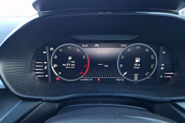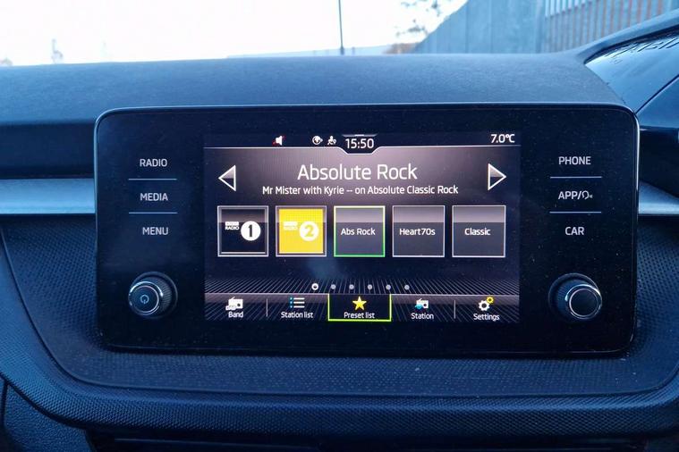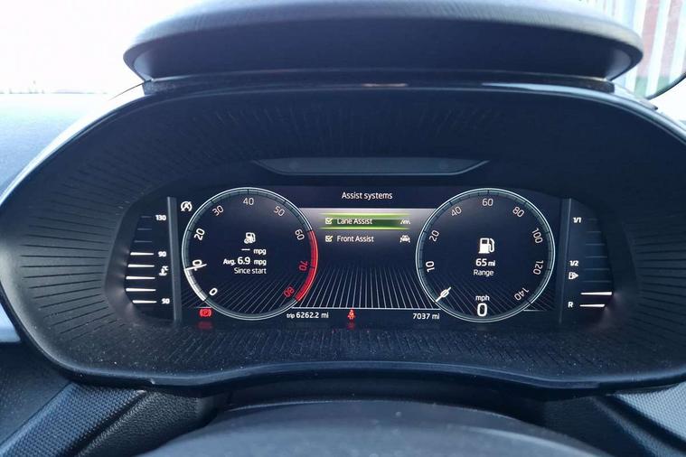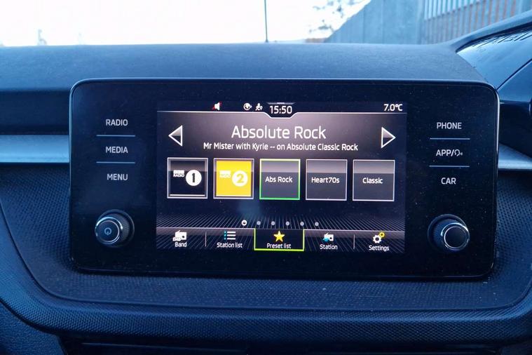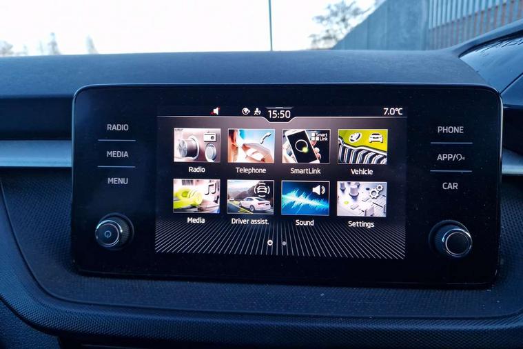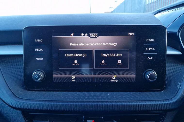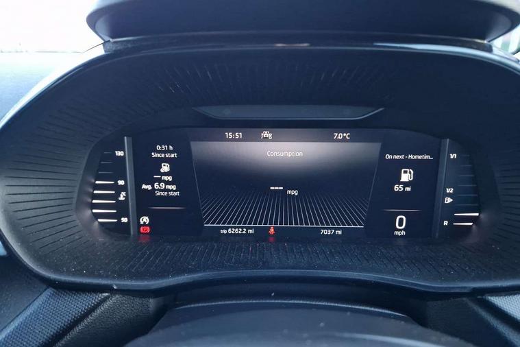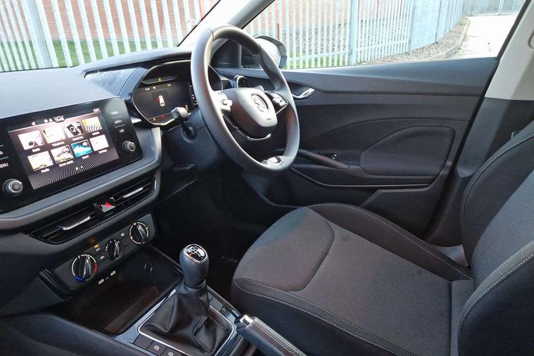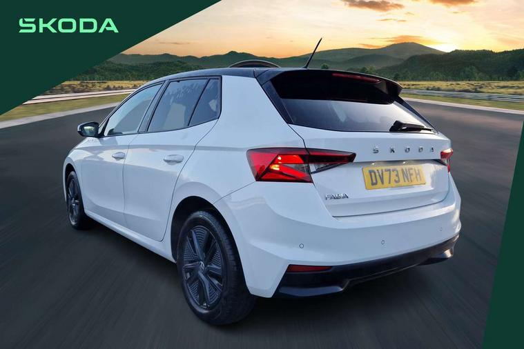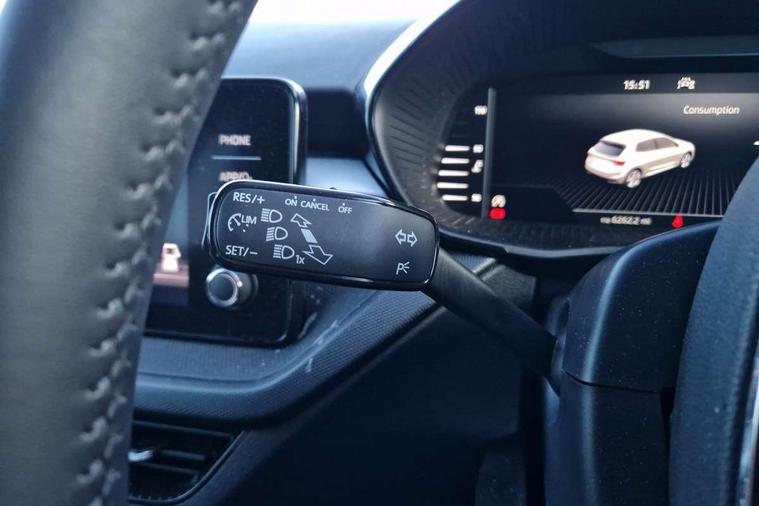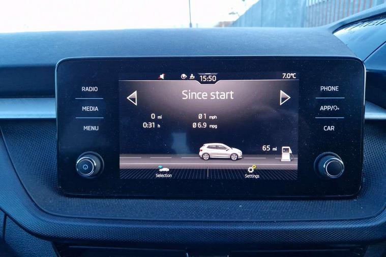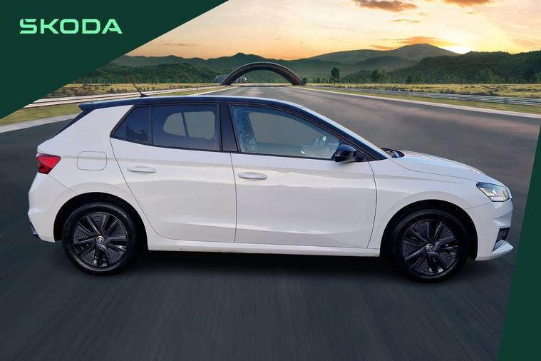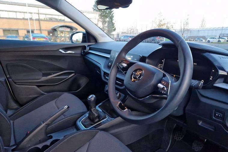 Bluetooth connection, Driver alert system - DAS, Electromechanical power steering, Exterior temperature gauge, Lane assist including road edge detection, Service interval indicator, Virtual cockpit with 10.25" colour display, 2x USB-C in the front (for data transmission and charging), 6 Speakers (4 in front and 2 in rear), Auxiliary socket for external MP3 player, Bolero radio with 8" colour display, DAB digital radio reception, Body coloured bumpers, Dimming rear view mirror with black frame, Door mirror integrated indicators, Electrically adjustable and heated door mirrors, Electrically adjustable front windows with function auto up/down, Front window wiper intermittent control, Headlight range control - Automatic, Ice scraper in fuel cap, LED daytime running lights with coming and leaving home feature, Mechanical adjustable rear windows, Privacy glass, Rear LED fog light, Rear side wing doors, Rear window wiper with washing nozzles, Roof mounted spoiler, SKODA tailgate lettering in chrome, Third brake light, 3 rear headrests, Backrest split and folding, Central console with fixed cup holder and storage box, Chrome handbrake release button, Fabric upholstery, Gearshift knob/handle in leather, Grain satin black interior door handles, Hand brake lever handle in leather, Height adjustable front headrests, Height adjustable steering wheel, ISOFIX and TopTether anchorage points to the outer rear seats, ISOFIX and TopTether on the front passenger seat, Luggage compartment lighting, Pollen filter, Rear seat bench unsplit, Single front passenger seat, Storm grey headlining, Sun visors with mirror and airbag label on passenger side, Ticket holder, Umbrella in drivers door, 3-point height adjustable front seats belts with pretensioner and force limiter, Automatic warning lights in case of crash, Driver and passengers airbag with switch off function, e-Call+, ESC including ABS, MSR, ASR, EDS, HBA and XDS, Front and rear seat belt warning, FRONT ASSIST (AEB City and AEB Inter Urban), Front side airbags, Head airbags, One tone horn, Pedestrian protection, Three rear 3-points safety seat belts with pretensioner and force limiter including stop function for outer rear seat belts, Tyre pressure monitoring system, Anti-theft alarm system including immobiliser, interior monitoring, backup horn, and towing protection, Anodized cross line upper decorative trim, Colour Edition air vents, Grain satin black central console cover, Grain satin black lower decorative trim, Satin black door and side trim panel in front, Anti-theft wheel bolts protection, Super-low rolling resistance tyres,