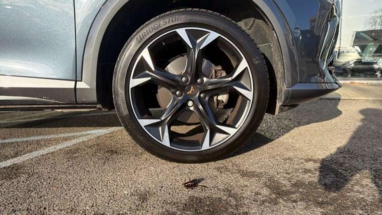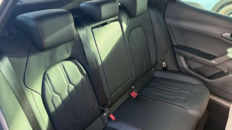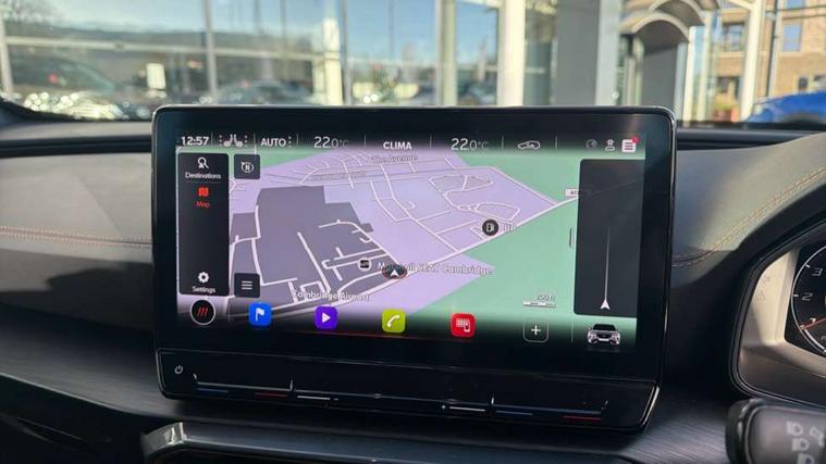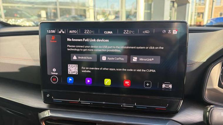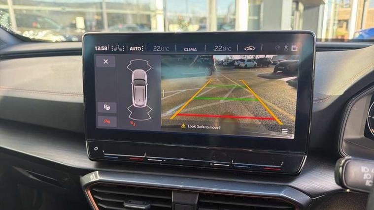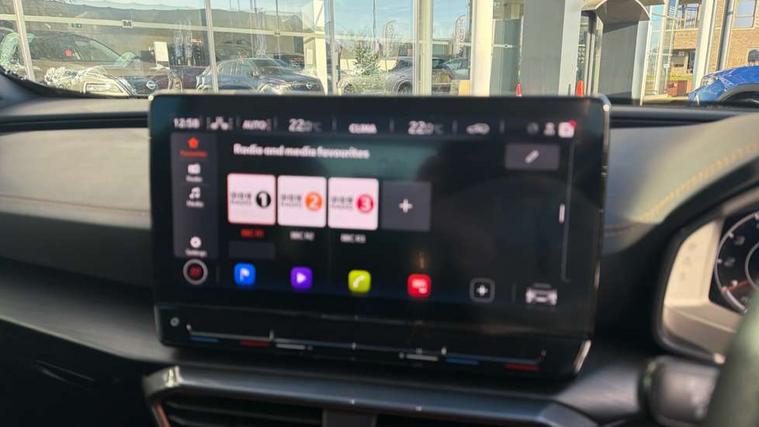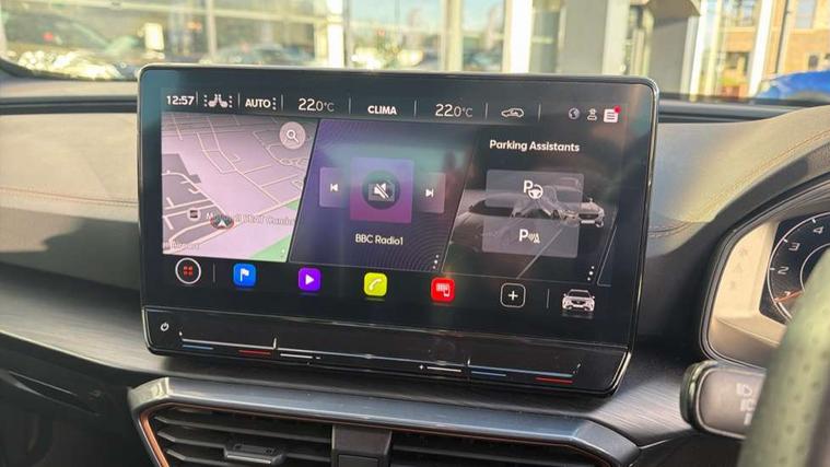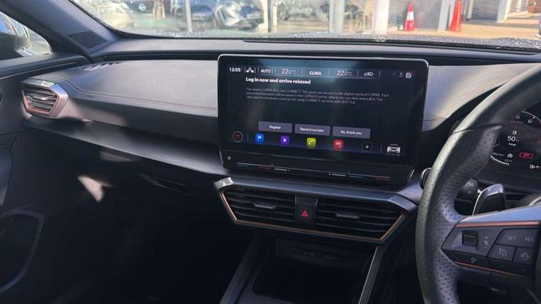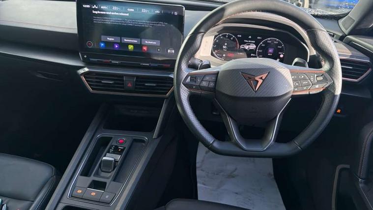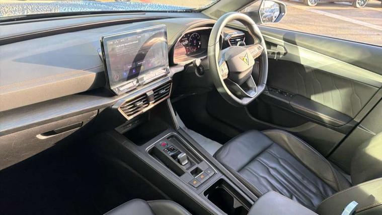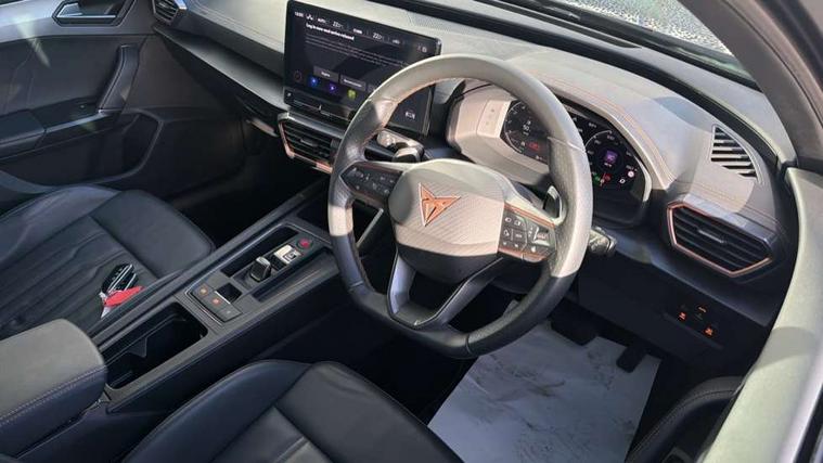 Digital cockpit and configurable dashboard, Driver alert system, Driving profile selection, Forward collision warning with automatic braking, Lane assist, Navigation system with 12'' Touchscreen Display, Park assist (inc front/rear parking sensors), PAS, Predictive adaptive cruise control with speed limiter, Rear view camera, RPM, trip computer, outside temp gauge, instrument light brightness, low fuel warning light, lights on reminder, gearshift indicator, Service interval indicator, Start/stop system with regenerative braking, Voice control system, Wired Android Auto, Wireless apple carplay, Wireless phone charger, Electronic locking differential and dynamic traction support, Standard suspension, 2 front and 2 rear USB type C sockets, Auxiliary input socket, DAB radio, Auto dimming rear view mirror, Body colour door handles, Body coloured bumpers, Dark grey wing mirror, Daytime running light with automatic headlight control and coming home feature, Dynamic headlight range control, Electric front/rear windows, Electrically adjustable heated and folding door mirrors with memory function, Front fog lamps with cornering function, Gloss black roof rails and window surrounds, LED Headlights, LED Taillights with dynamic indicator, Rain sensing wipers, Rear diffuser with black simulated exhaust pipes, Rear side wing doors, Rear wash/wipe, Third brake light, Tinted rear windows, Welcome lights, 12v power supply in centre console, 12V socket, 12v socket in loadspace, 2 front and 2 rear reading lights, 230V socket, 3 seat bench in 2nd row, 60/40 split rear bench seat with armrest and mechanical seat release, Black headlining, Dust/pollen filter, Front and rear head restraints, Front centre armrest, Height/reach adjust steering wheel, Illuminated interior front door sills, Illuminated sunvisor with mirror, Isofix, Leather multi function heated steering wheel with gear shift paddles, Luggage tie-down hooks, Single front passenger seat, Three zone climate control with control panel in rear, Variable luggage/load compartment floor, Wraparound lighting, Genuine Nappa leather Pack - Cupra, 3 point seatbelts on all rear seats, ABS, Brake control system - ESC and brake booster, Child proof door locks, Driver and front passenger airbags with front passenger airbag de-activation, Electronic parking brake, Front and rear disc brakes, Front side curtain airbags, Hill hold control, Public e-call, Seat belt reminder for front and rear seats, Tyre pressure monitoring system, Anti theft alarm system, Keyless entry and start system (KESSY), Locking wheel bolts, Copper and aluminium interior detailing, 19" 'Exclusive' machined sport matte black and silver alloy wheels,