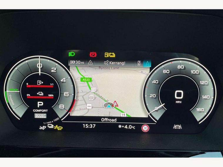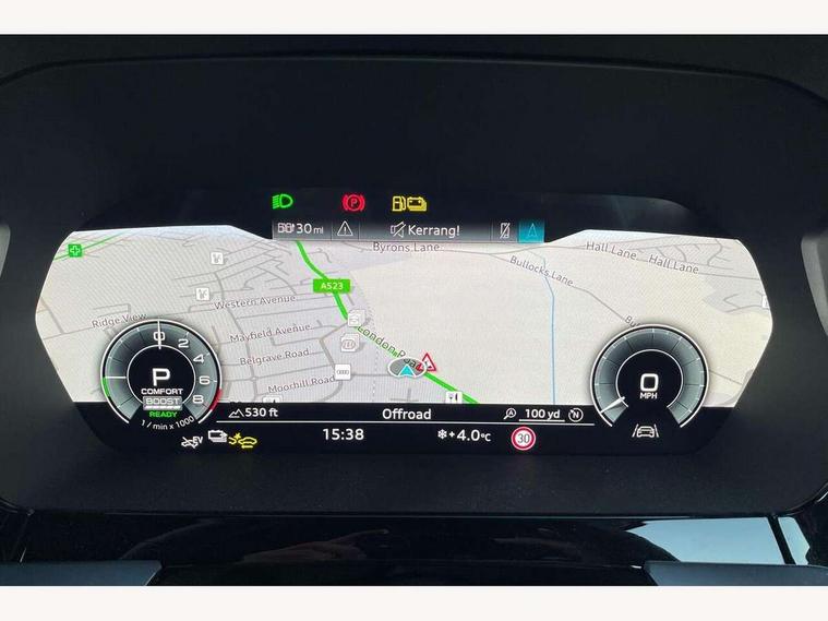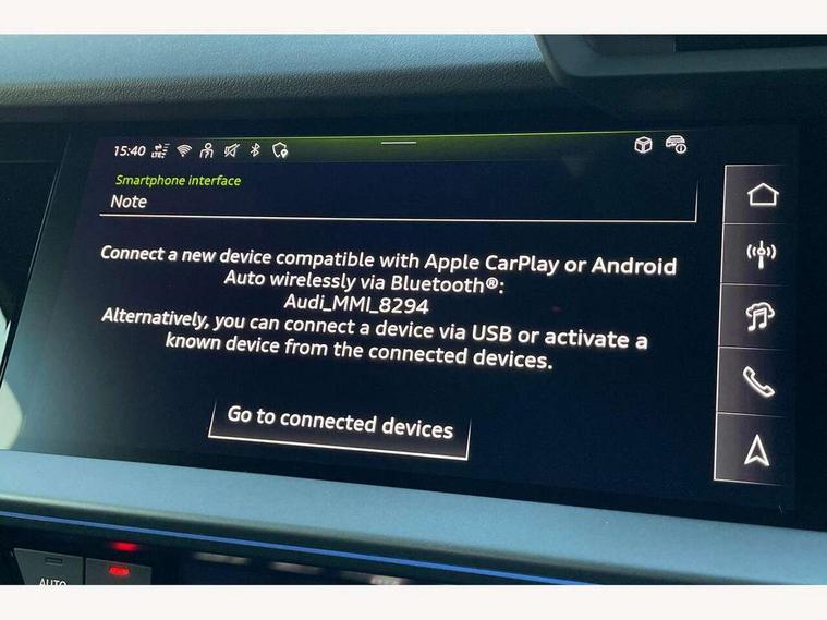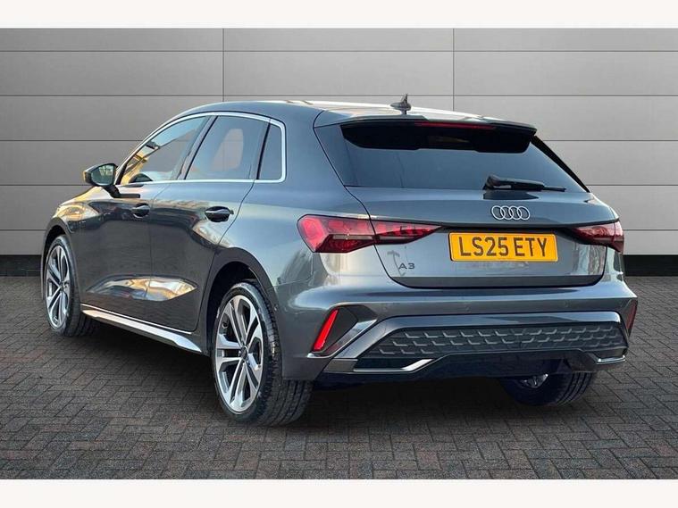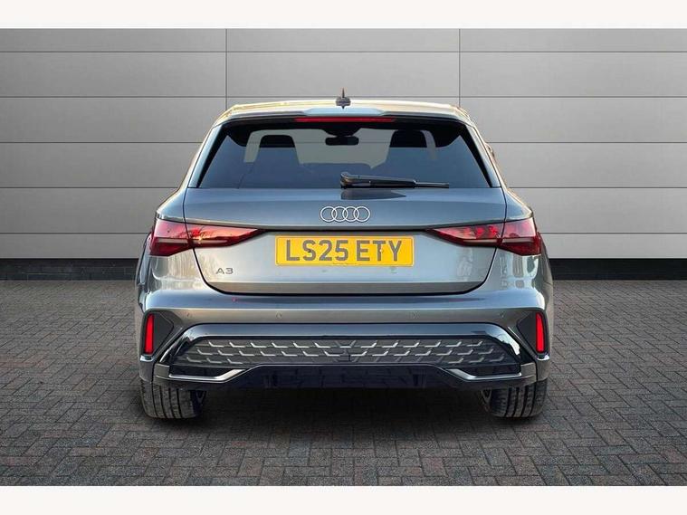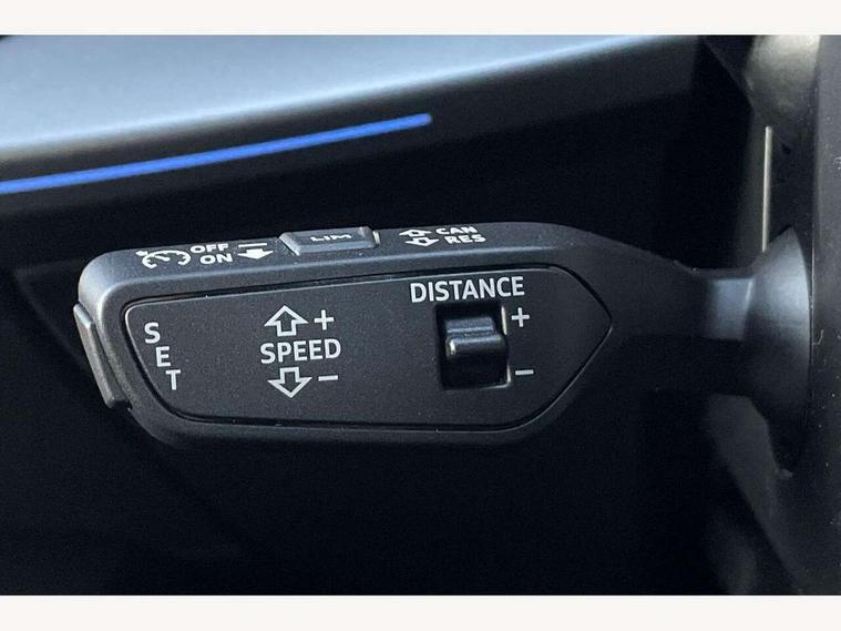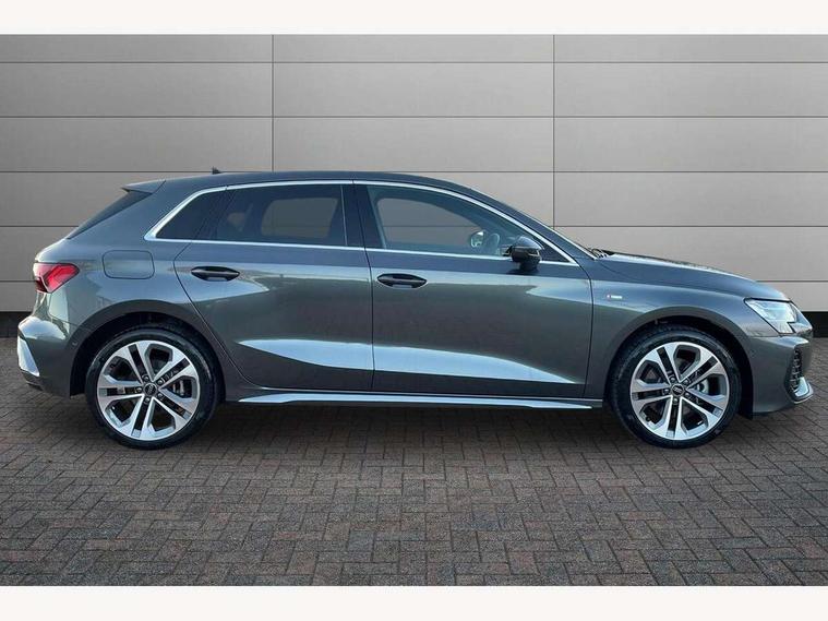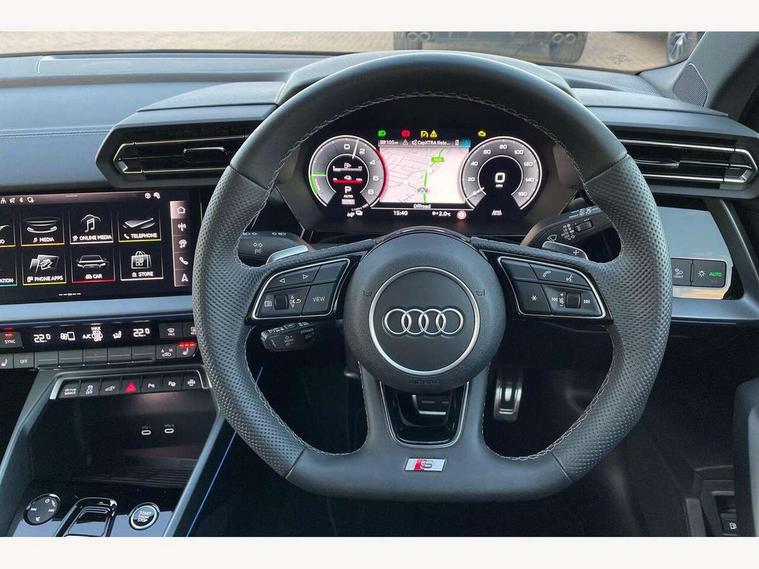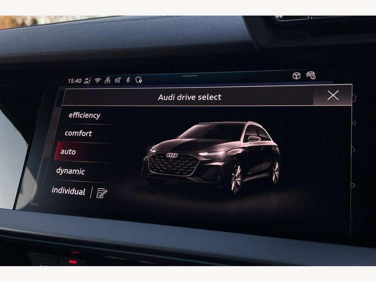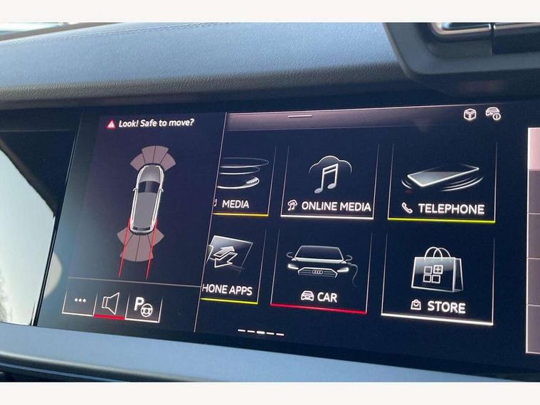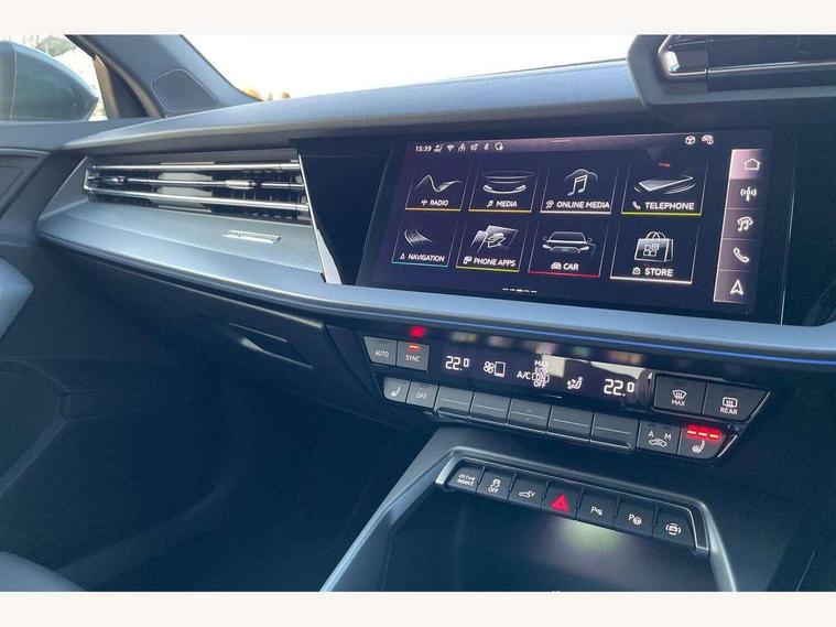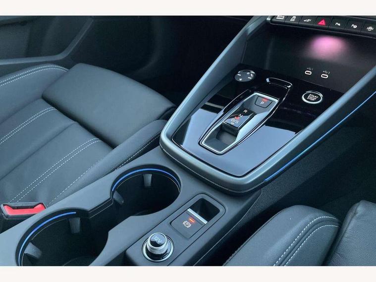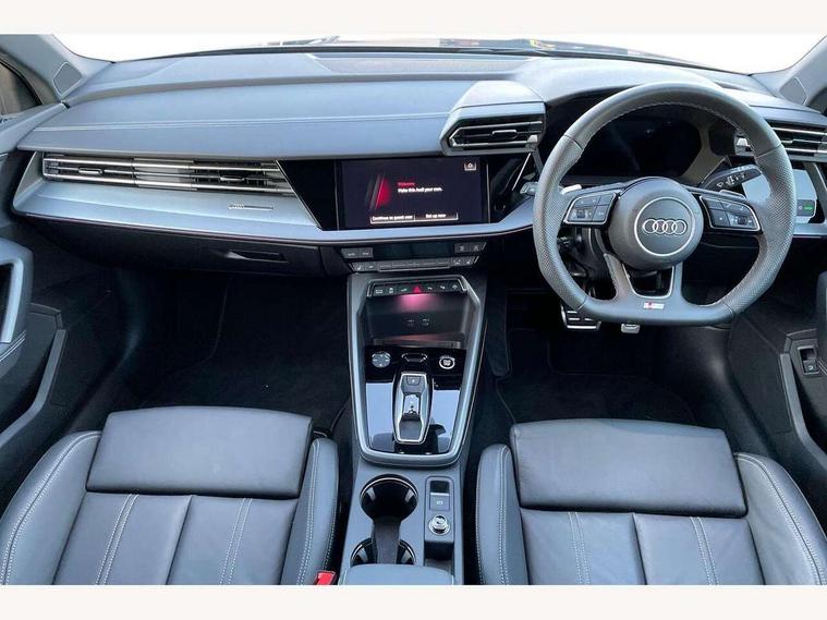 Adjustable speed limiter, Audi drive select, Audi smartphone interface with app store includes wireless Apple carplay, Android auto and Amazon alexa integration, Audi virtual cockpit plus - 12.3" full HD resolution dynamic digital instrument cluster, Automatic start/stop system with recuperation, Bluetooth interface, Camera based traffic sign recognition, Collision avoidance assistant, Cruise control, Distraction and Fatigue warning, e-Call (emergency call), Electromechanical power speed sensitive steering, Lane departure warning system, MMI Navigation Plus with high resolution 10.1" colour touch screen display, Park Assist with parking system Plus, Service indicator, Trip computer, Voice control system with natural language interaction, 3 pin 10 amp domestic charging cable, CCS socket for DC charging, Charging cable for public charging, mode 3 (type 2), up to 22 kW (AC), Compact charging system, Industrial connector CEE 32 A, 230 V, length 1.6 m, Standard suspension, Type 2 socket for AC charging, Audi Phonebox light with wireless charging, Audi sound system - 10 loudspeakers including centre loudspeaker and subwoofer, DAB Digital radio, USB ports with charging function in the rear, Acoustic glass windscreen, Aluminium window trim, Auto dimming frameless rear view mirror, Body colour exterior mirrors, Chrome exhaust tailpipes, Electrically adjustable/heated/folding/auto dimming door mirrors with integrated LED indications + kerb view function for passenger side, Exterior model badging, Front and rear side air inlets in grained matt black with dark liquid chrome frame, Front electric windows, Front radiator grill in high gloss dark chrome, Heat insulating glass windscreen, Illuminated door sills with aluminium inserts at the front with S logo, LED 3rd brake light, LED daytime running lights, LED headlights with LED rear lights and dynamic rear indicators, Light and rain sensors, Privacy glass - dark tinted rear window, rear door and side windows, Rear diffuser and grill in grained matt black with inlay in dark liquid chrome, Rear electric windows, Rear side wing doors, Rear wiper, S line bumpers, S roof spoiler, Side S line emblems on front wings, Side sill trim in dark liquid chrome, 12V socket and storage compartment in front centre console, 3 seat bench in 2nd row, 3 spoke flat bottomed leather multifunction sport steering wheel with gear shift paddles, 3-zone deluxe automatic air conditioning, 4 way electrically adjustable lumbar support for driver and front passenger, 40/20/40 split folding rear seat bench, Black cloth headlining, Convenience auxiliary air conditioning, Front and rear centre armrest in artificial leather, Front and rear centre armrest in artificial leather with contrasting stitching on armrests and instrument panel, Front and rear headrests, Front/rear floor mats, Heated front seats, Height and reach adjustable steering wheel, Manual boot compartment lid, Manually adjustable front seats, Rear cup holders, S badging on the steering wheel, Seat side bolsters, Single front passenger seat, Stainless steel pedals and front footrest in black, Twin leather upholstery with front sports seats S embossed logo, Aluminium interior elements pack - A3 Sportback, Multi-coloured LED interior lighting package - A3, 3x3 point rear seat belts, Acoustic vehicle alerting system, Driver and front passenger airbag with passenger airbag deactivation, Electronic Stabilisation Control (ESC) including ABS, ASR and EDL, First aid kit with warning triangle and 2 safety vests, Front side airbags with head airbags and interaction airbag, Hill hold assist, Pre-sense front with pedestrian and cyclist detection, Seatbelt monitoring, Tyre pressure loss indicator, Anti theft alarm, Anti-theft wheel bolts, Electronically operated child locks, Immobiliser, Remote central locking with safelock, Dash & door Inlay in dark aluminium Spectrum, Tyre repair kit,