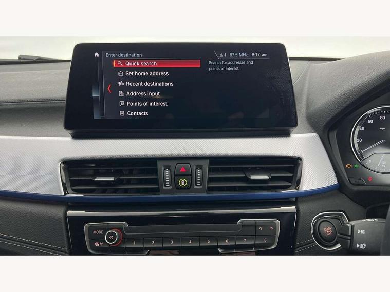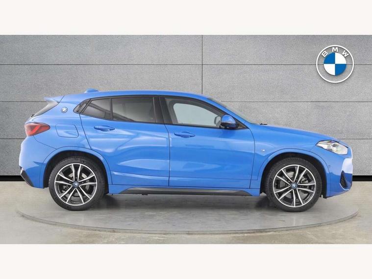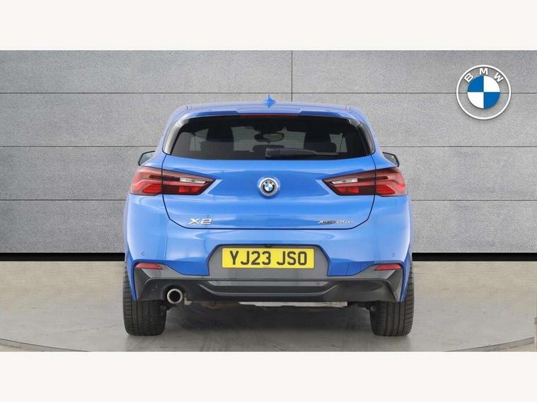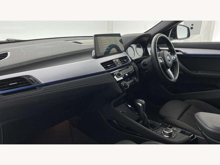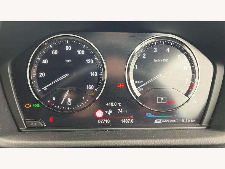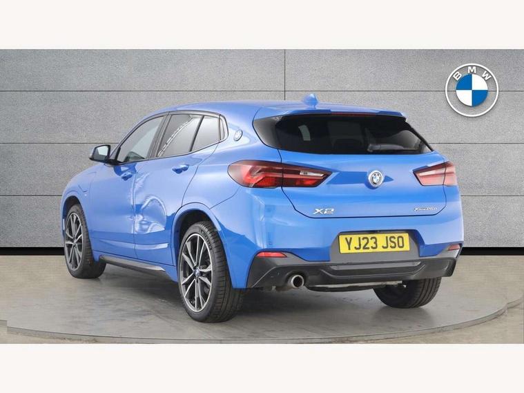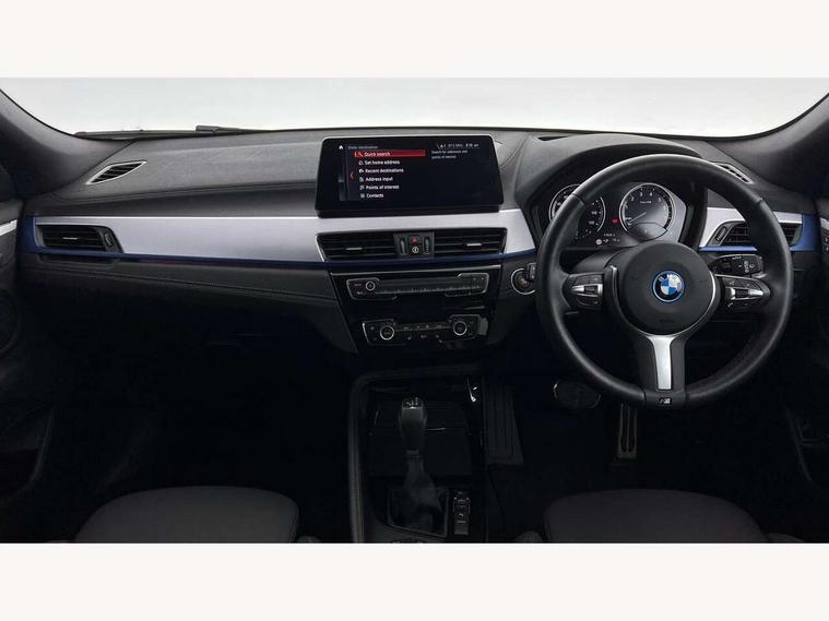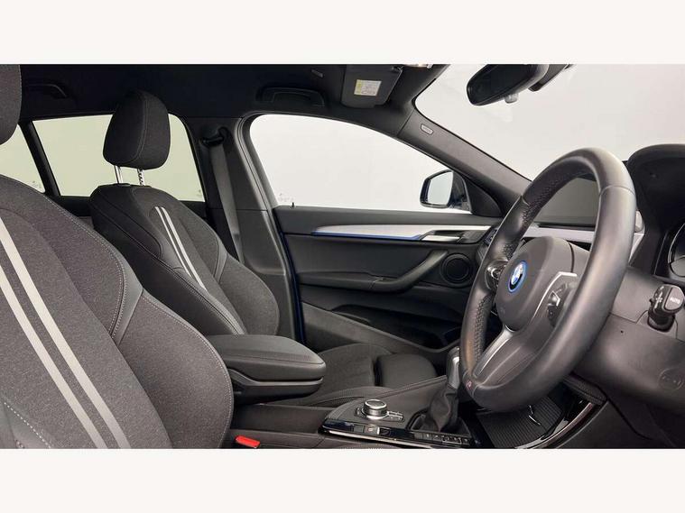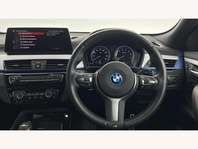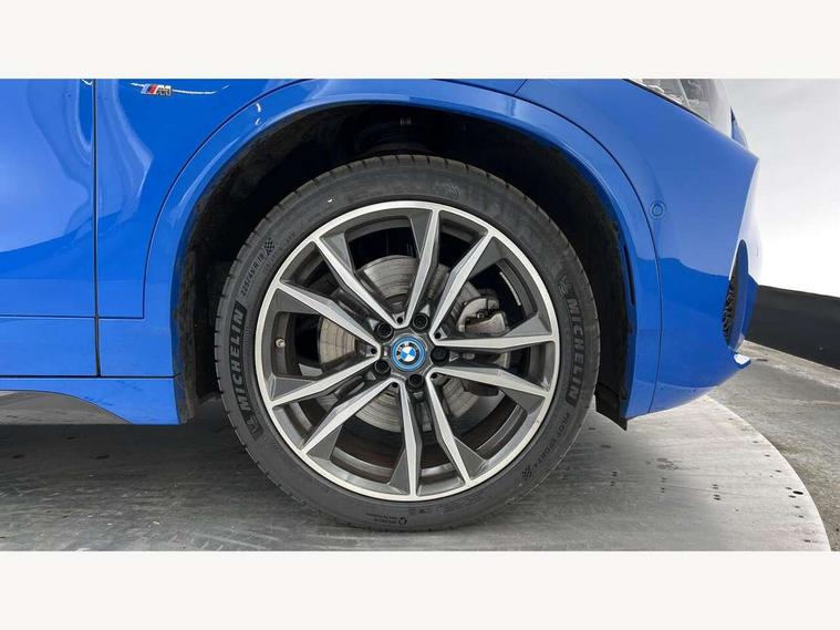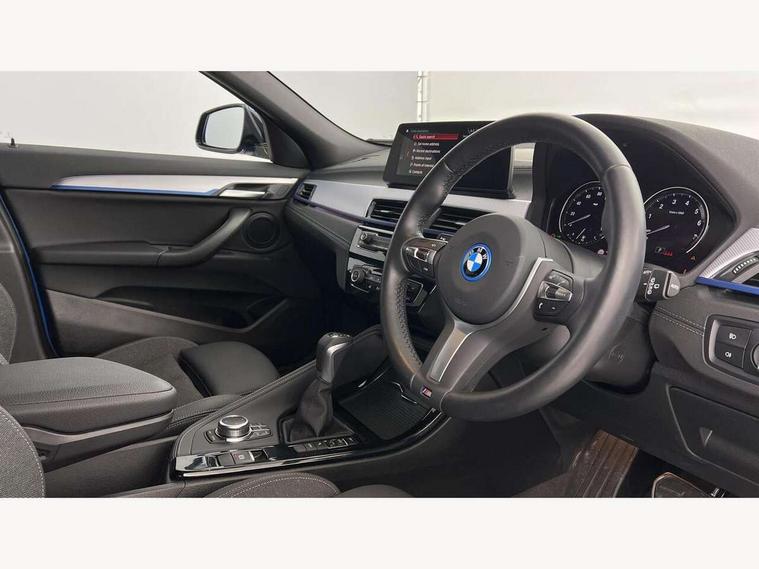 Active Guard incl approach control warning with city brake function and person warning with city brake function, Apple CarPlay preparation, Automatic powered electric bootlid, BMW ConnectedDrive online services, BMW Navigation system with 8.8" monitor, BMW Online services, BMW Teleservices, Brake pad wear indicator in front and rear, Check Control warning system for monitoring of lights and door/luggage compartment open warning, Connected eDrive Services, eDrive button activates auto eDrive, max eDrive and save battery modes, eDrive specific displays in instrument cluster and CID, Electric Power Steering (EPS) with Servotronic, Electro hydraulically controlled multi plate clutch in rear axle, Energy efficient operating strategy, Front axle single joint with specific axle kinematics to minimise drive influences on steering + provide increased rigidity agile driving behaviour, Instrument cluster with black optic and 5.7" colour display + speedometer + tachometer + fuel gauge + instant fuel economy, Integrated owners handbook, Lights on warning by audio warning signal when ignition is switched off, On board computer - average speed+fuel consumption, service interval, clock/date, odometer/trip meter, outside temperature display and ice warning, Operation by iDrive with direct selection buttons and 8 programmable buttons, Optimum shift indicator, Park assist system, Personal Profile, Real time traffic information, TMC for lifetime of vehicle, Variable and stepless distribution of drive torque between front and rear axle, 12V compressor with integrated sealant injection bottle and hose, 2.4kW AC charging with 5m cable, AC Fast Charging, Aluminium lightweight construction including crankcase, Anti roll bar front and rear, Automatic transmission, Balancer shaft, Double VANOS, Drive performance control with ECO PRO comfort + sport mode, eDrive exterior sound, Electric engine installed under rear seats driving the rear wheels, Electronic differential lock, High precision injection, Lithium-ion high voltage battery (10.0 kWh) fitted under rear seats, Performance Control, Transmission of power to rear axle via front axle differential and two-part cardan shaft, Twin tube gas filled shock absorbers with degressive characteristic curve, xDrive electric drive, after activation of the electric motor and common drive via all four wheels, 6 Speaker Loudspeaker system, Bluetooth audio streaming, BMW professional radio, DAB Digital radio, Steering wheel mounted audio/telephone controls, Adjustable headlights, Aero curtain, Automatic windscreen wipers and automatic headlight, Automatically dimming rear view mirror, BMW badge on bonnet, tailgate with integrated tailgate release and C pillars, Body colour door handles, Body colour mirror caps, Body colour roof trims, Chrome kidney grille with black vertical slats, Clear lenses direction indicator lights, Dark shadow front air intakes, Daytime running lights, Differentiation of xEV Vehicles - Blue ring around BMW roundel on wheel hub/tailgate/bonnet/c-pillar/steering wheel and side panel inscription, Direction indicator side lights integrated in exterior mirrors using LED technology, Door mirror integrated indicators, Dynamic brake lights, Electric folding exterior mirrors with anti-dazzle, Electrically adjustable and heated door mirrors glass aspheric on driver's side and convex on passenger side, Engine designation on electric bootlid - right, Fingertip control / anti-trap function on electric window, Front and rear bumper system, Front and rear electric windows, Green tinted heat protection glazing, Heated windscreen washer jets, High gloss black front side air intake with matt black insert, High gloss black in window frame, recess covers and B-Pillar trim, High gloss shadowline in window frame, recess covers, mirror frame and B-Pillar/C- pillar trim, High level third brake light, M logo designation in side chrome, M Sport spoiler, Model designation in left tailgate, Rear fog lights, Rear side wing doors, Rear tail lights with LED technology and 3D design, Rear window aerial, Rear window wiper with wash/wipe function, Reversing light in rear light cluster, Shark fin antenna, Single exhaust tailpipes with chrome finishers 90mm in left, Visible VIN plate, Welcome lighting, 2 cupholders in front centre console, 3 Spoke M sport nappa leather multifunction steering wheel, 40:20:40 manually split folding rear seat with two tilt positions for backrest, Anthracite headlining, Armrest in centre section of rear seat backrest and folding, Automatic two zone climate control air conditioning, Child seat ISOFIX attachment for two outer rear seats and front passenger seat with anchorage points, Conditioned based service, Contrast stitching on centre console and mid section of dashboard to match upholstery seam, Driver and front passenger seat heating, Driver/passenger sunvisors with ticket holders, Floor mats with black surround and M flag detail on front mats, Front and rear door armrests, Front armrest, Front axle always driven, Front door sill finishers with M designation, Front head restraints, Front sports seats, Illuminated charging socket with visual display of charge status, Interior light in front centre interior mirrors and rear centre auto interior light activation when door is opened when ignition switched off, Luggage compartment lighting, Luggage compartment loading edge with stainless steel insert, Luggage compartment with underfloor storage and four lashing eyes, Pre-conditioning of battery for optimum operating temperature, Pre-conditioning of interior via BMW Remote app or setting time within iDrive menu, Rake/reach adjustable steering wheel, Single front passenger seat, Three rear headrests, Additional interior lighting pack - X2, Extended storage pack - X2, M Sport aerodynamic pack - X2, 3 point seatbelts on all seats, front pyrotechnic belt tensioners, stopper and belt force limiters, rear coded belt buckles, Airbags - Front driver and passenger, front 