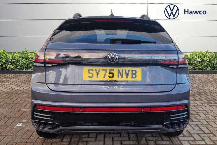 Adaptive cruise control, Advanced driver attention and drowsiness monitor, Digital cockpit pro - 10.25" high resolution TFT dash display screen with customizable menus and information, Driving profile selection, e-Call (emergency call), Power Steering, Travel assist including emergency assist, Washer fluid level indicator, Wireless Charging including Bluetooth, Start-stop system with battery regeneration (recuperation - energy recovery during braking), XDS electronic differential lock for improved traction and handling, Digital radio reception (DAB+), WeConnect plus, Ambient lighting with logo projection, Aspherical driver's exterior mirror, Auto headlights, Body coloured bumpers, Body coloured door handles, Cornering headlights, Electric windows, External USB type C socket and charging sockets, LED rear combination lamp, LED third brake light, Left convex exterior mirror, Power folding adjustable/heated exterior mirrors and front passenger exterior mirror lowering function, Rear fog light on one side, reversing light on both sides, Rear side wing doors, Rear wash/wipe with intermittent wipe setting, 12V socket in centre console, 2 front reading lights, 3 rear head restraints, 3 seat bench in 2nd row, Air care climatronic air conditoning system with active combination filter and 2-zone temperature control, Black carpets, Black roof lining, Child seat anchor for child seat system i-Size, 2x top tether and child seat anchor in front on front passenger side, Chrome bezel for instrument cluster, vents, door handles + gear shift, Driver and front passenger seat height adjustment, Front + rear carpet mats, Front centre armrest, Front footwell illumination, Front sports comfort seats, Heated front seats, Height and reach adjustable steering wheel, Interior ambient lighting and surround lighting, Karoso artvelours cloth upholstery, Leather trimmed gear knob, Leather wrapped multifunction steering wheel, Luggage compartment floor, Luggage compartment light, Lumbar support for driver's and front passengers seat, Seat covers in grey + titanium black, Single front passenger seat, Split folding backrest with centre armrest and unsplit rear seat bench, Stainless steel pedals, Storage compartment under front seats, Sun visors with illuminated vanity mirrors, Black design pack - Taigo Black Edition, Black roof pack with mirror housing - Taigo, IQ.LIGHT - LED matrix headlights pack - Taigo, Light and Sight pack including High beam assist - Taigo, 2 x 3-point seatbelts/outer rear seats with ECE label, 3-point seat belts in front with pretensioner and height adjustment, 3-point seatbelt for centre rear seat, Adaptive driver and front passenger airbags with passenger airbag deactivation function, Driver and front passenger safety-optimised head restraints, Electronic stability control, Extended and predictive pedestrian/ cyclist protection, Front and rear disc brakes, Front curtain and side airbags with center airbag, Hill start assist, Manual rear child locks, Single tone horn, Tyre pressure loss indicator, Anti-theft alarm system with interior monitoring, backup horn, and towing protection, Grey anodised matte decorative inserts in dash and front door panels, 18" York black alloy wheels with anti theft wheel bolts, Breakdown kit, Low rolling resistance tyres,