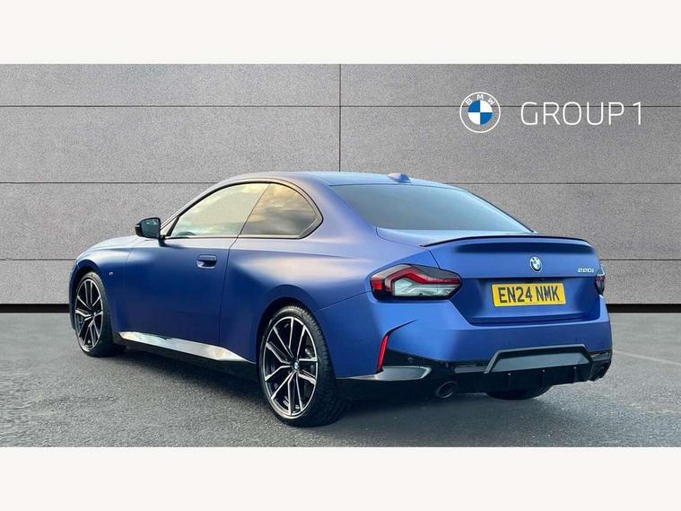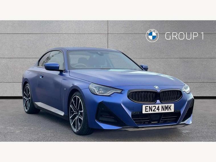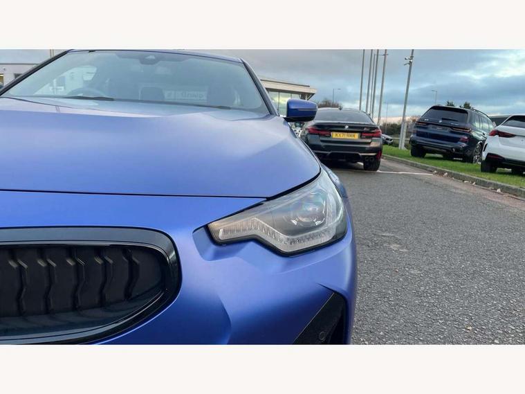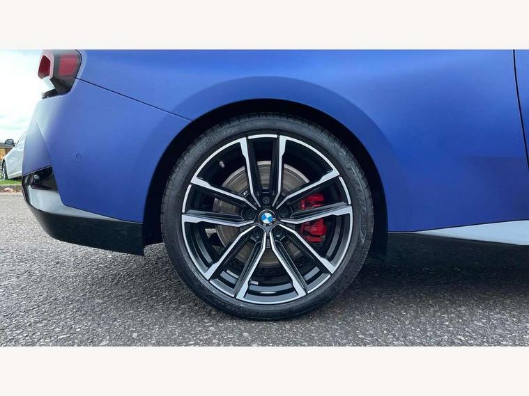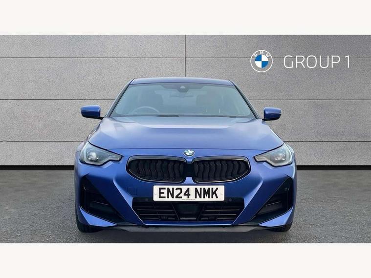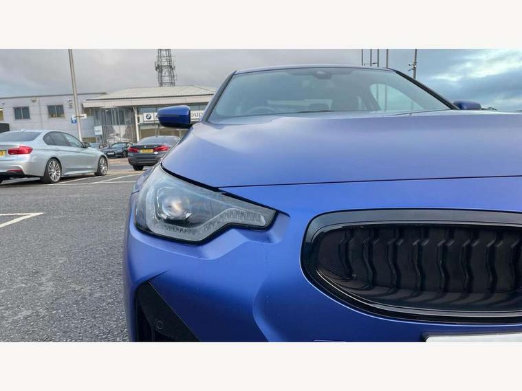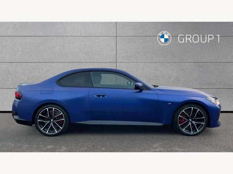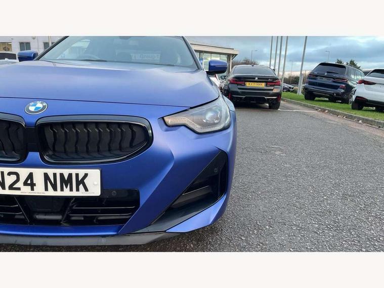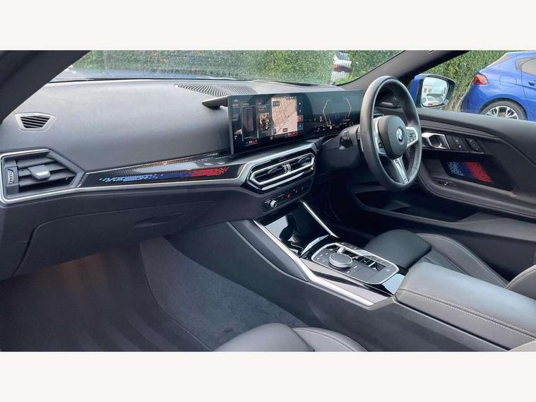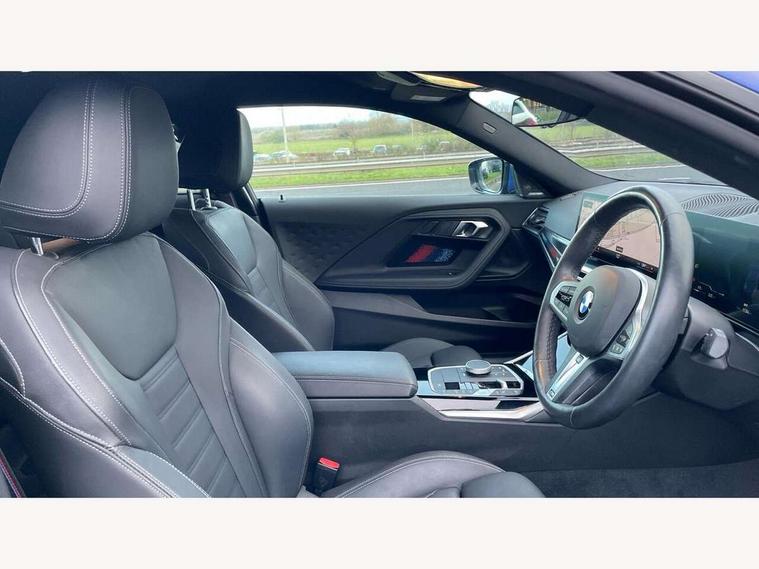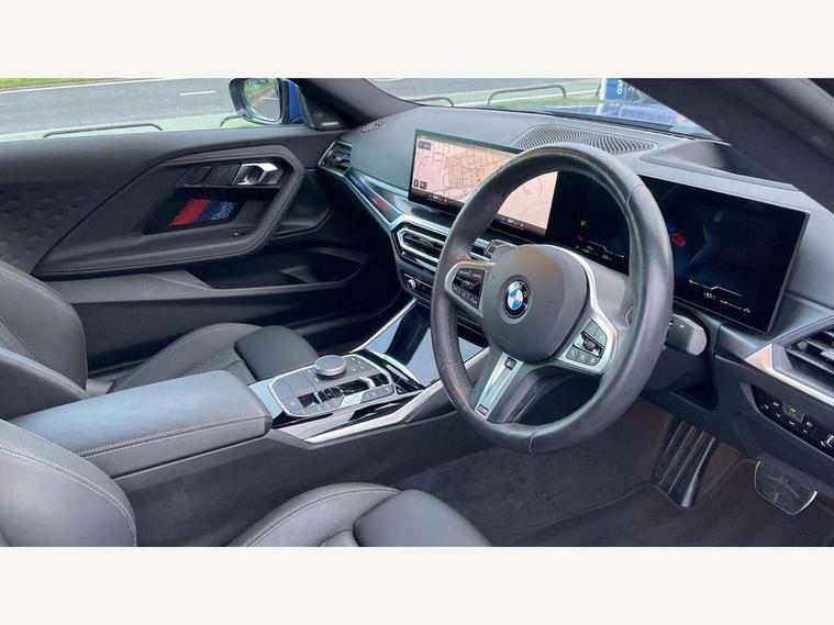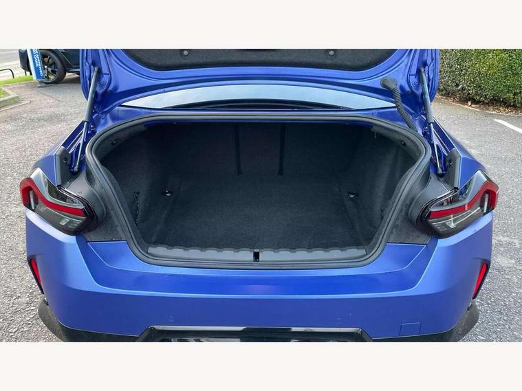 2 USB connections for charging and transferring data, Active guard plus, Attentiveness assist, Bluetooth with USB, BMW ConnectedDrive online services, BMW Intelligent Personal Assistant, BMW Live cockpit plus, BMW operating system 8 with variable, configurable widgets display information in real time, BMW Teleservices, Check Control warning system for monitoring of lights and door/luggage compartment open warning, Direct selection buttons, Drive off assistant, Eco pro mode, Electric power steering, eSim with 5G connectivity, Front and rear parking sensors, iDrive controller with turn and press function, Integrated owners handbook, Intelligent functions, Oil sensor for level and grade, Optimum shift indicator, Personal Profile, Touch operation on control display, Variable sport steering, Widescreen multi-media display, WiFi interface for wireless connection of mobile terminal devices, Aluminium lightweight construction, Balancer shaft, BMW TwinPower Turbo four-cylinder petrol engine, Double VANOS, Drive performance control with ECO PRO comfort + sport mode, Electronic differential lock, High precision injection, M sport suspension, Petrol Particulate Filter, Sport automatic steptronic transmission with gearshift paddles, manual gearshift time display, launch control, coasting idle ECO PRO/COMFORT modes, Twin scroll turbocharger with Valvetronic, DAB tuner, Acoustic windscreen wipers for reduced driving noise, Automatic windscreen wipers and automatic headlight, Body colour door handles flush with door surface, Body colour door mirrors, Body colour front and rear bumpers, Daytime running lights, Electric windows - front and rear, with open/close fingertip control and trap release, Exhaust tailpipes x2 - 90mm in left and right, Fading support, Front and rear bumper system with replaceable deformation elements, Front door sill finishers in black plastic with BMW designation, Front windscreen wipers with integrated washer jets, Green tinted heat protection glazing, High beam assistant, High gloss black sill, bumper trim sides and diffuser insert, High level third brake light, Indicators integrated int mirror housing, Interior rear-view mirror with automatic anti-dazzle function, LED registration plate light, LED technology rear tail lights, brake lights and turn indicators, Lightweight engineering, M high gloss shadowline, Model designation on right side of tailgate, One piece kidney grille with hight gloss chrome surround, Rear boot, Rear fog lights, Reversing light in rear light cluster, Shark fin antenna, Single part LED rear lights with smoked glass components, Trailer stabilisation logic, Visible VIN plate, 12V power socket in front centre console with blanking plug, 2 cupholders in front centre console, 2 zone automatic air conditioning, Ambient lighting, Compartment in front of cupholder, Conditioned based service, English handbook, Folding rear seat head rests, Front and rear side armrests integrated into door trim, Front armrest, Front door pockets, Front head restraints, Heated front seats, Illuminated glove compartment with separate small compartment, M headliner Anthracite, M sport leather steering wheel, Manually adjustment steering wheel column, Rear seat backrest with manual 40:20:40 split folding, Rear seat centre foldable armrest with integrated cup holder, Single front passenger seat, Storage compartment between rear seats, Storage tray and compartment with cover in centre console, Sun visors with vanity mirrors and insert tab, Through loading system with 40/20/40 split folding 2 rear seat in 2nd row, Velour floor mats, Additional storage compartment pack without USB - 2 Series Coupe, Connected pack professional - 2 Series Coupe, M Sport exterior styling aerodynamics pack - 2 Series Coupe, 2 tone horn, Anti lock braking system (ABS) with cornering brake control, Automatic Stability Control (ASC), BMW emergency call, Brake drying, Child seat ISOFIX attachment for the two outer rear seats, Crash sensor activating of airbags, Unlocking doors, hazard warning lights, interior light, safety battery terminal, Deactivation of fuel pump in the event of a crash, Driver and front passenger airbags, Driver and front passenger side airbags, integrated in the door side seat backrest bolsters for all seat variants, Dynamic brake control, Dynamic stability control + (DSC+), Dynamic Traction Control - DTC, Electrically operated hand brake including automatic hold function and automatic release when driving off, Front and rear disc brakes, Front centre airbag between driver and front passenger seats, Front passenger airbag deactivation, Head airbags for all 4 outer seats, PC iBrake (Post crash approach control warning with light braking function), Seat belt security check for driver and front passenger, Seatbelt warning, Side impact protection, Three point seat belts on 4 seats including front belt stopper, pyrotechnic belt tensioners and belt force limiters, Tyre pressure monitoring system, Warning triangle and first aid kit, Alarm system (Thatcham 1) with remote control and electronic engine immobiliser, Central locking switch for all doors, fuel filler cap and luggage compartment, Deadlocking function system to all doors, Drive away locking system on all doors and luggage compartment, Locking wheel bolts, Start/Stop button (illuminated) in centre console with keyless engine start and Auto Start-Stop deactivation button, Two remote control key with integrated key - one button for open and close doors/fuel flap/tailgate and separate button for unlock luggage compartment, Electrically powered 12V compressor, Reduced rolling resistance tyres, Tyre repair kit,