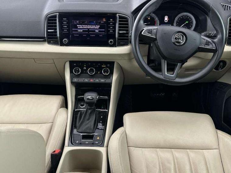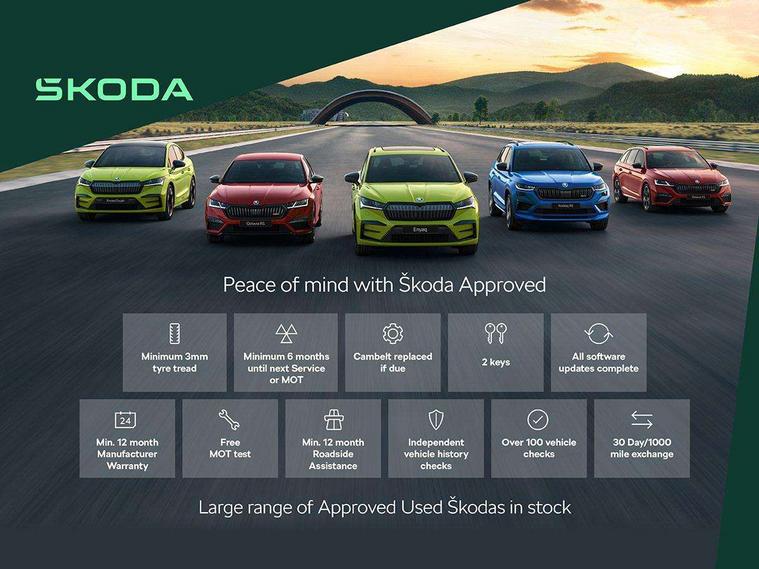 Drive mode selector, Driver alert system, Driver fatigue sensor, Driver profile selection, Multifunction colour trip computer, Outside temperature gauge, Rear view camera, Service interval indicator, Start/stop system with regenerative braking, DAB radio with Bluetooth, SD card slot, USB connection, Acoustic glass, Aero front windscreen wipers with intermittent function, Automatic headlight control system, Black electric window control buttons, Body colour door mirrors and handles, Body coloured bumpers, Electric front and rear windows with child proof lock, Full LED headlights + adaptive front light system + LED daytime running lights and front cornering fog lights, Headlight washers, Heated rear windscreen, LED rear lights with high functionality, Light assistant (coming/leaving home/tunnel light), Privacy glass, Safety reflectors on front doors, Third brake light, 1.5 litre bottle holders in driver and front passenger door panels, 12V socket in boot, 12v socket in front centre armrest with storage compartment and rear air vents, 2 Folding hooks and nets in boot, 2 Front readings lights for driver and passenger, 3 rear height adjustable headrests, 4 foldable roof handles with rear coat hooks, 4 lashing points on luggage floor, Backrest release, Cargo elements in boot, Chrome inner door handles, Dual zone climate control, Folding tables on the front seat backrests, Front head restraints, Front seat and rear pockets, Height adjustable front three point seats belts with tensioners, Height adjustable passenger seat, Height/reach adjust steering wheel, Ice scraper, Illuminated and cooled glovebox, Illuminated luggage compartment, Isofix child seat preparation outer rear, Net programme in boot, Pen holder, Pollen filter, Rear boot cover, Rear reading lights, Rear seats fixed folding and divided 60:40, Removable LED torch in the boot, Retractable parcel shelf attachable to tailgate, Safety vest holder, Storage box in upper central dashboard closed, Storage compartment below the passenger seat, Sunvisors with illuminated vanity mirrors, Textile floor mats, Umbrella under passenger seat, VarioFlex seats with retractable parcel shelf, Chrome roof rails + chrome pack - Kodiaq, Airbags - Front side, head, knee and curtain, Automatic door unlocking in case of crash, Automatic fuel cut off in case of crash, Driver airbag, Electronic parking brake with auto hold function, Emergency rear braking signal, ESC including ABS, MSR, ASR, EDS, HBA, DSR, RBS, MKB and traction control, Front assist radar scanning of the space in front of the car with automatic braking, Hill hold control, Passenger airbag with switch-off function, Pedestrian monitor, Seatbelt reminder signalisation and pretensioner for all seats, Three point seatbelts rear, Two tone horn, Tyre pressure display, Tyre pressure monitor, Alarm with interior monitoring, back up horn and tilt sensor with safe function, Electronic engine immobiliser, Keyless entry and keyless start with safe system, Remote central locking with 2 remote folding keys, Chrome framed air vents, Storage on wheel cover,