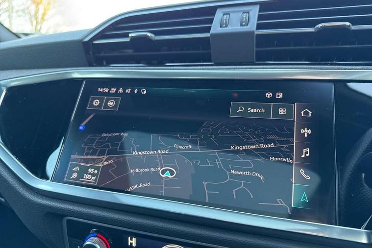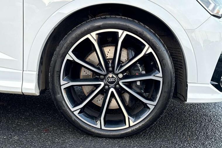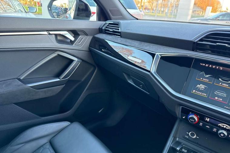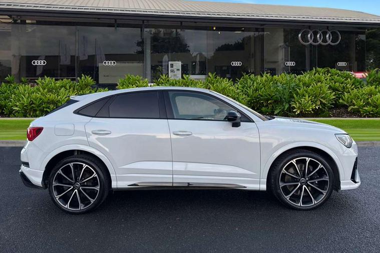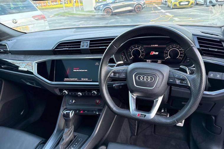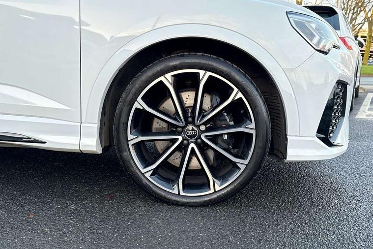 Audi connect safety and service (e-call), Audi drive select with new RS modes, Audi lane departure warning, Audi parking system plus with front and rear sensors, Audi virtual cockpit plus - 12.3 inch display, Bluetooth interface, Camera based traffic sign recognition, MMI Navigation Plus with high resolution 10.1 inch touchscreen colour display, Power operated tailgate, Progressive steering, Smartphone interface includes wireless Apple carplay/Android Auto, Start stop system with recuperation, Voice control system with natural language interaction, Quattro all wheel drive, 2 USB-C ports with charge and data functions, Audi sound system, DAB digital radio module, Acoustic windscreen, Audi Beam uses LEDs to project the Audi Sport logo, Auto dimming frameless rear view mirror, Body colour rear spoiler with lip in gloss black, Electrically folding, adjustable and heated door mirrors with integrated LED side indicators and kerb view function for passenger side, Flared wheel arches, Flat slits on single frame grille, Headlight washers, High gloss black finish B and C pillars, Honeycomb radiator grille in gloss black, Illuminated door sill trims with RS logo, LED headlights with LED daytime running lights and dynamic rear indicator, LED rear lights, LED third brake light, Panoramic glass sunroof, Privacy glass dark tinted rear and rear-side windows (from B-pillar backwards), Rain and light sensors, Rear side wing doors, Rear wiper, RS specific bumpers with large front air inlets in black, RS Sport exhaust system, dual branch with exhaust flap control and gloss black oval tailpipe trims, Tinted rear windows, Variable front intermittent wipers, 3 seat bench in 2nd row, 4 way electric lumbar support for driver and front passenger, Adjustable rear seat bench/backrest with centre armrest and cupholder, Black Alcantara elements - dashboard and the armrests in the front and rear doors, Black cloth headlining, Dual zone electronic climate control, Electrically adjustable front seats, Fine Nappa leather upholstery with front sports seats + honeycomb stitching and RS embossed logo, Front and rear floor mats, Front and rear head restraints, Front centre armrest, Heated front seats, ISOFIX child seat mounting for front passenger with airbag deactivation and outer rear seat including top tether attachment point for outer rear seats, Single front passenger seat, Stainless steel luggage compartment sill finisher, Stainless steel pedals, Ambient lighting pack - RS Q3, Black styling pack - RS Q3, Non smoking pack - RS Q3, 3x3 point rear seatbelts, 6 airbags - Driver, front passenger, curtain and side windows, Audi pre-sense front with pedestrain and cyclist recognition, Electrically operated child locks on rear doors, Electromechanical parking brake, Electronic stabilisation control including ABS, ASR and EDL, Front seatbelt reminder, Hill descent control, Hill hold assist, Pre sense basic, RS brake system, Seatbelt monitoring, Tyre pressure warning, Warning triangle and first aid kit, Advanced key, Anti theft alarm, Anti theft wheel bolts, Immobiliser, Aluminium look interior elements, Detail dashboard around MMI touch colour display in glass look, black with surround in aluminium look, Inlay - Black piano finish, Tool kit, Tyre repair kit,