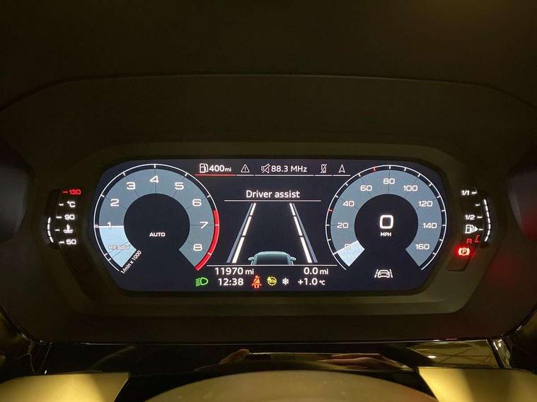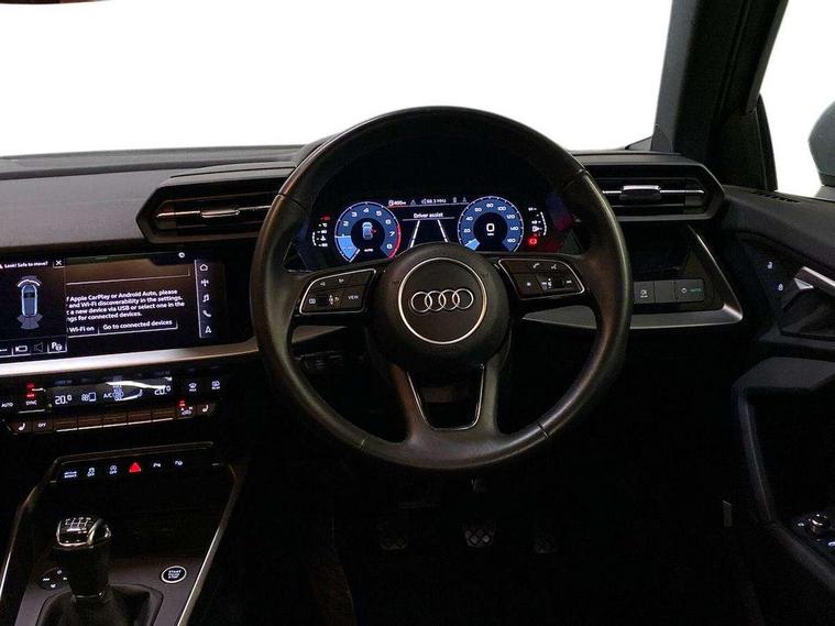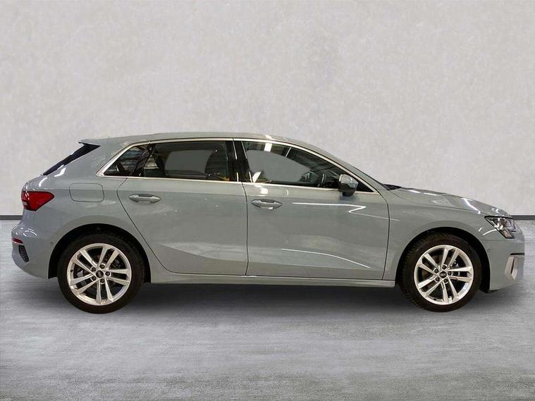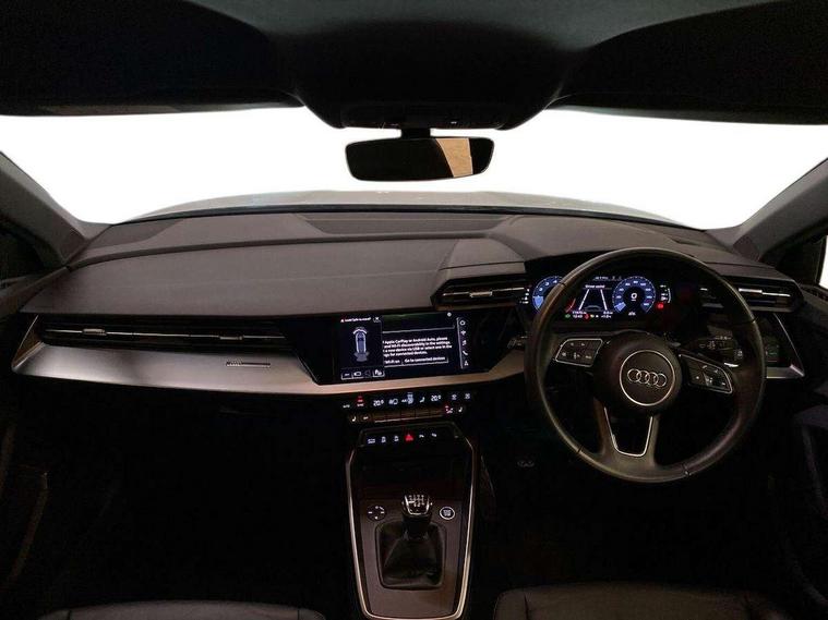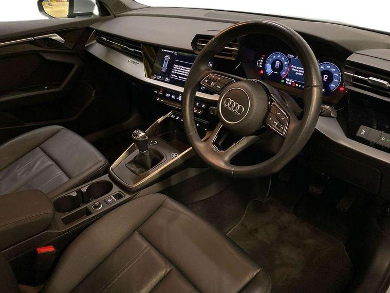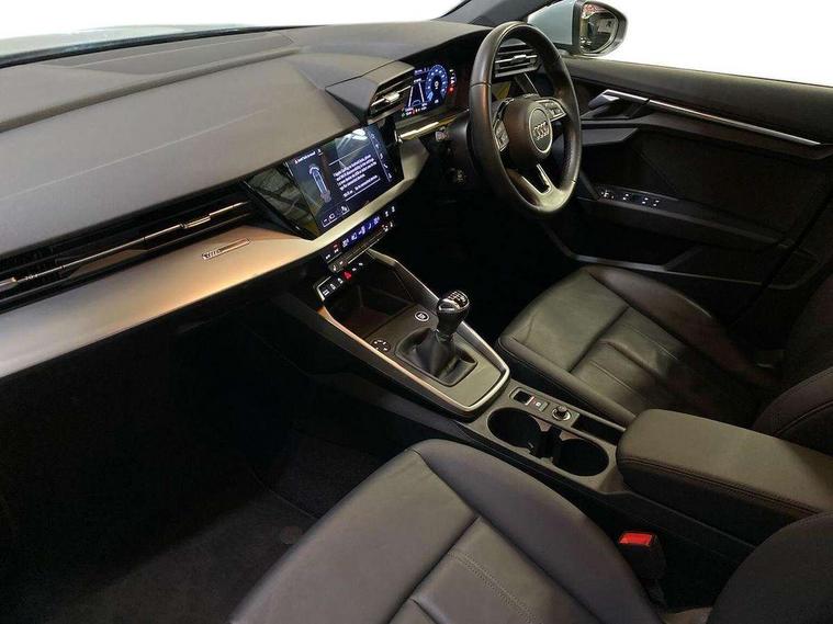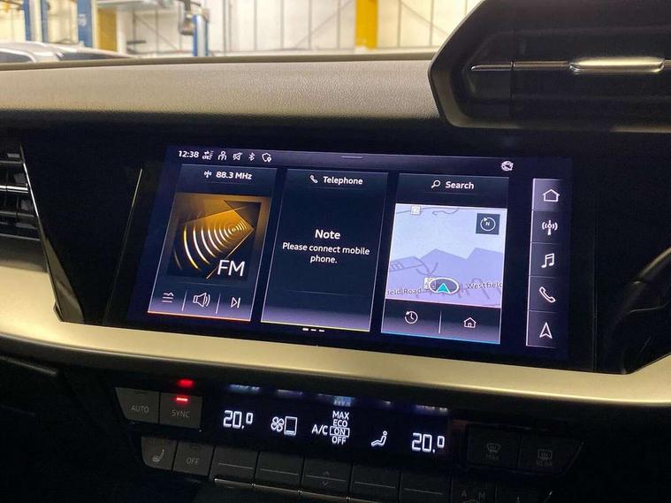 Audi connect emergency call and service, Audi drive select (Auto, Comfort, Dynamic and Individual), Audi smartphone interface, Audi Virtual Cockpit - 10.25" digital and colour instrument cluster, Automatic start/stop system with recuperation, Bluetooth interface, Collision avoidance assistant, Electromechanical power speed sensitive steering, Lane departure warning system, MMI Navigation Plus with high resolution 10.1" colour touch screen display, Service indicator, Trip computer, Voice control system with natural language interaction, Standard suspension, 2xUSB-C connection with data and charging functions, 6 passive loudspeakers, DAB Digital radio, 3rd brake light, Acoustic glass windscreen, Aluminium window trim, Auto dimming frameless rear view mirror, Body colour exterior mirrors, Body colour roof spoiler, Electrically adjustable/heated/folding/auto dimming door mirrors with integrated LED indications + kerb view function for passenger side, Front electric windows, LED daytime running lights, LED headlights and halogen rear lights, Light and rain sensors, Rear electric windows, Rear window, rear door windows and rear side windows in clear glass, Rear wiper, 12V socket and storage compartment in front centre console, 40/20/40 split folding rear seat bench with cupholder, Dual zone electronic climate control, Front and rear centre armrest, Front and rear headrests, Front door sill trims with aluminium inlay, Front/rear floor mats, Height and reach adjustable steering wheel, Interior lighting - Front and rear roof module including reading lights, glove compartment light and right hand side, Luggage compartment floor covering, Manual boot compartment lid, Manually adjustable front seats, Seat side bolsters, Steel grey cloth headlining, Twin leather upholstery, Aluminium interior elements pack - A3 Sportback, Sport styling pack - A3 Sportback, 3x3 point rear seat belts, Driver and front passenger airbag with passenger airbag deactivation, Electronic Stabilisation Control (ESC) including ABS, ASR and EDL, First aid kit with warning triangle and 2 safety vests, Front side airbags with head airbags and interaction airbag, Hill hold assist, Pre-sense front with pedestrian and cyclist detection, Seatbelt monitoring, Tyre pressure loss indicator, Anti theft alarm, Anti-theft wheel bolts, Electronically operated child lock, Immobiliser, Remote control central locking, Inlays with silk effect paint in platinum grey,