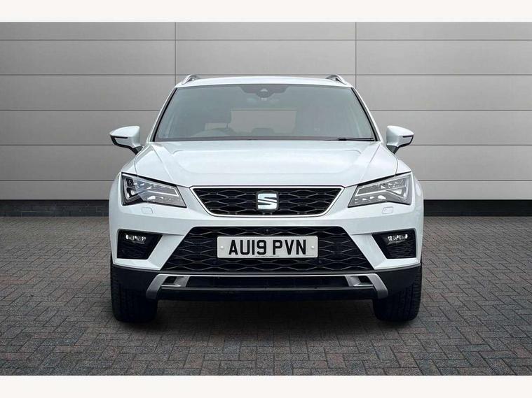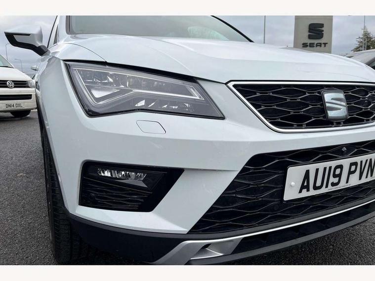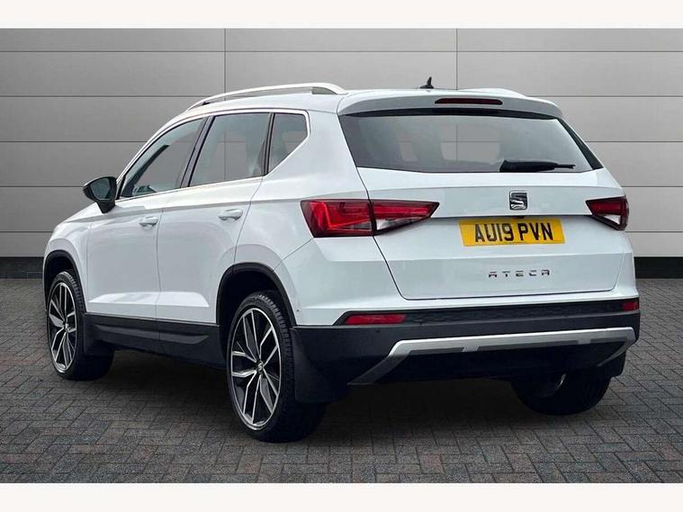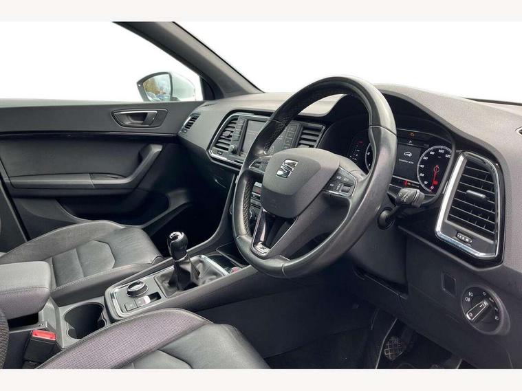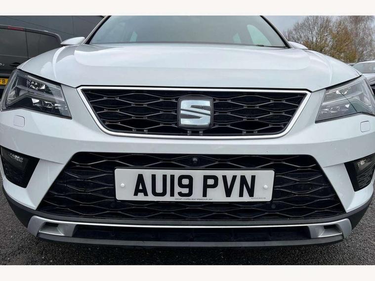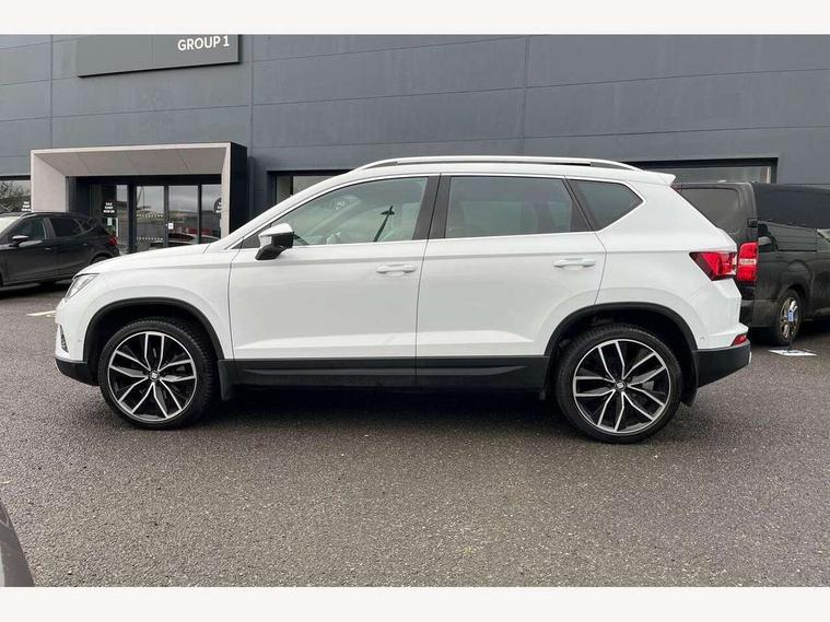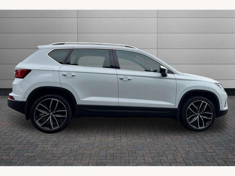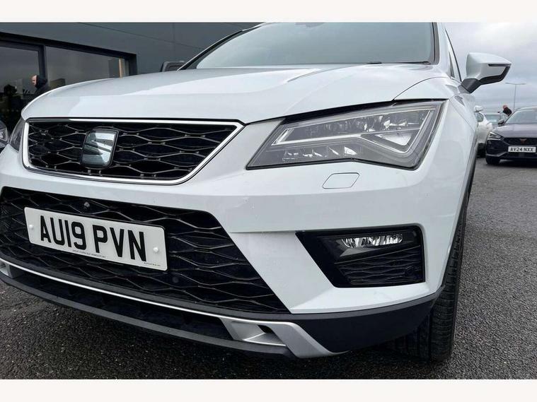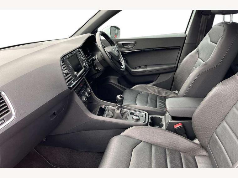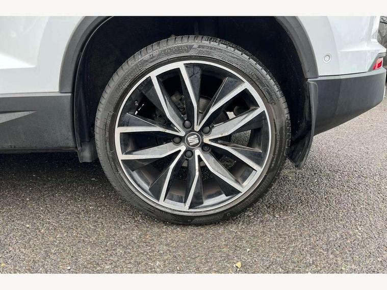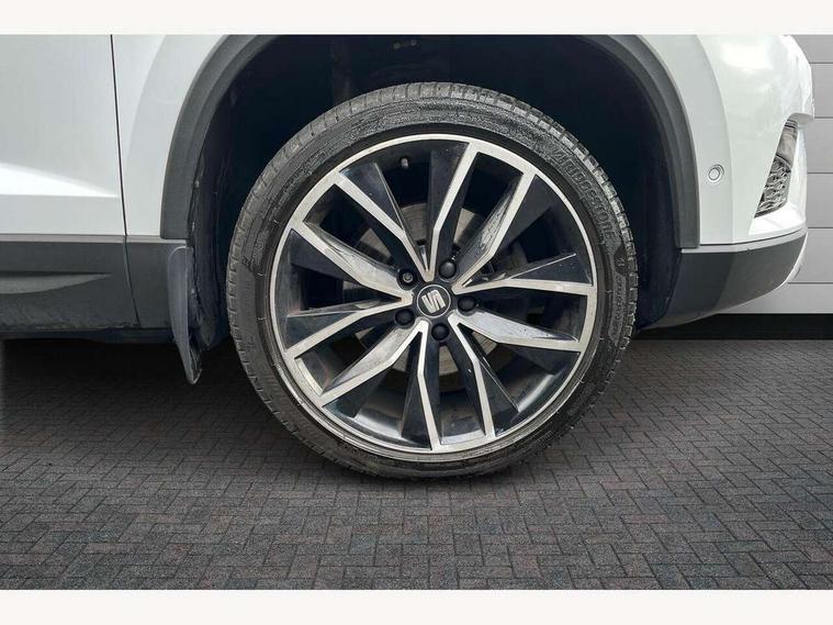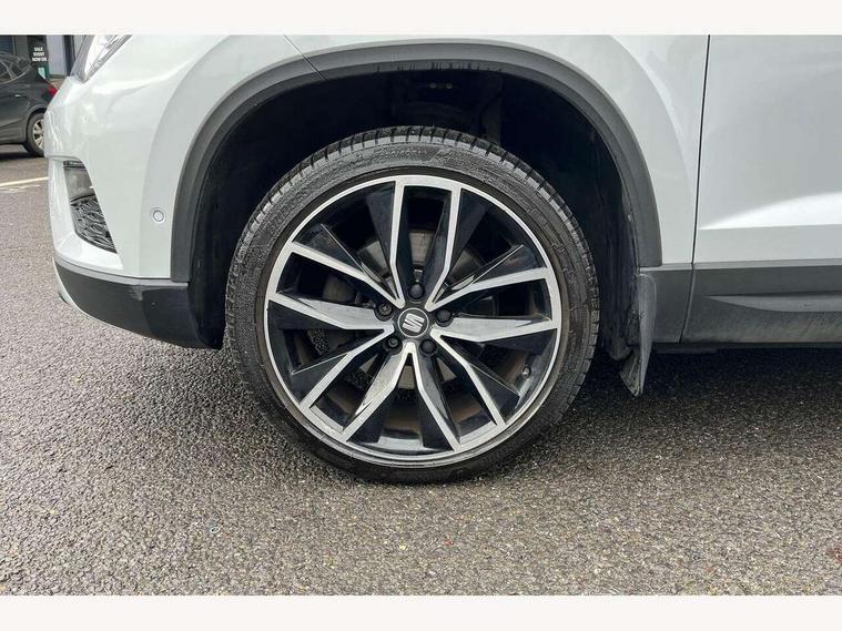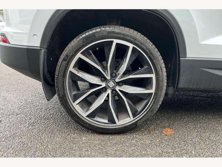 'Lights On' Reminder warning buzzer, 8.0" colour touchscreen with proximity sensor, Adaptive cruise control, Digital clock, Digital cockpit, Driver alert system, Electric tailgate with virtual pedal, Full Link Smartphone Integration with Mirror Link, Apple Car Play, Google Android Auto, Low fuel warning light, Multi function display, Outside temperature gauge, Park assist system with steering assist, Progressive power assisted steering, Rear view camera, Remote fuel flap release, RPM counter, Satellite navigation system, SEAT Drive profile, SEAT logo boot release, Self parking functionality (includes front and rear parking sensors), Top view camera, Trip computer, Wireless Smartphone charger, Comfort suspension, XDS electronic differential lock, SEAT USB media cable, Steering wheel mounted audio/phone controls, Aluminium front door sills, Auto dimming rear view mirror, Automatic headlights, Black wheel arch extensions, Body colour bumpers, Body colour door handles, Body colour door mirrors, Chrome roof rails, Chrome side window trim, Chromed centre radiator grille surround, Dark tinted rear windows, Door mirrors with welcome CUPRA light silhouette, Electric folding door mirrors, Electrically adjustable and heated door mirrors, Front and rear electric windows, Full LED headlights, Heated windscreen, Hidden exhaust pipe, High gloss black grille, LED daytime running lights, LED front fog lights with static cornering light function, LED Headlights, LED tail lights, Rear fog lights, Rear wash/wipe, Twin chromed exhaust pipes, Welcome lighting, 12V power point front, 3 height adjustable rear headrests, 4 Lashing eyes in boot, 60/40 split folding rear seat, Active head restraints, Adjustable front armrest with storage compartment, Advanced multicolour ambient light with LED interior light and LED illuminated glovebox, Black roof lining, Driver sunvisor with covered mirror + card holder, Driver/passenger lumbar adjustment, Driver/passenger sunvisors with illuminated vanity mirrors, Dual zone climate control, Footwell illumination, Front courtesy lights, Front cupholders, Front reading lights, Front seat back storage pockets, Gear shift indicator, Height adjustable driver's seat, Height adjustable front headrests, Height adjustable passenger seat, Illuminated boot, Illuminated door sills, Instrument lighting with brightness control, Isofix child seat preparation, Leather steering wheel and gear knob, Leather upholstery, Rear armrest, Rear central air outlet, Rear reading lights, Sports seats, Storage box under drivers seat, Advanced Driving Assistance Pack - Ateca Xcellence, Convenience pack - Ateca, Navigation system pack - Ateca, Winter Pack - Ateca, 3x3 point rear seatbelts, ABS, Auto hold function, Automatic post collision braking, Driver/Front Passenger airbags, Drivers knee airbag, Electronic parking brake, Electronic stability control, ESP+EBA, Front and rear seatbelt reminder, Front assist including city emergency braking, Front passenger airbag deactivation, Front side airbags, Hill hold control, Predictive pedestrian protection, Tiredness recognition system, Traction control, Twin curtain airbags, Tyre pressure monitoring system, 2 folding remote keys with window open/close function, Immobiliser, Keyless entry and start, Locking wheel bolts, Remote central locking, Volumetric alarm with back up horn, Chrome effect dashboard facia, 19" Exclusive machined bi-colour alloy wheels,