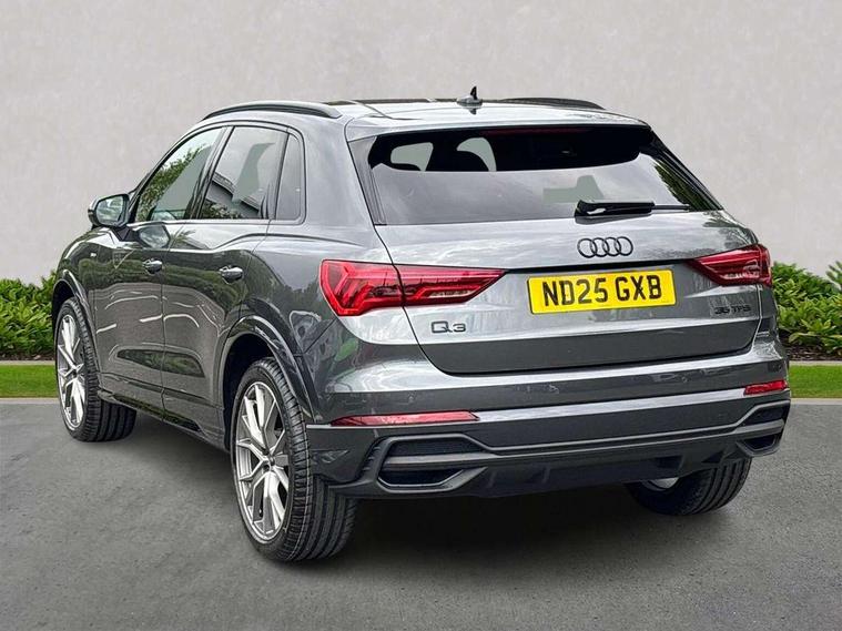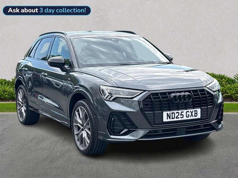 Amazon alexa Integration, Audi connect safety and service, Audi drive select, Audi lane departure warning, Audi Virtual Cockpit - 10.25" display, Bluetooth interface, Camera based traffic sign recognition, Distraction and Fatigue warning, Legal emergency call, MMI Navigation Plus with high resolution 10.1 inch touchscreen colour display, Power operated tailgate, Progressive steering, Service interval indicator, Smartphone interface includes wireless Apple carplay/Android Auto, Start stop system with recuperation, Voice control system with natural language interaction, Sports suspension, 2 USB-C ports with charge and data functions, 6 passive loudspeakers, DAB digital radio module, Acoustic windscreen, Audi Beam uses LEDs to project the Audi logo onto the ground as you exit your Q3, Auto dimming door mirrors, Auto dimming frameless rear view mirror, Black roof rails, Electrically folding, adjustable and heated door mirrors with integrated LED side indicators and kerb view function for passenger side, Front and rear electric windows, Front fog lights, Grille vertical bars in aluminium silver/Matt, High gloss black finish B and C pillars, LED Dynamic rear indicators, LED headlights with LED daytime running lights, LED rear lights, LED third brake light, Privacy glass dark tinted rear and rear-side windows (from B-pillar backwards), Rain and light sensors, Rear diffuser grille in grained matt black, Rear diffuser strip in matt anthracite black, Rear side wing doors, Rear wiper, S line bumpers in contrasting Manhattan grey, Variable front intermittent wipers, 12V socket in rear centre console, 3 seat bench in 2nd row, 40:20:40 folding with manual adjustment for 60:40 forwards/backwards position and backrest angle, Adjustable rear seat bench/backrest with centre armrest and cupholder, Black cloth headlining, Dual zone electronic climate control, Electric lumbar support, Front and rear black floor mats with contrast stitching in rock grey, Front and rear headrests, Front centre armrest, Height and reach adjustable steering wheel, Illuminated door sill trims with S logo, ISOFIX child seat mounting for front passenger with airbag deactivation and outer rear seat including top tether attachment point for outer rear seats, Manual front seats with height adjustment, Perforated leather gearknob, Single front passenger seat, Stainless steel luggage compartment sill finisher, Stainless steel pedals, Twin leather upholstery with front sport seats + S embossing, Black styling pack - Q3, Non smoking pack - Q3, 3x3 point rear seatbelts, 6 airbags - Driver, front passenger, curtain and side windows, Audi pre-sense front with pedestrain and cyclist recognition, Electrically operated child locks on rear doors, Electromechanical parking brake, Electronic stabilisation control including ABS, ASR and EDL, Front seatbelt reminder, Hill descent control, Hill hold assist, Pre sense basic, Seatbelt monitoring, Tyre pressure warning, Warning triangle and first aid kit, Anti theft wheel bolts, Immobiliser, Remote central locking, Thatcham approved category 1 anti theft alarm, Aluminium look interior elements, Detail dashboard around MMI touch colour display in glass look, black with surround in aluminium look, Leatherette door armrest, Piano black inlay,