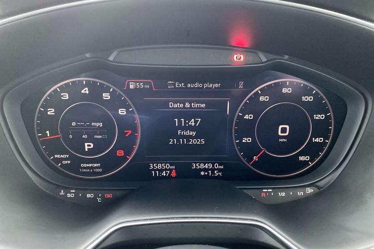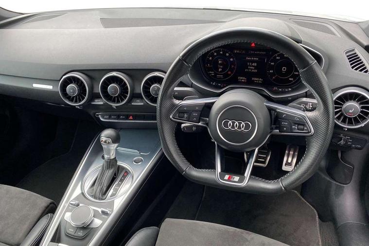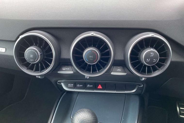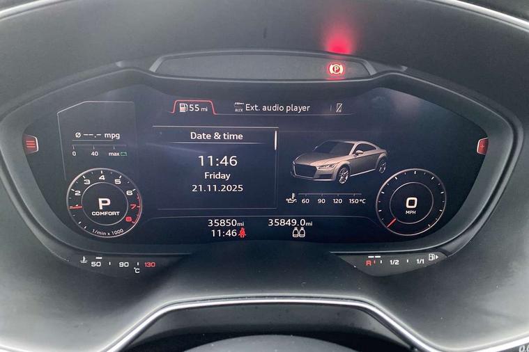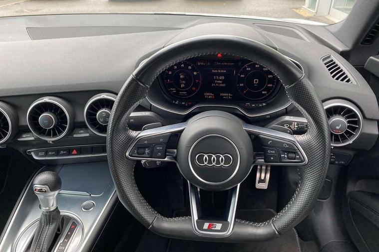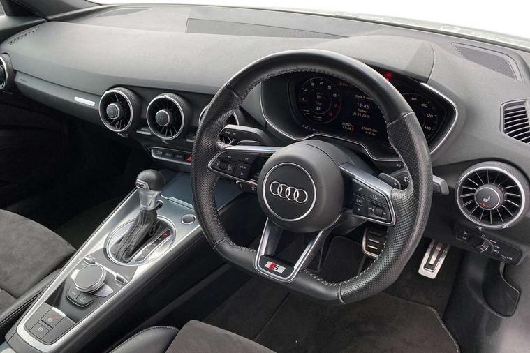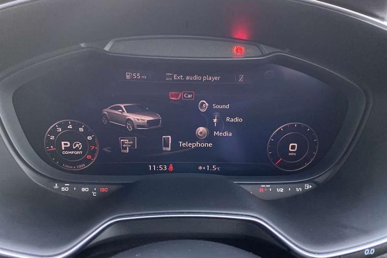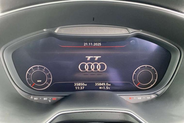 Audi drive select with 4 Pre configured modes, Audi smartphone interface, Audi virtual cockpit - 12.3" high-resolution LCD display with fully customisable instrument cluster, Cruise control + speed limiter, Emergency call service, MMI touch panel, Mobile phone preparation with bluetooth interface, Progressive power assisted steering, Service interval indicator, Start/Stop system with energy recuperation, TP memo, Sports suspension, AM/FM radio, Bluetooth audio streaming, DAB Digital radio, MMI Radio with CD player and SD/XC card slot, Auto dimming rear view mirror, Auto headlight range control, Black chrome tailpipe, Dark privacy glass from B-pillar backwards, Electric folding door mirrors, Electric front windows, Electrically adjustable and heated door mirrors with integrated LED side indicators, Front fog lights, Green tinted heat insulating glass, LED 3rd brake light, LED daytime running lights, LED headlights with LED rear lights + dynamic rear indicators, Light and rain sensors, Rear boot, Sunband for windscreen, 12V socket, 2 rear seats, 3 spoke flat bottomed high multi-function leather sport steering wheel with gearshift paddles, 4 way electric lumbar support for driver and front passenger, Black headlining, Contrasting silver stitching in steering wheel, Door sill trims, Extended aluminium look with stainless steel pedals, Front centre armrest, Front passenger seat, Front super sports seats, Heated front seats, Height/reach adjust steering wheel, Integrated head restraints, ISOFIX child seat mounting for front passenger seat with airbag deactivation, Manual adjustment of seat height, fore/aft position, seat angle, seat depth and backrest angle, Perforated leather gearknob in black, Rear head restraints, Rear top tether child seat ISOFIX attachment, Split folding rear seat, Black styling pack - TT, Non smoking pack - TT/TT RS, 3 point front seat belts, ABS, ASR traction control, Curtain airbags, Driver and front passenger airbag with front passenger airbag deactivation, EDL traction control, Electromechanical parking brake, ESP, First aid kit, Front side airbags, Head airbags, Hill hold assist, Seatbelt warning, Tyre pressure loss indicator, Warning triangle, Anti theft alarm, Anti theft wheel bolts, Immobiliser, Keyless Go, Remote central locking, Matt brushed aluminium inlays, Tool kit, Tyre repair kit,