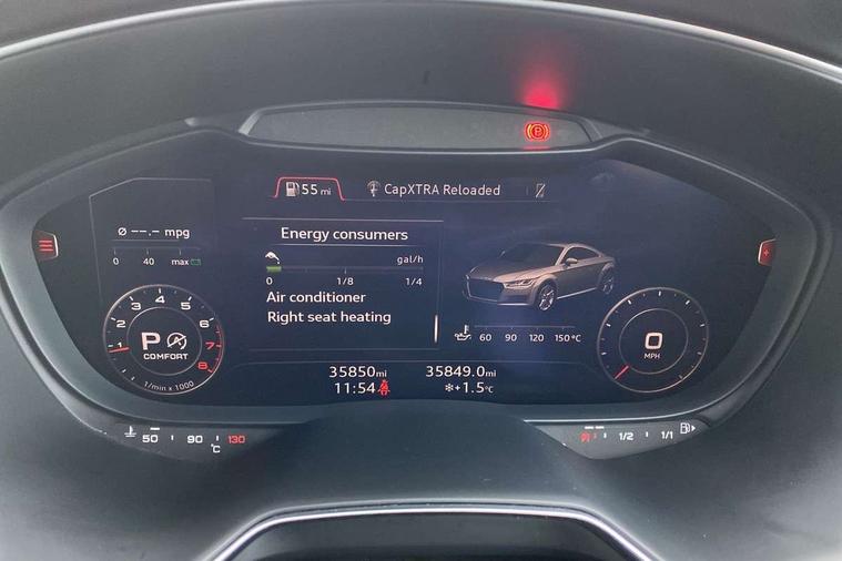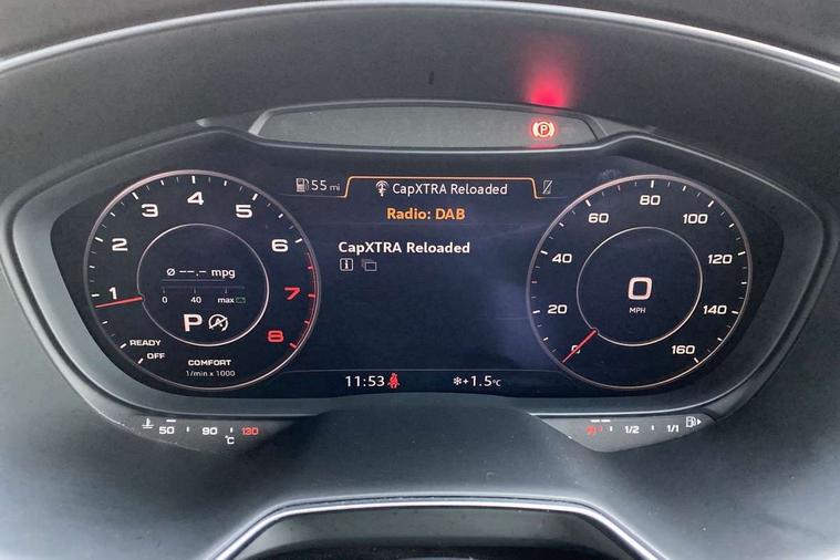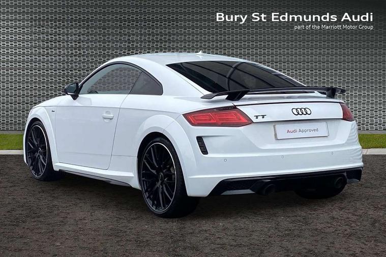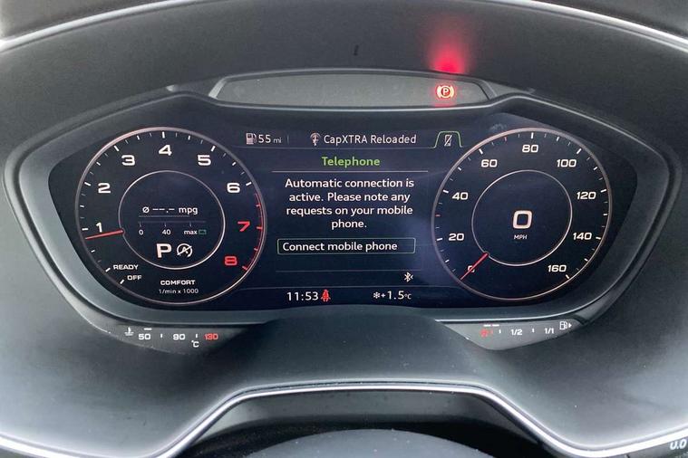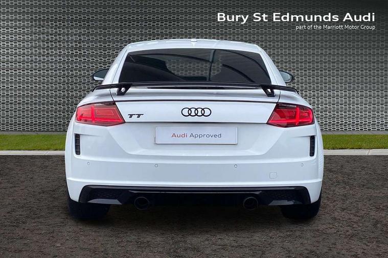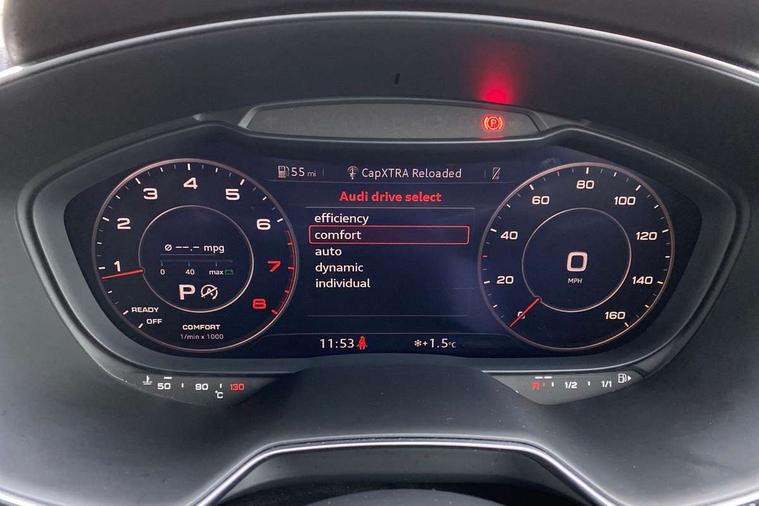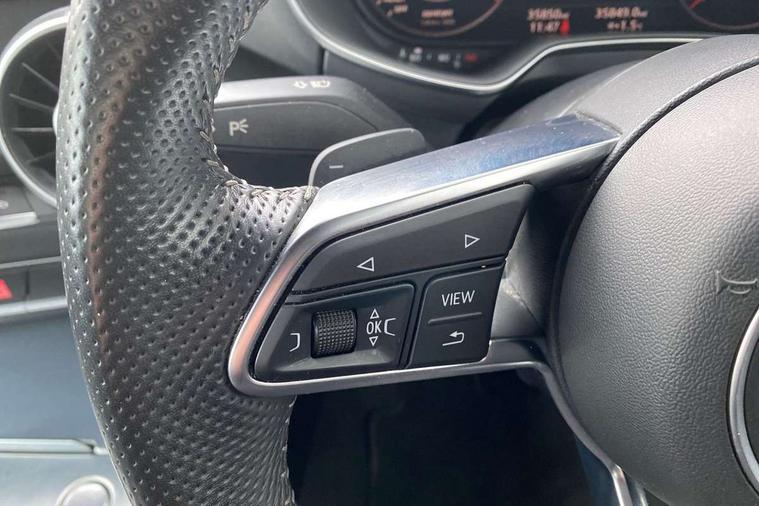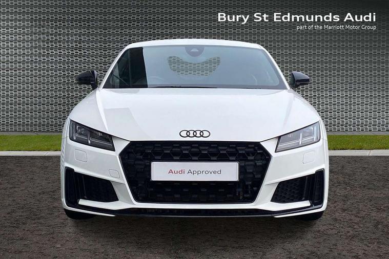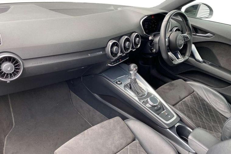 Audi drive select with 4 Pre configured modes, Audi smartphone interface, Audi virtual cockpit - 12.3" high-resolution LCD display with fully customisable instrument cluster, Cruise control + speed limiter, Emergency call service, MMI touch panel, Mobile phone preparation with bluetooth interface, Progressive power assisted steering, Service interval indicator, Start/Stop system with energy recuperation, TP memo, Sports suspension, AM/FM radio, Bluetooth audio streaming, DAB Digital radio, MMI Radio with CD player and SD/XC card slot, Auto dimming rear view mirror, Auto headlight range control, Black chrome tailpipe, Dark privacy glass from B-pillar backwards, Electric folding door mirrors, Electric front windows, Electrically adjustable and heated door mirrors with integrated LED side indicators, Front fog lights, Green tinted heat insulating glass, LED 3rd brake light, LED daytime running lights, LED headlights with LED rear lights + dynamic rear indicators, Light and rain sensors, Rear boot, Sunband for windscreen, 12V socket, 2 rear seats, 3 spoke flat bottomed high multi-function leather sport steering wheel with gearshift paddles, 4 way electric lumbar support for driver and front passenger, Black headlining, Contrasting silver stitching in steering wheel, Door sill trims, Extended aluminium look with stainless steel pedals, Front centre armrest, Front passenger seat, Front super sports seats, Heated front seats, Height/reach adjust steering wheel, Integrated head restraints, ISOFIX child seat mounting for front passenger seat with airbag deactivation, Manual adjustment of seat height, fore/aft position, seat angle, seat depth and backrest angle, Perforated leather gearknob in black, Rear head restraints, Rear top tether child seat ISOFIX attachment, Split folding rear seat, Black styling pack - TT, Non smoking pack - TT/TT RS, 3 point front seat belts, ABS, ASR traction control, Curtain airbags, Driver and front passenger airbag with front passenger airbag deactivation, EDL traction control, Electromechanical parking brake, ESP, First aid kit, Front side airbags, Head airbags, Hill hold assist, Seatbelt warning, Tyre pressure loss indicator, Warning triangle, Anti theft alarm, Anti theft wheel bolts, Immobiliser, Keyless Go, Remote central locking, Matt brushed aluminium inlays, Tool kit, Tyre repair kit,