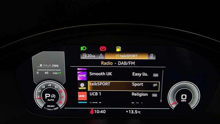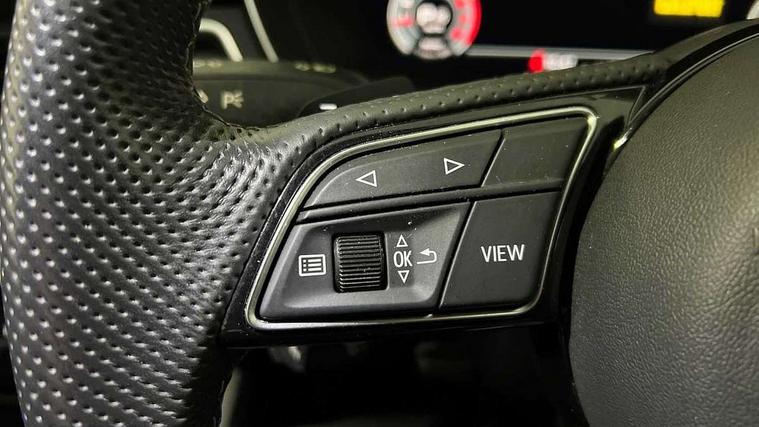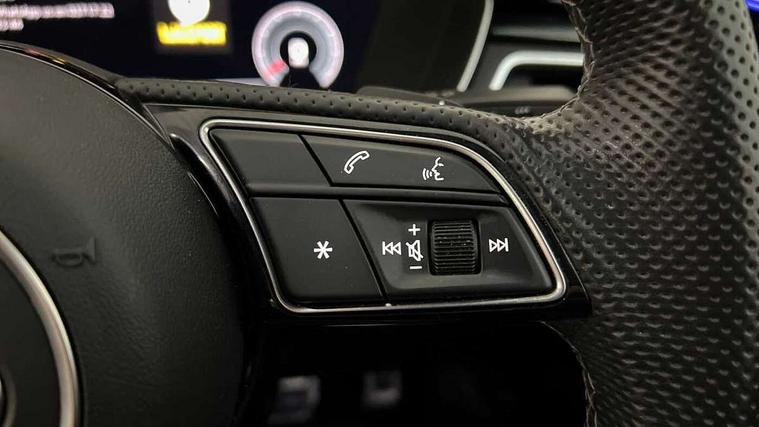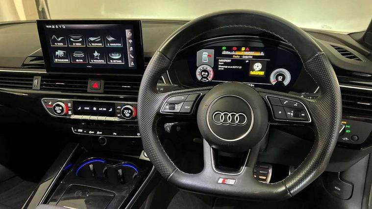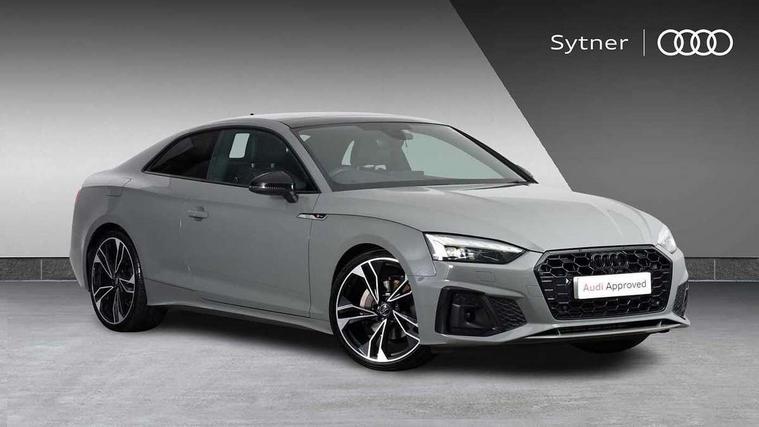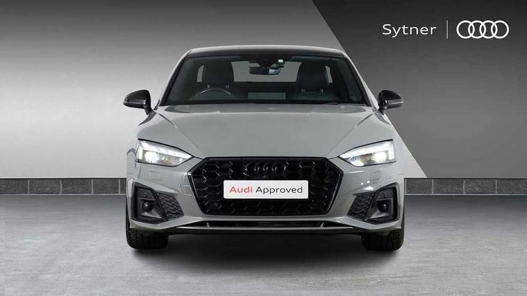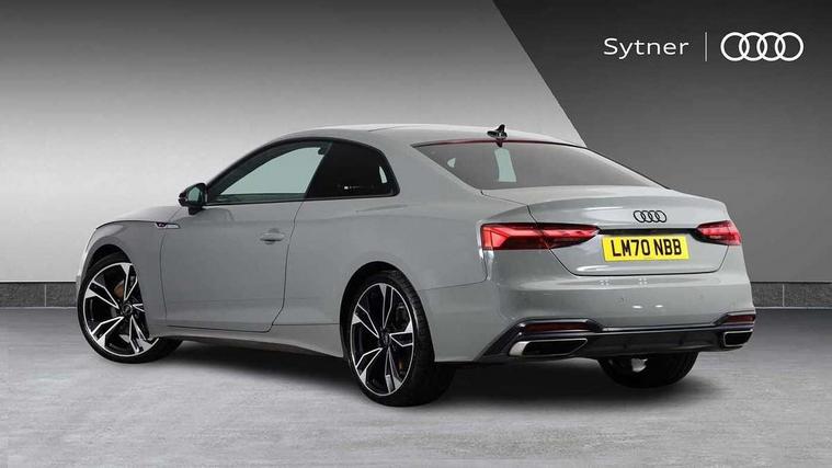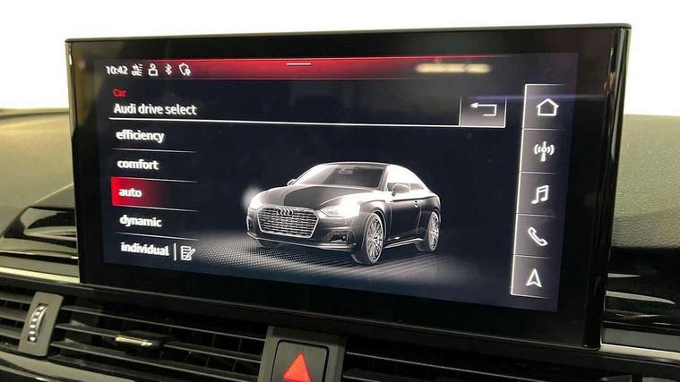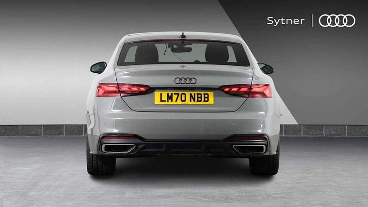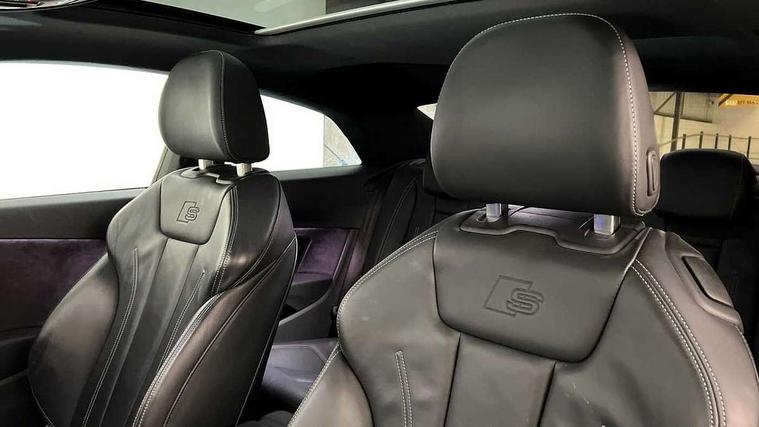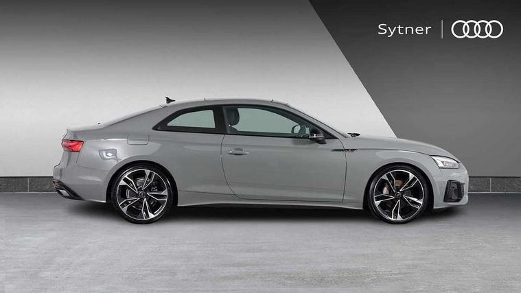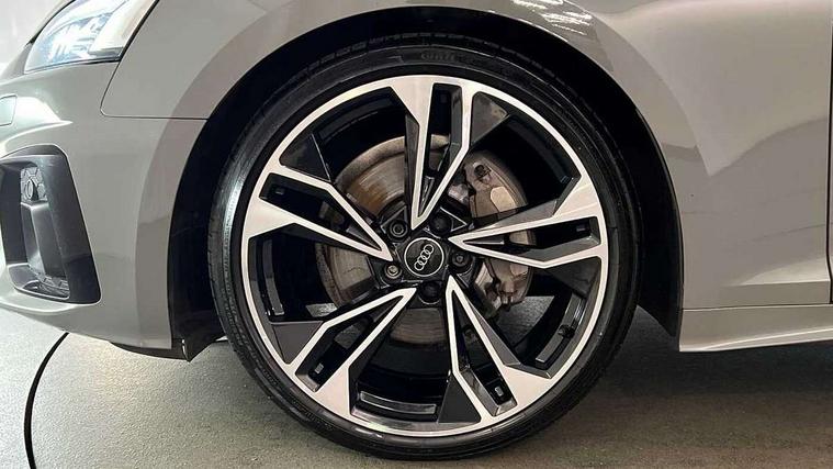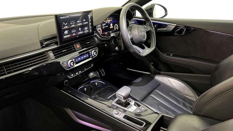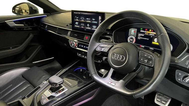 Audi connect safety and service (e-call), Audi drive select (Auto, Comfort, Dynamic, Efficiency and Individual), Audi parking system plus with front and rear sensors, Audi phone box with wireless charging, Audi smartphone interface, Audi virtual cockpit - 12.3" full colour digital instrument cluster, vehicle/engine speed, Radio/media information+Driver assistance systems, Automatic start-stop system with coasting functionality and efficiency programme, Bluetooth interface, Electric boot lid release, Electro-mechanical power steering, Email, calendar and text messages displayed via MMI, MMI nav+ with MMI touch - 10.1" high resolution MMI display, touch sensitive, 3D map, route/country info, dynamic route guide, personal route assist, Rear view camera, Service interval indicator, Voice control system, Sports suspension lowered by 23mm, 8 passive loudspeakers, CD player, DAB digital radio reception, Two additional USB ports for rear passenger in rear centre console, Two SDXC card slots, Auto dimming rear view mirror, Black door mirror housings, Body colour bumpers, Body colour door handles, Body colour front spoiler lip, Body colour side sill trim, Electric adjustable heated door mirrors, Electric folding door mirrors, Electric front windows, Front fog lights, Honeycomb structure radiator grille in grained matt black, Matrix LED headlights with Audi laser light, dynamic light sequencing and dynamic indicator, Matt aluminium silver tailpipe trim, Privacy glass, Rain and light sensors, Rear diffuser in matt titanium black with trim strip in matt aluminium silver, Side air inlets in grained matt black with matt aluminium silver inlay, Sport front and rear bumpers with side skirts, Towbar preparation, Windscreen with acoustic glazing, 4 way electric lumbar support for driver and front passenger, 40/20/40 split folding 2 seater rear seat bench with rear centre armrest, Adjustable steering column, Black cloth headlining, Black perforated leather gearknob, Contrast stitching on seats, steering wheel and gear lever gaiter, Deluxe 3 zone electronic climate control, Electrically adjustable front seats, Fine Nappa leather upholstery with front sports seats S embossed logo, Front centre armrest, Front head restraints, Front/rear floor mats, Heated front seats, Illuminated door sill trim with S logo, ISOFIX child seat mounting and top tether, Luggage compartment mat, Rear headrests, Stainless steel pedals, Sunvisors with vanity mirrors, Tool kit, Black styling pack - A5 Coupe/Sportback, LED interior light pack - A5/RS5, 2 x 3-point rear seat belts, 6 airbags - Driver, front passenger, curtain and side airbags, Electromechanical parking brake, Electronic Stabilisation Control (ESC) including ABS, ASR and EDL, Front passenger airbag deactivation, Height adjustable front seatbelts, Hill hold assist, Multi collision brake assist, Pop-up bonnet for pedestrian protection, Seatbelt monitoring, Tyre pressure warning, Variable restraint system, Warning triangle and first aid kit, Anti theft alarm system, Anti theft wheel bolts, Immobiliser, Keyless Go, Remote central locking, Piano black finish inlay, 20" 5 twin spoke polygon design alloy wheels in gloss anthracite black and gloss turned finish, Tyre repair kit,