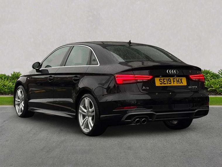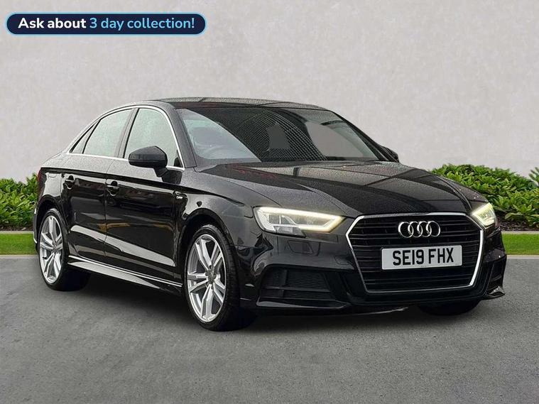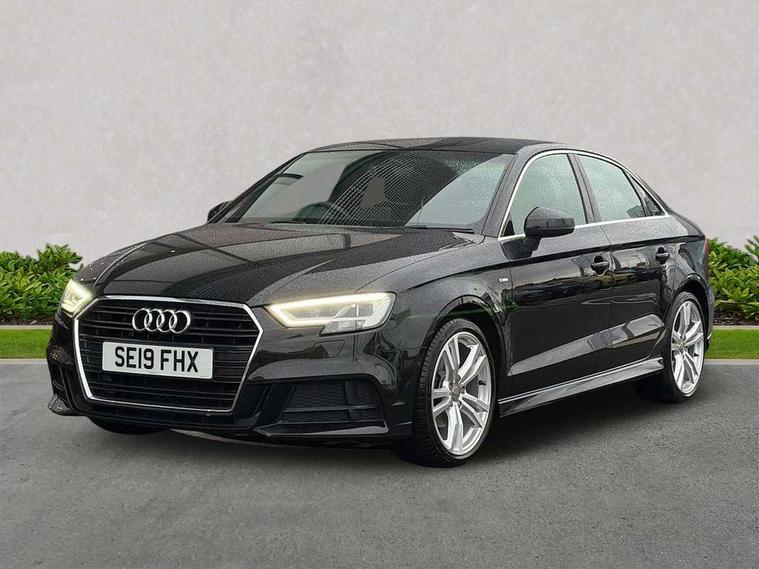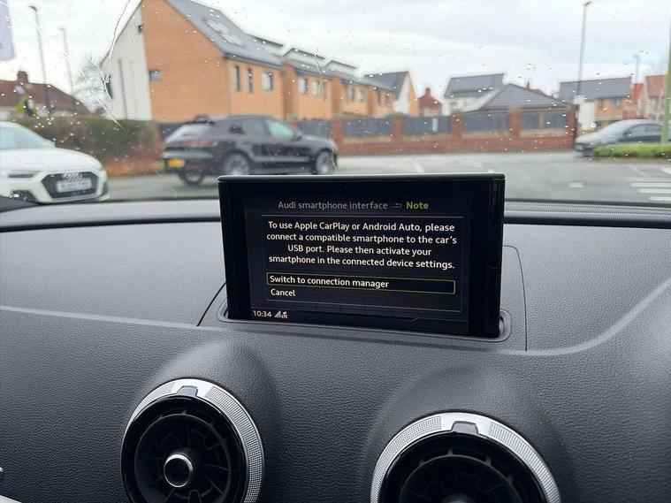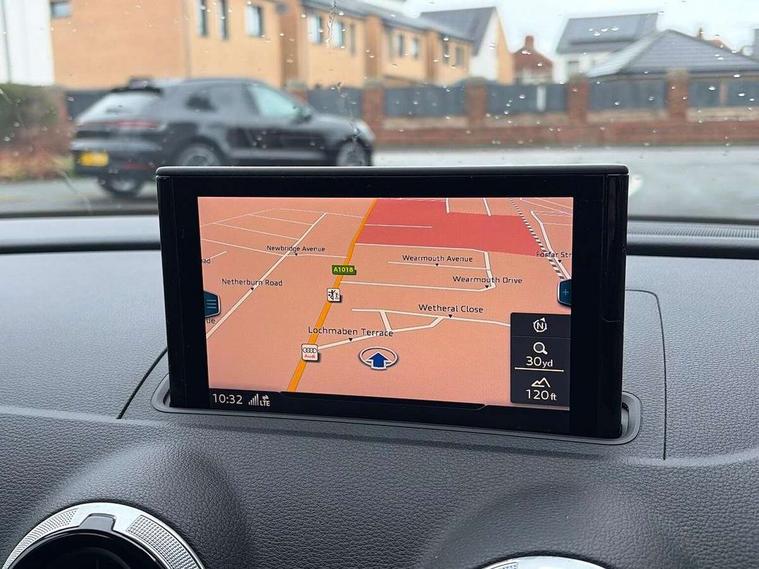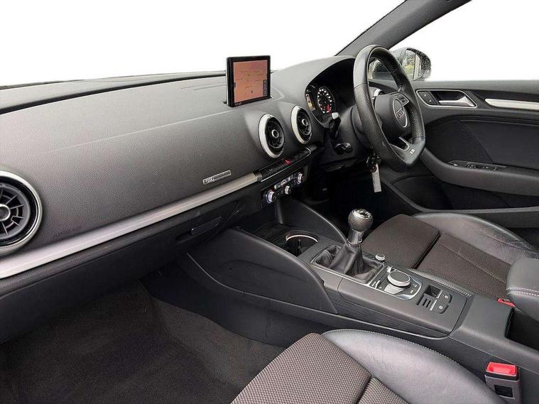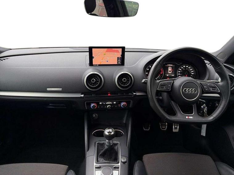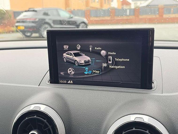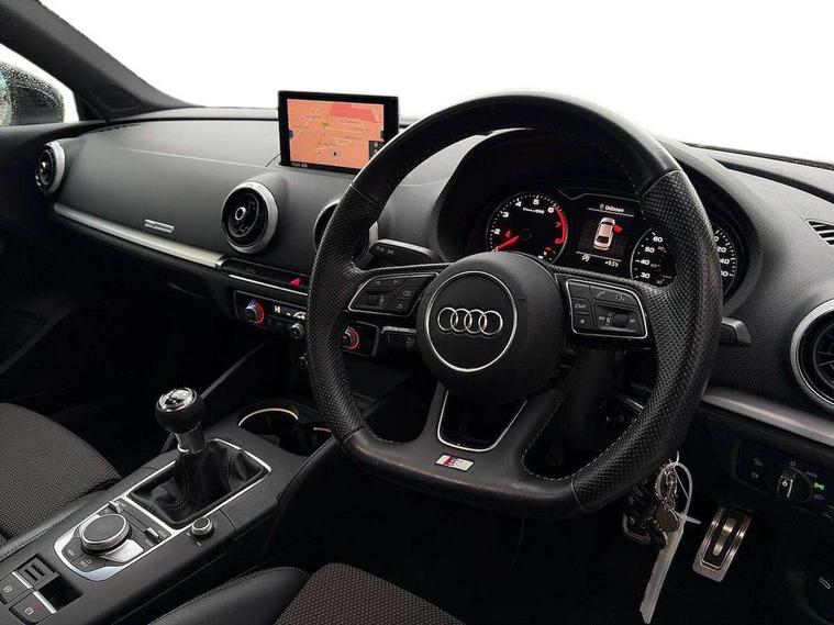Audi connect, Audi drive select, Audi smartphone interface, Automatic start/stop system, Bluetooth interface, Colour driver's information system display, Cruise control + speed limiter, Electro-mechanical PAS, SD card based MMI navigation, Service indicator, Voice control system, Sports suspension, 2 USB interfaces and Aux-In jack, CD player, DAB Digital radio, MMI radio plus with 7" colour MMI screen and MMI controller, Two SDXC card slots, Aluminium side window trim, Auto dimming rear view mirror, Automatic lights and wipers, Body colour door mirrors, Dual branch chrome-plated exhaust tailpipe, Electrically adjustable and heated door mirrors with integrated LED side indicators, Front and rear electric windows, Heated rear window, Heated windscreen washer jets, Model and engine designation badges at rear, S Line badges on the front wings, S Line body styling with high gloss dark chrome radiator grille and rear diffuser in platinum grey, S Line body with front and rear bumpers and side skirts, S Line roof edge spoiler, Single chrome exhaust tailpipe, 3 adjustable rear headrests, 3 spoke flat bottomed multi-function leather sport steering wheel, 4 lashing points to secure luggage, 60/40 split folding rear seat, Adjustable front centre armrest, Black cloth headlining, Driver/passenger sunvisors, Dual zone electronic climate control, Front and rear interior lights with delay, Front sport seats with S embossed logo, Front/rear floor mats, Height/depth adjustable steering column, Illuminated door sill trims with S logo, Illuminated glovebox, Illuminated luggage compartment, ISOFIX child seat mounting and Top Tether with front passenger airbag deactivation, Manual height adjustable front seats, Stainless steel pedals, Storage compartments in doors side trims, centre console and under front drivers seat, LED interior light pack - A3/RS3, Non smoking pack - A3, Storage and luggage pack - A3/RS3, 3 point seatbelts on all seats, ABS/EBD, Active front headrests, Airbags - front driver/passenger, front & rear side, curtain, drivers knee, ASR, EDL, Electromechanical parking brake, ESC - Electronic Stability Control + traction control, Hill hold assist, Predictive pedestrian protection, Seatbelt warning, Tyre pressure warning, Warning triangle and first aid kit, Anti theft alarm, Anti-theft wheel bolts, Immobiliser, Remote control central locking, Aluminium air vent surrounds, Aluminium trim elements, Matt brushed aluminium inlays, Tool kit, Tyre repair kit,